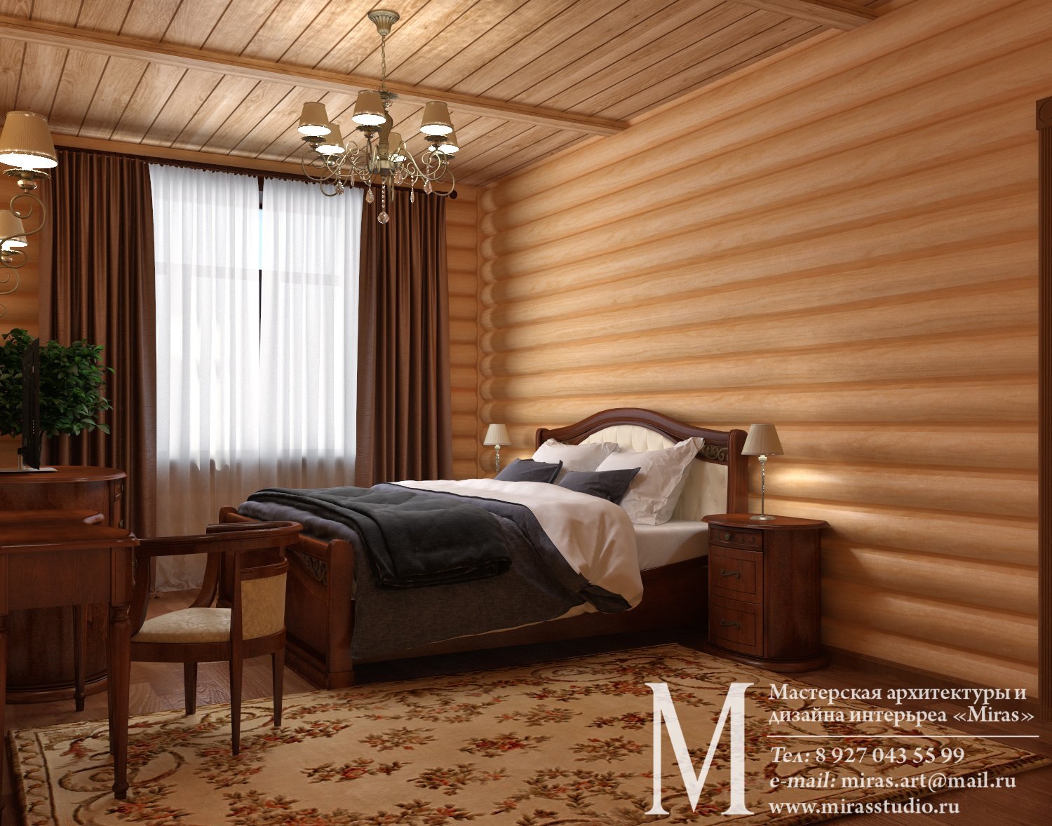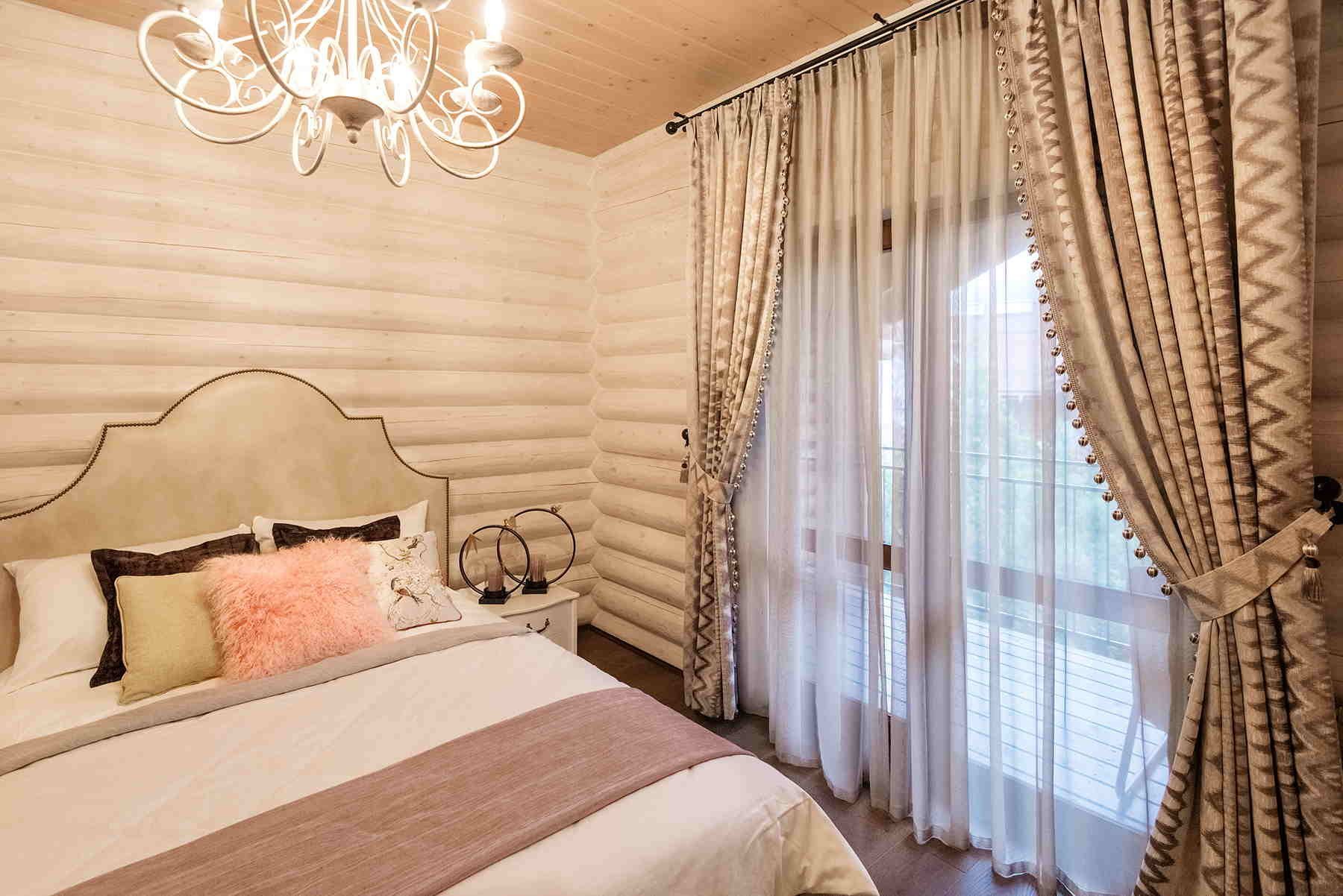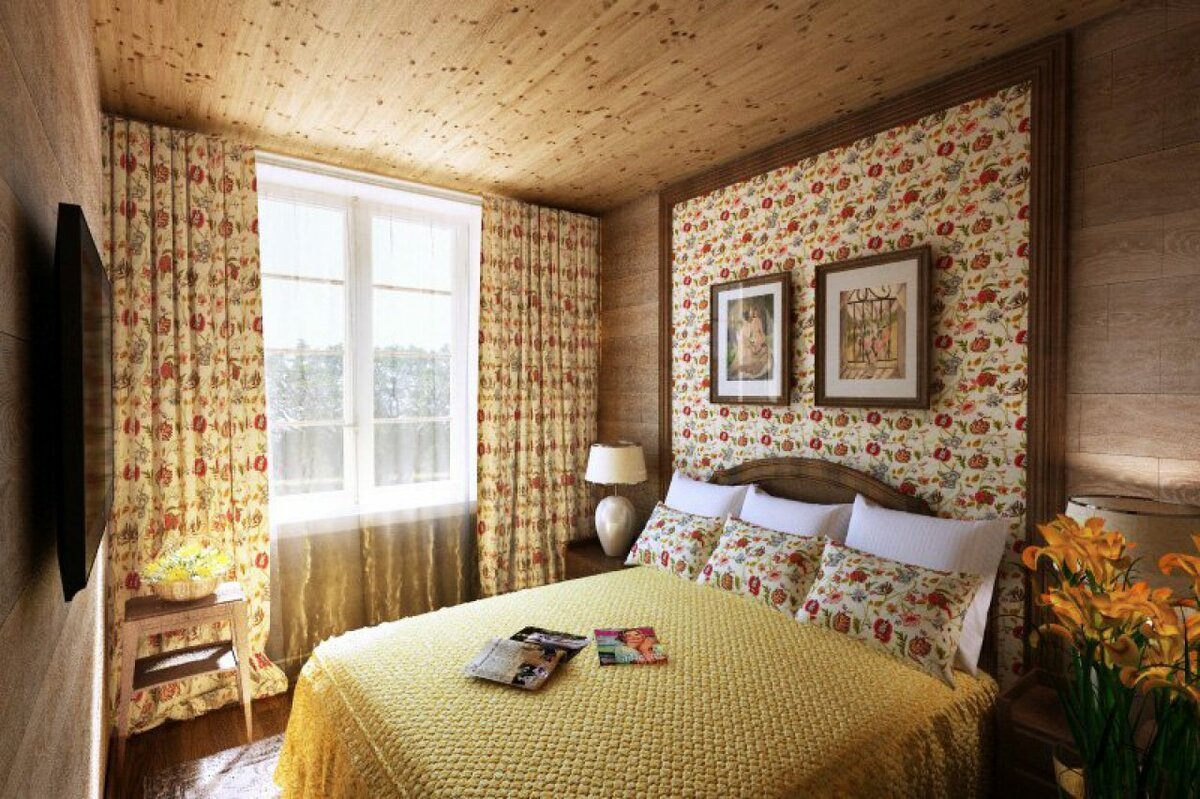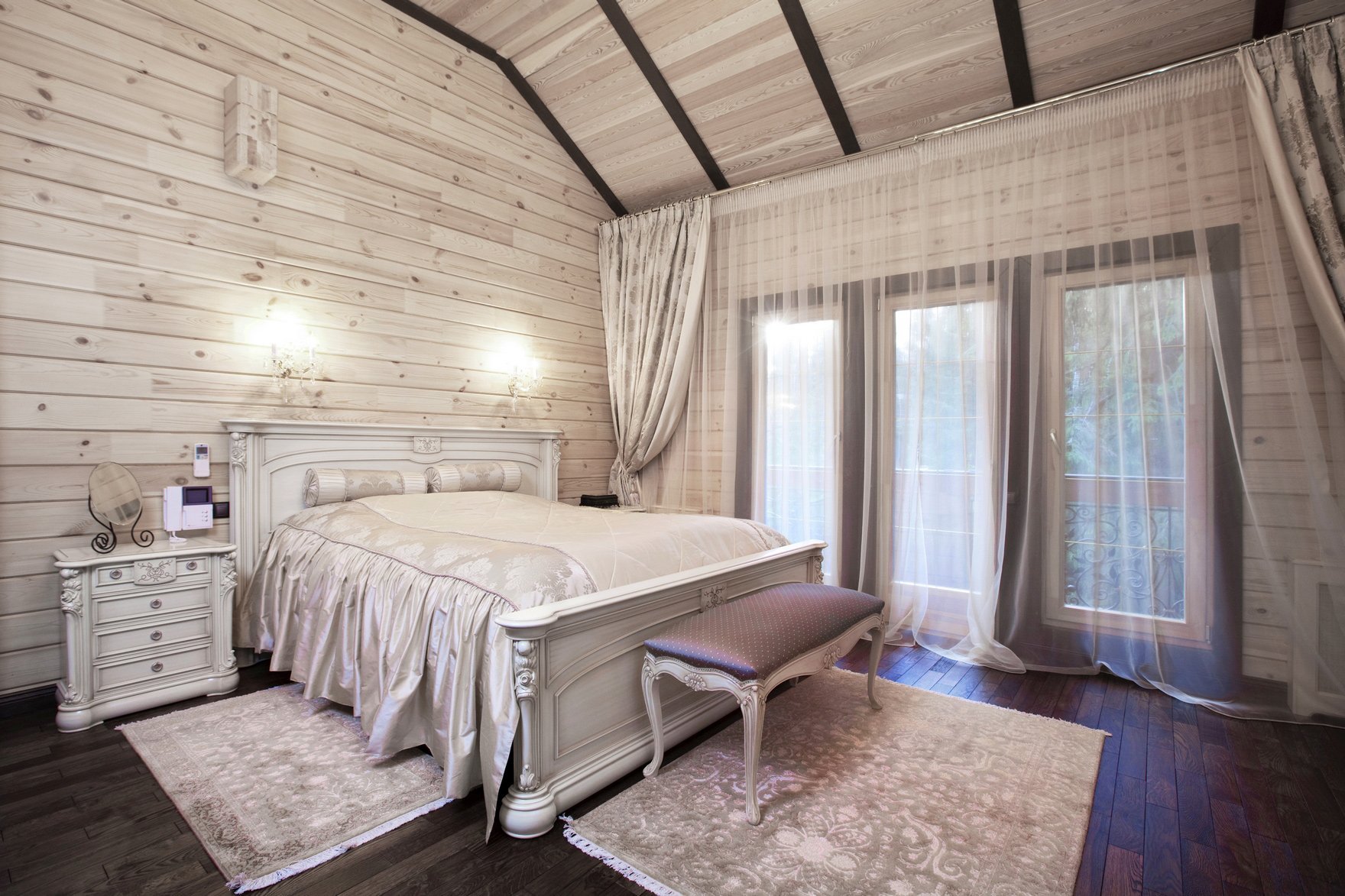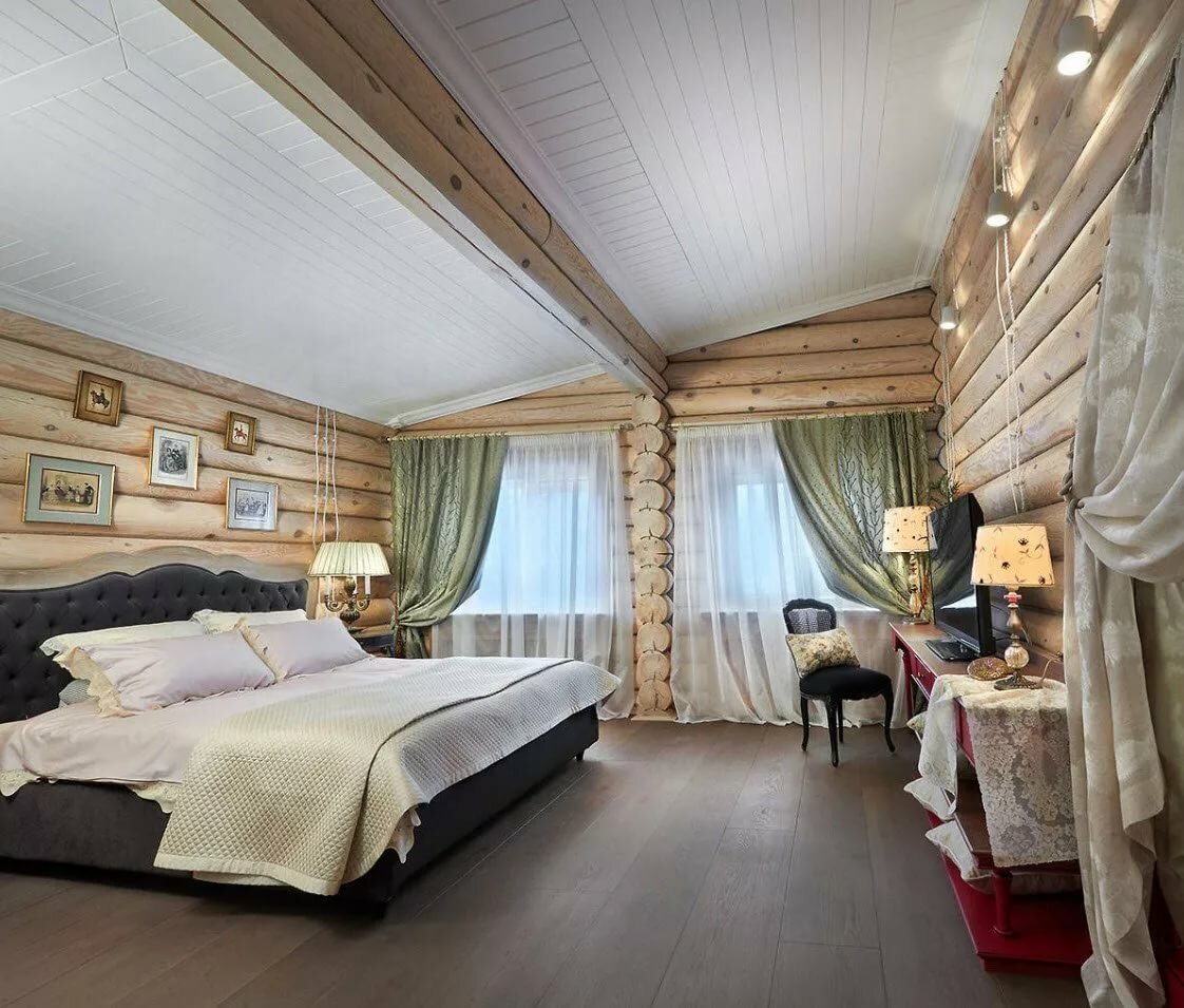 Интерьер спальни в бревенчатом доме в стиле Прованс