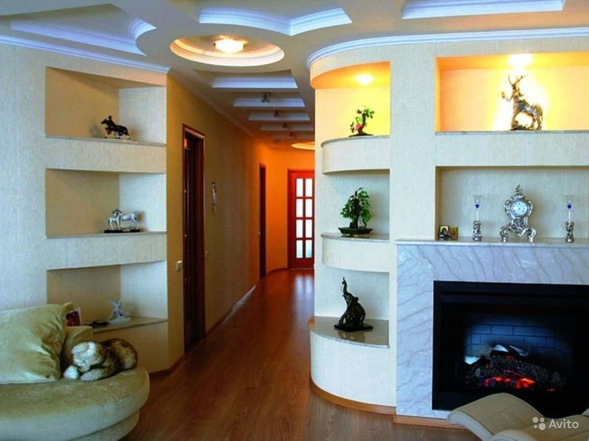 Гипсокартонные конструкции в гостиной на стенах