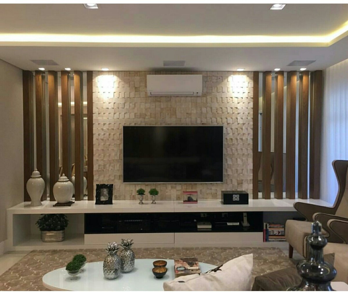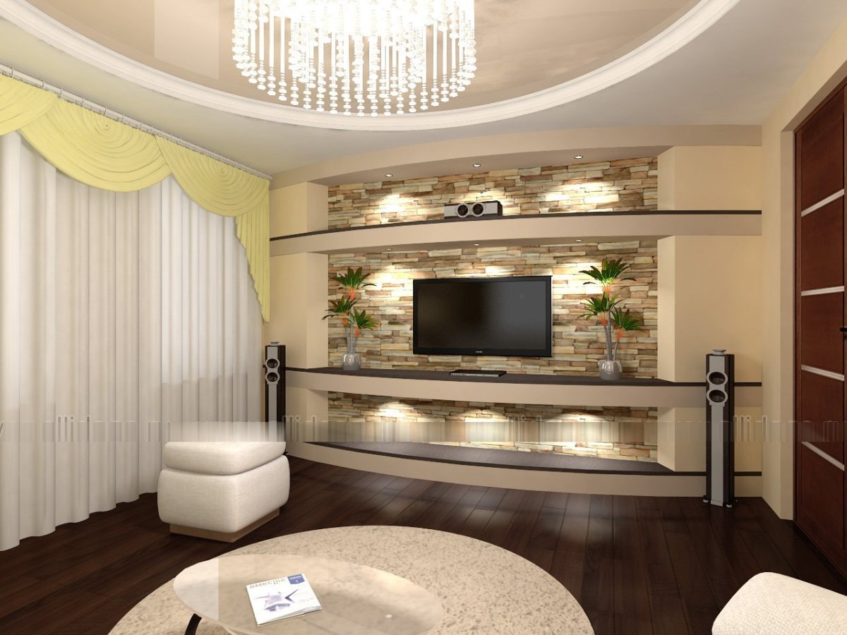 Гипсокартонные конструкции в гостиной под телевизор