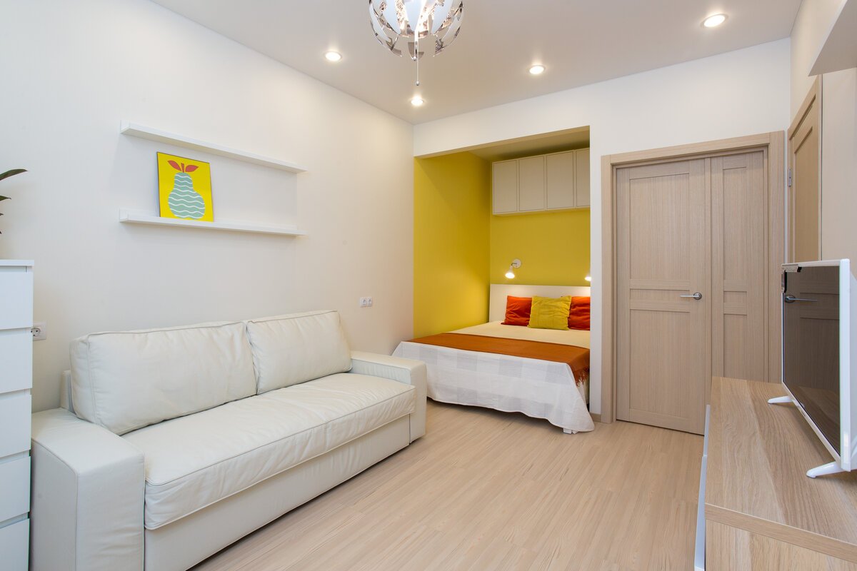 Интерьер однокомнатной квартиры с кроватью и диваном