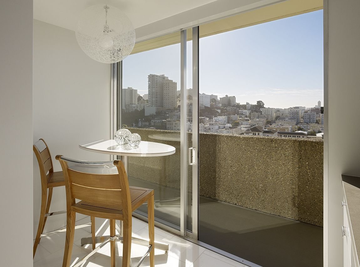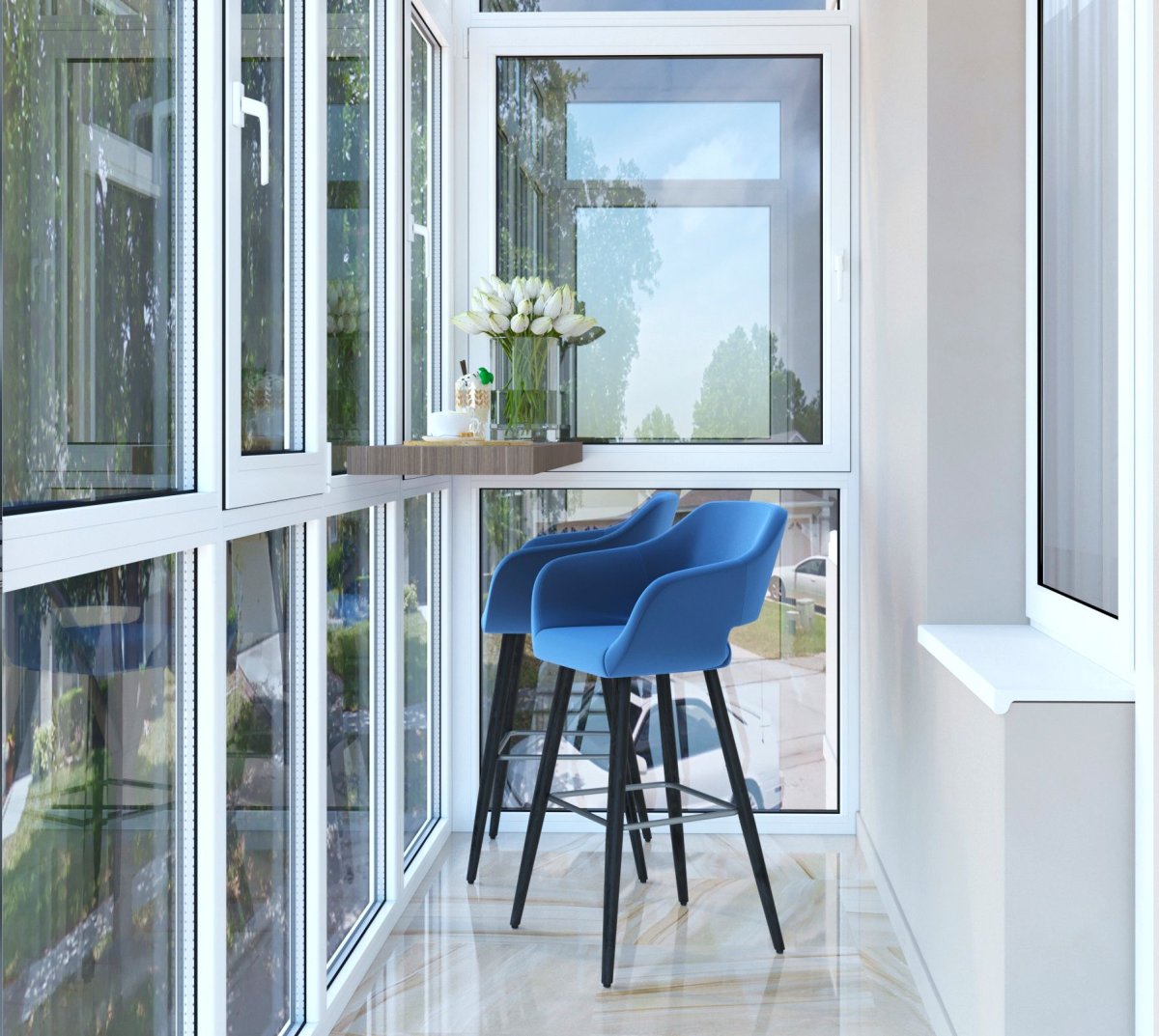 Обеденная зона на балконе с панорамными окнами