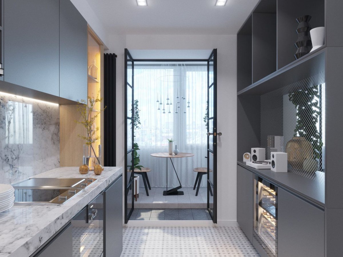 Интерьер узкой кухни с балконом
