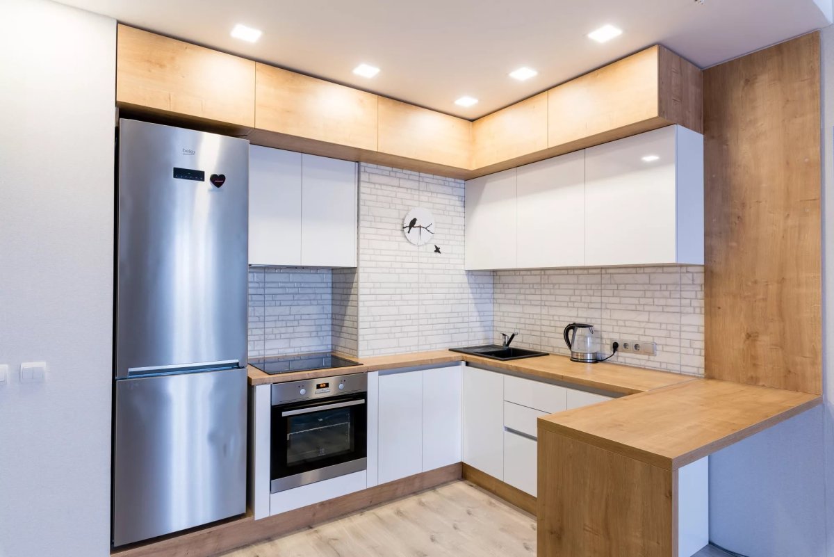 Белая угловая кухня с деревянной столешницей