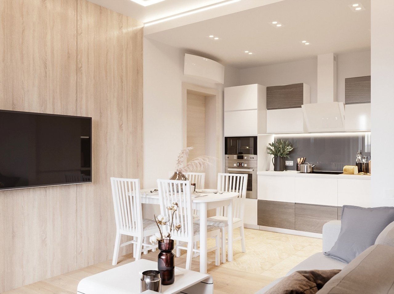 Гостиная с кухней в нюдовом стиле