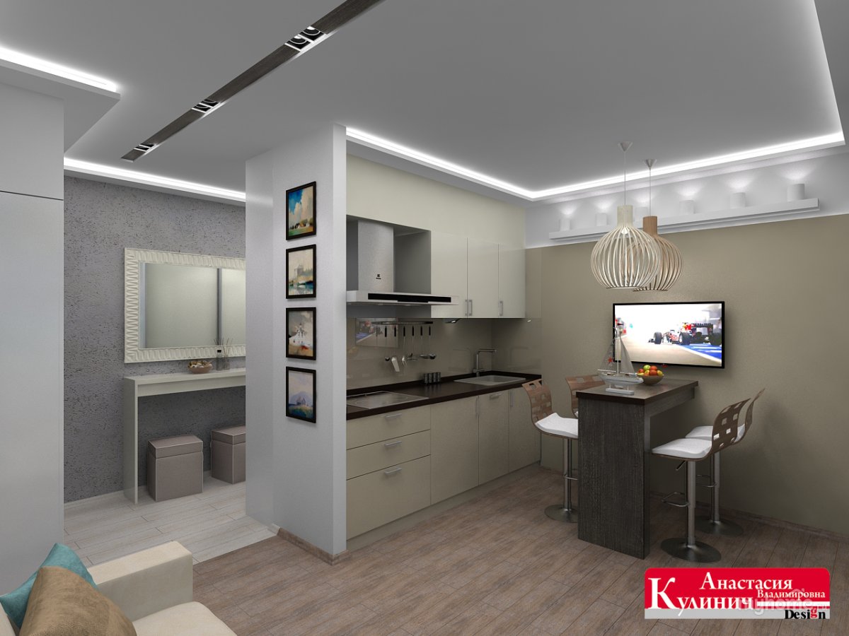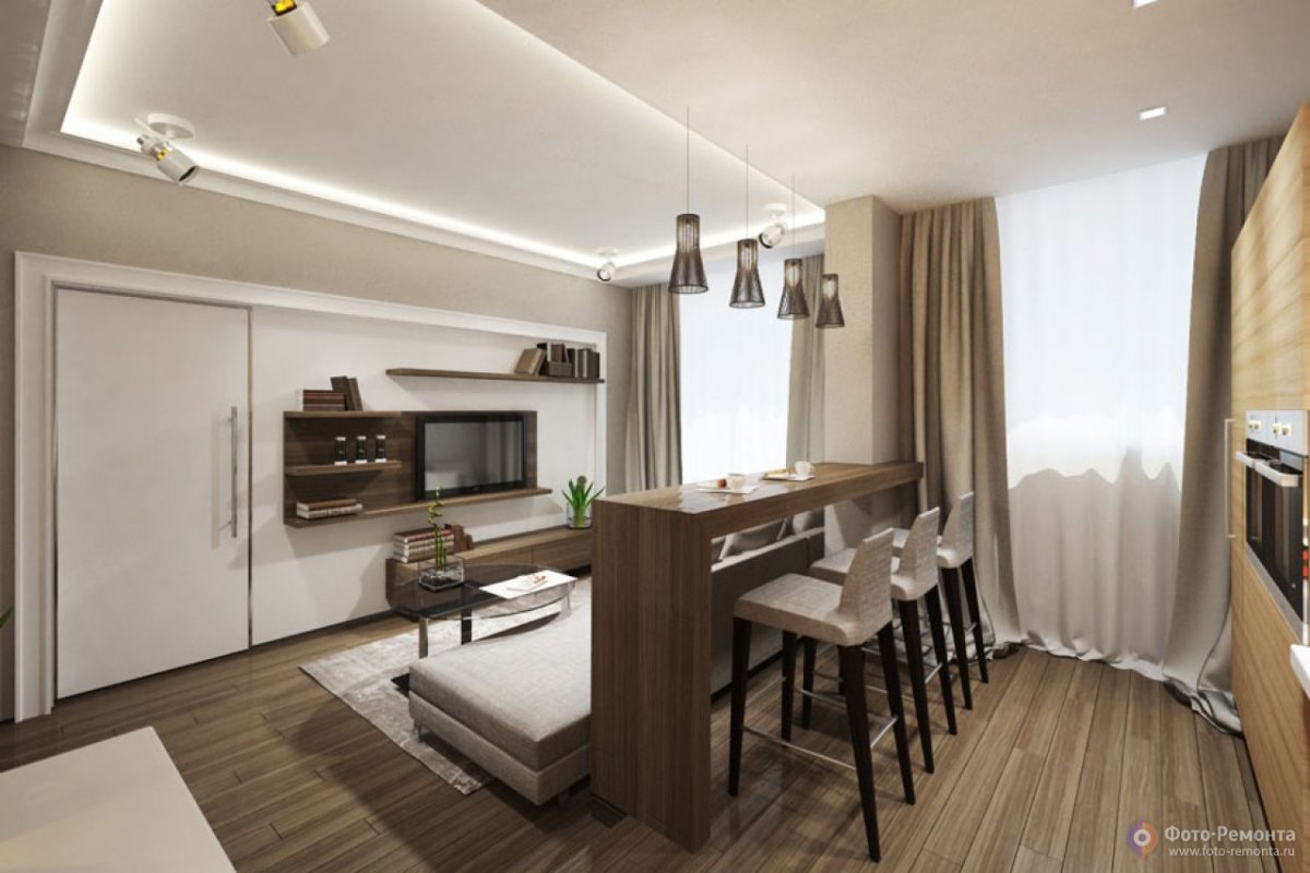 Гостиная с кухней с барной стойкой 50 кв