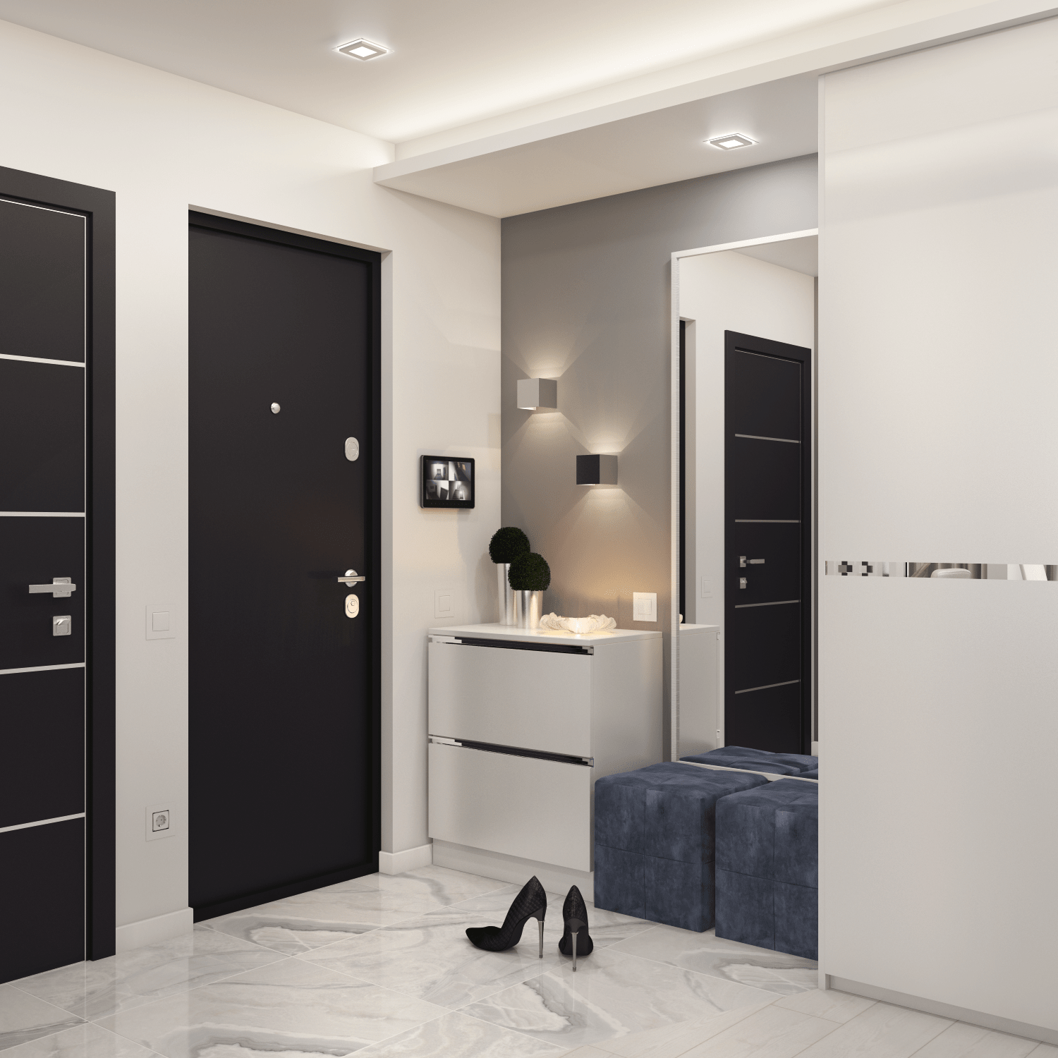 Интерьер прихожей с белыми дверями