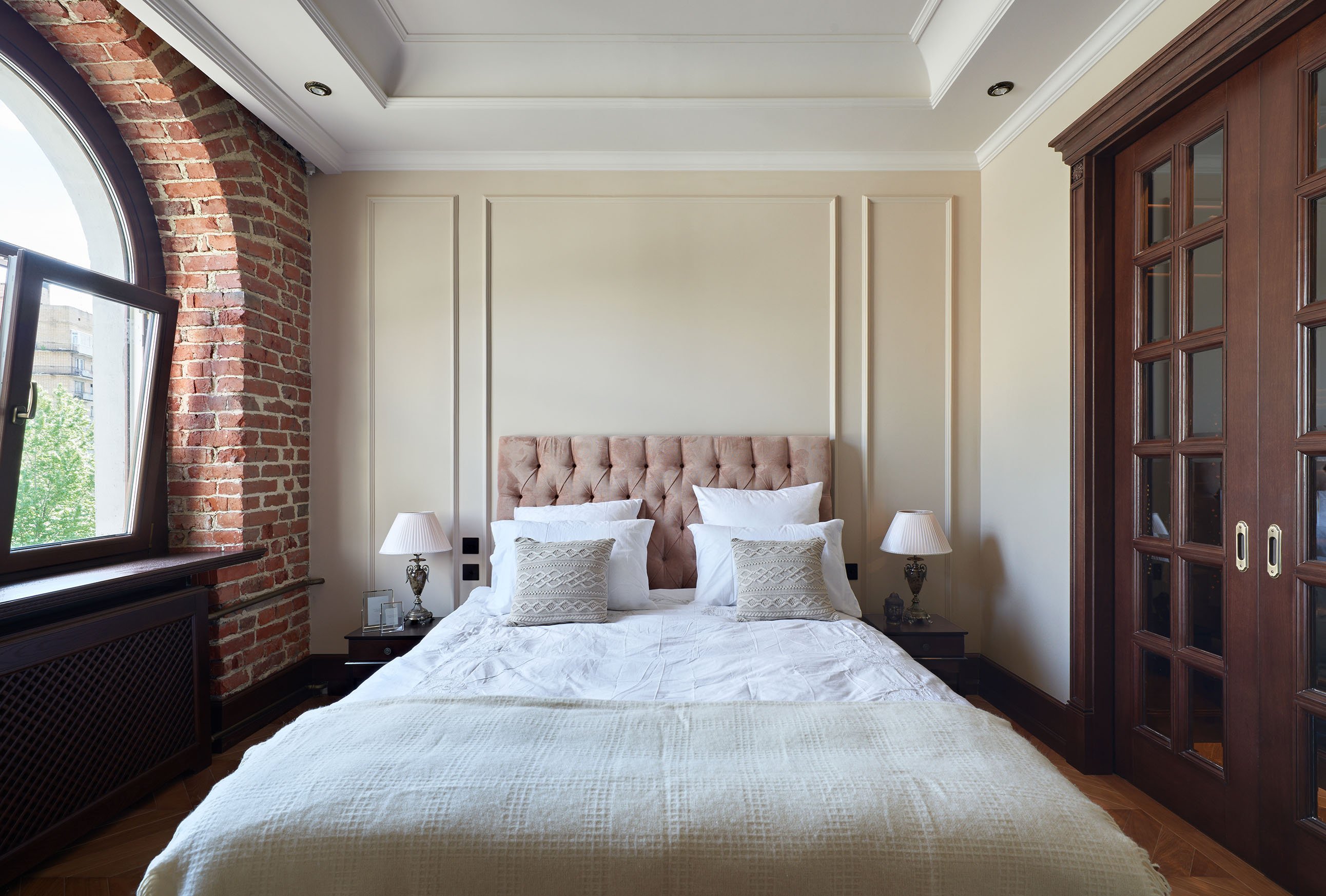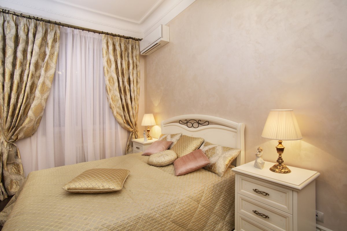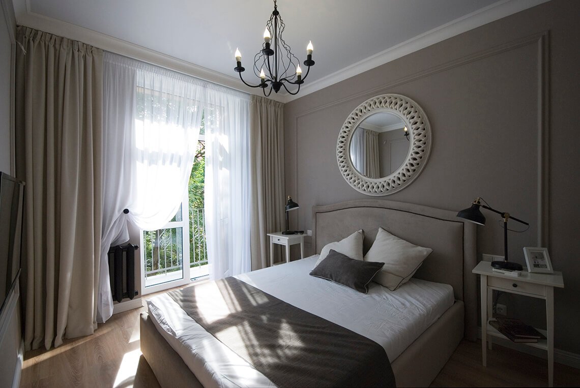 Дизайн спальни сталинки в бежевых