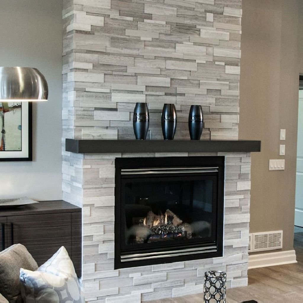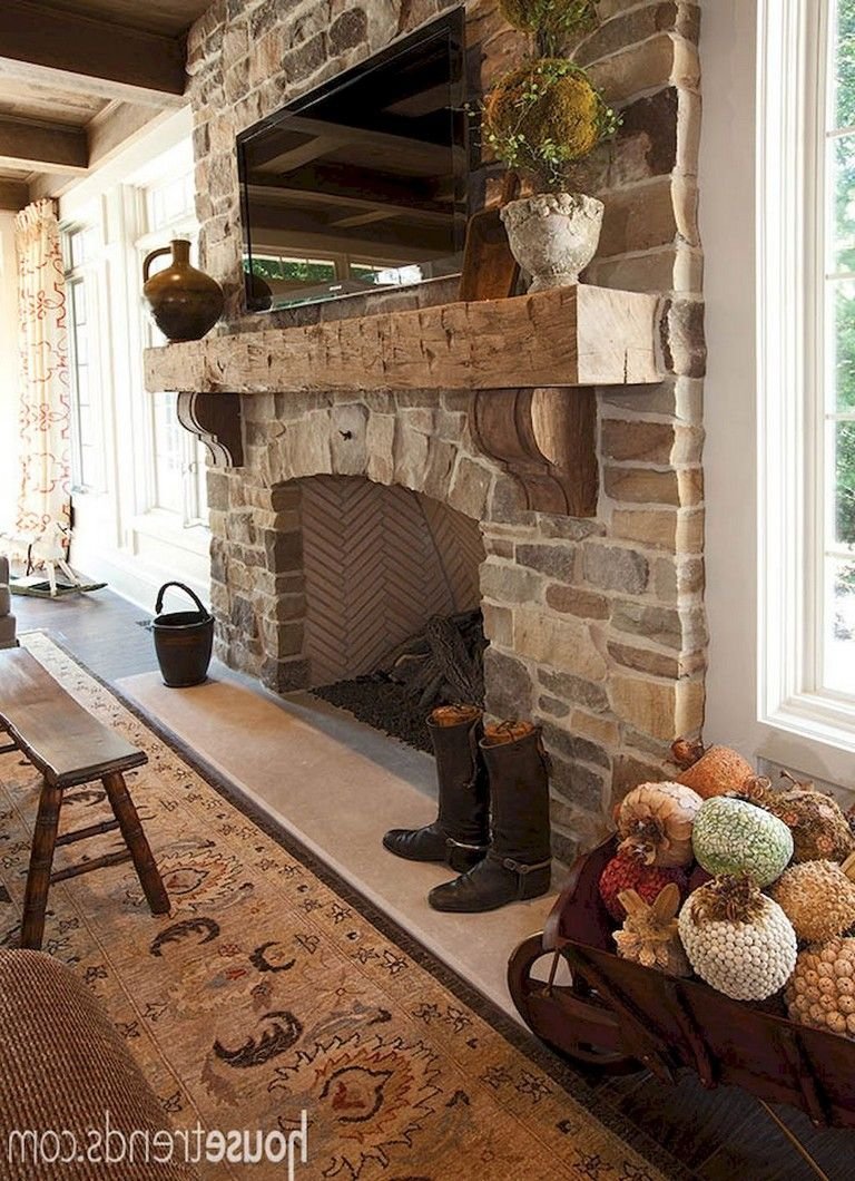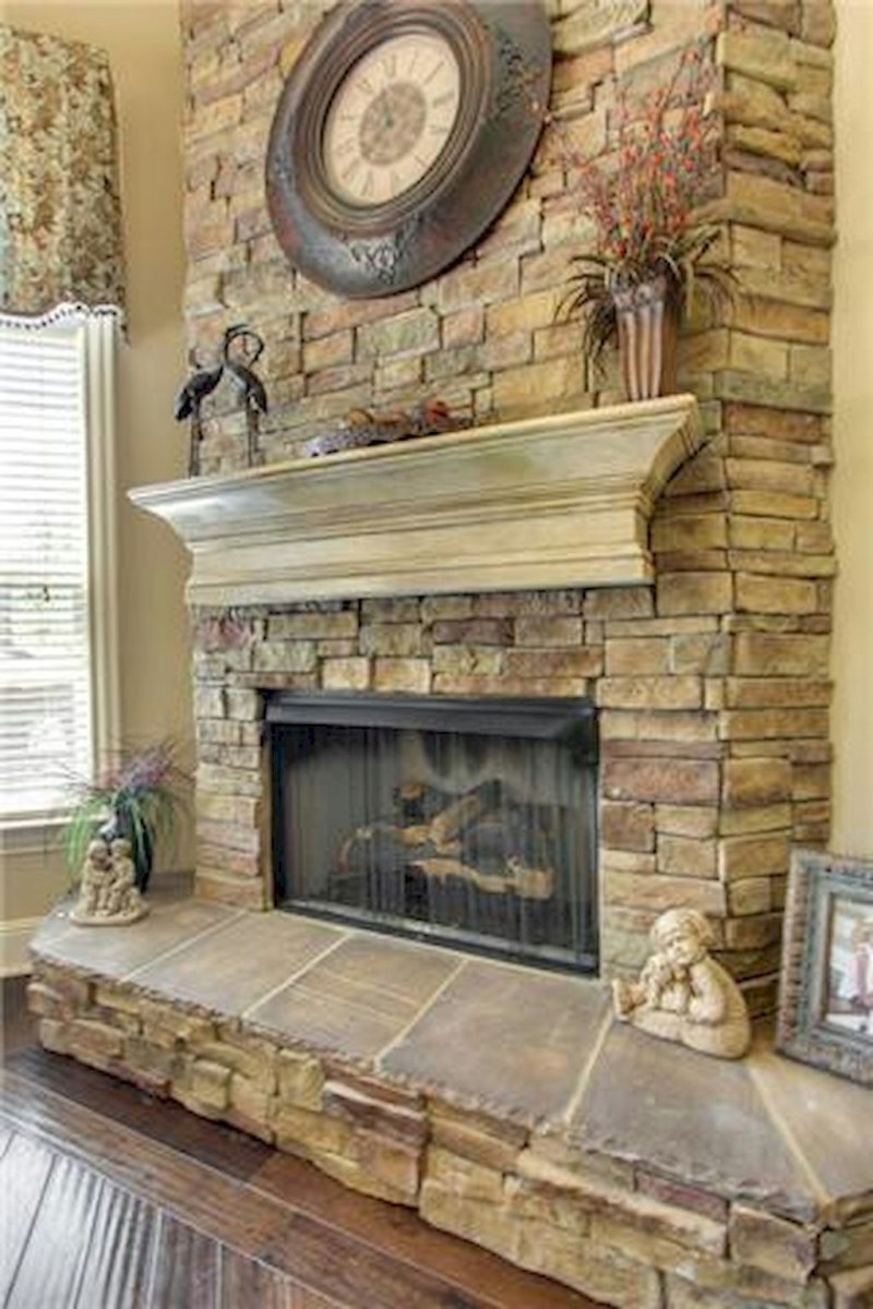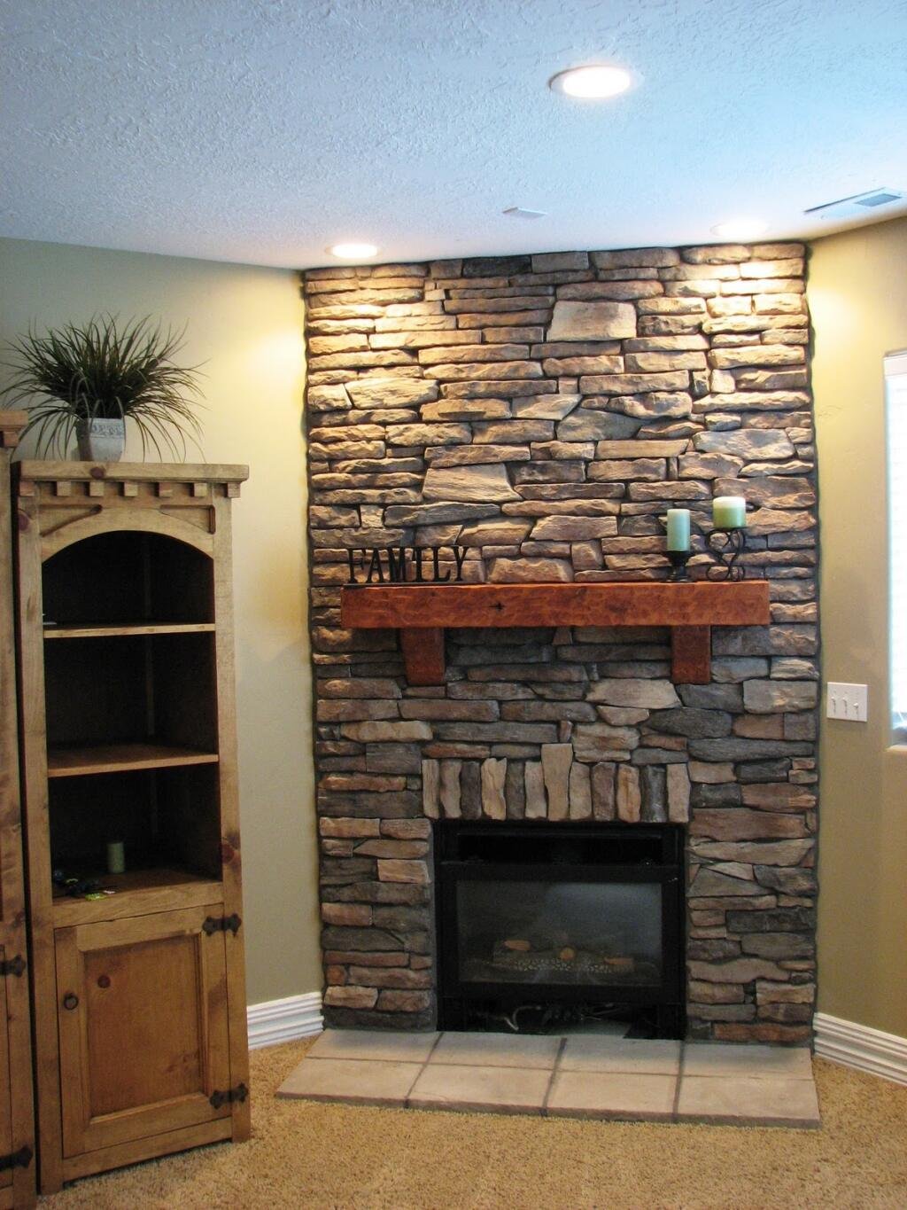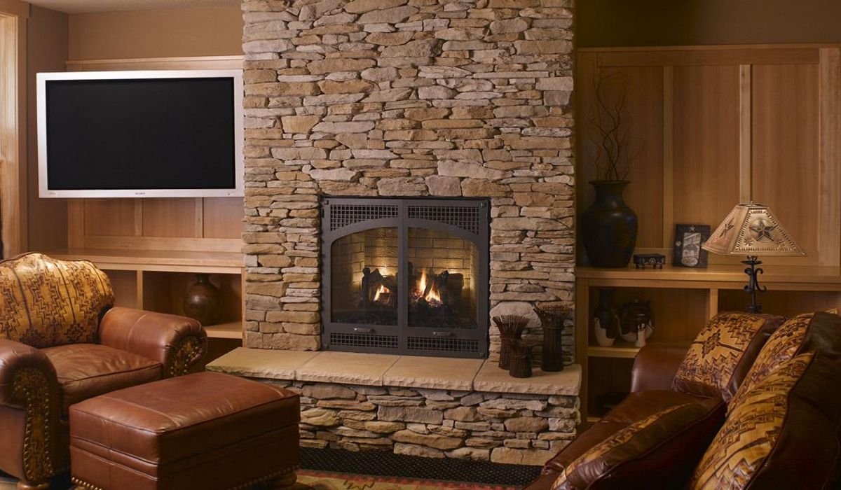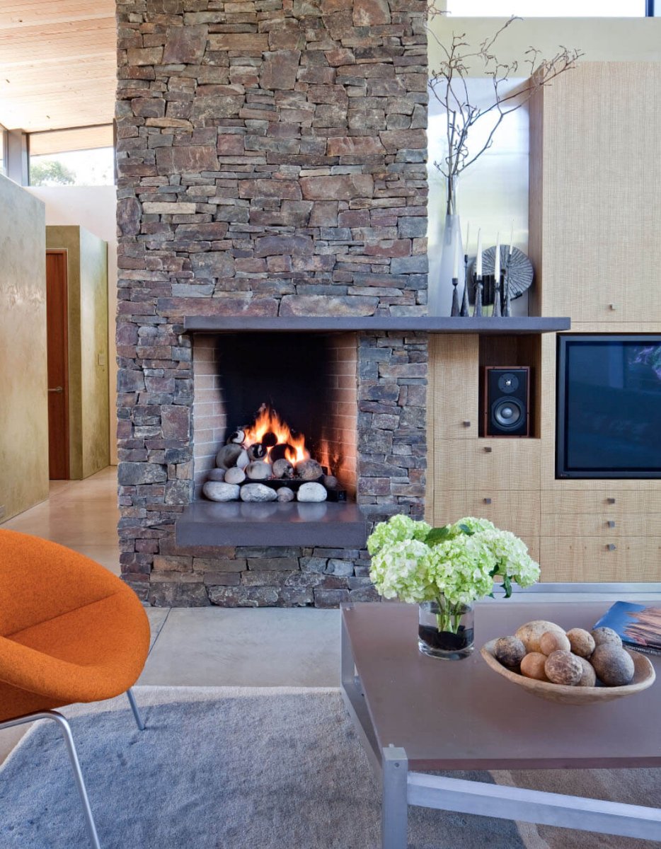 Отделка стены камнем за камином