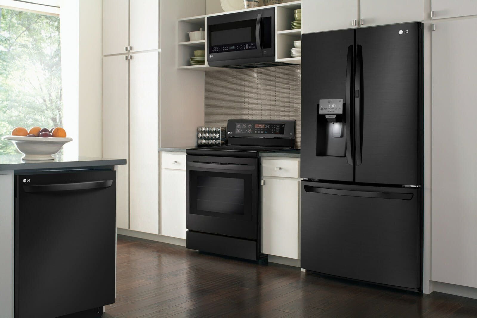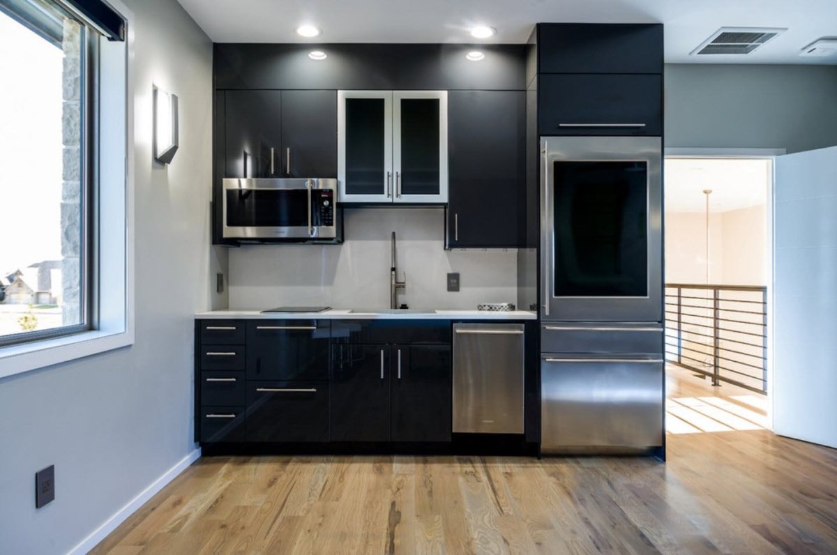 Кухня с черным холодильником