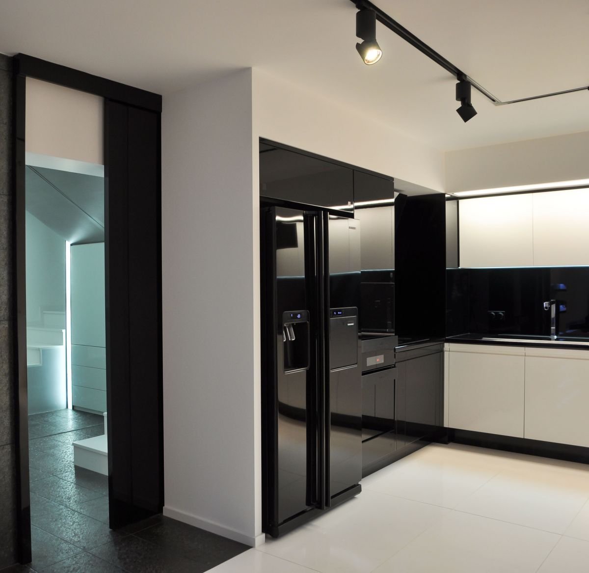 Белая кухня с черным холодильником