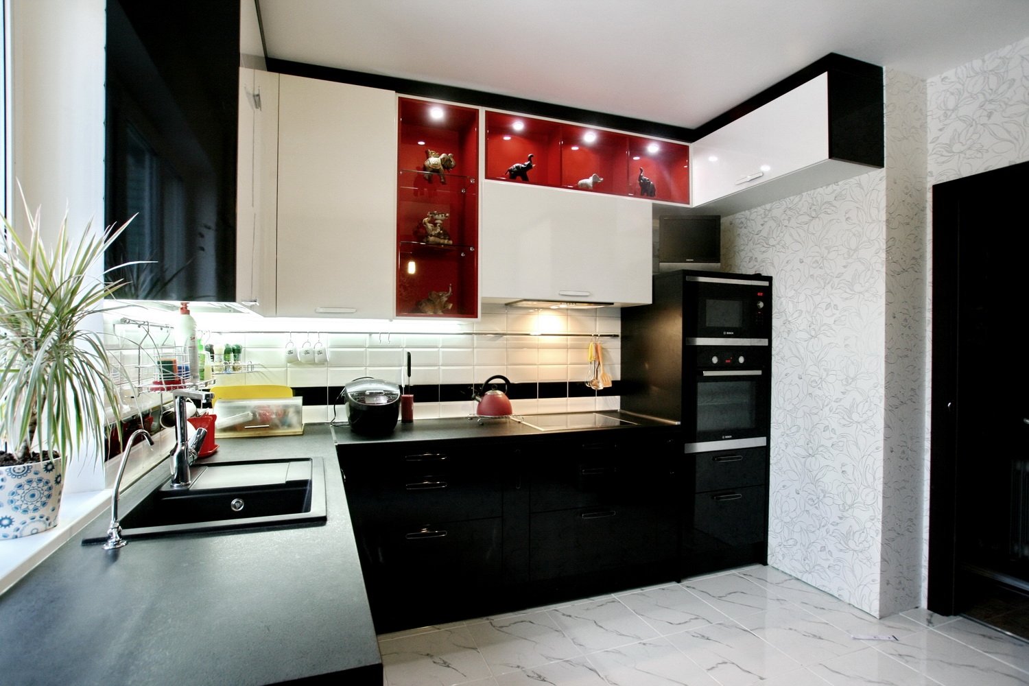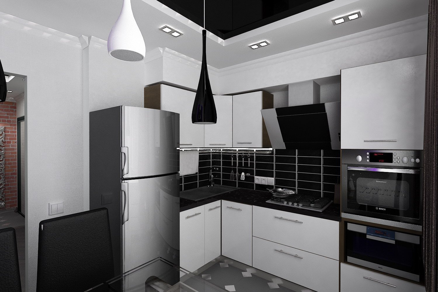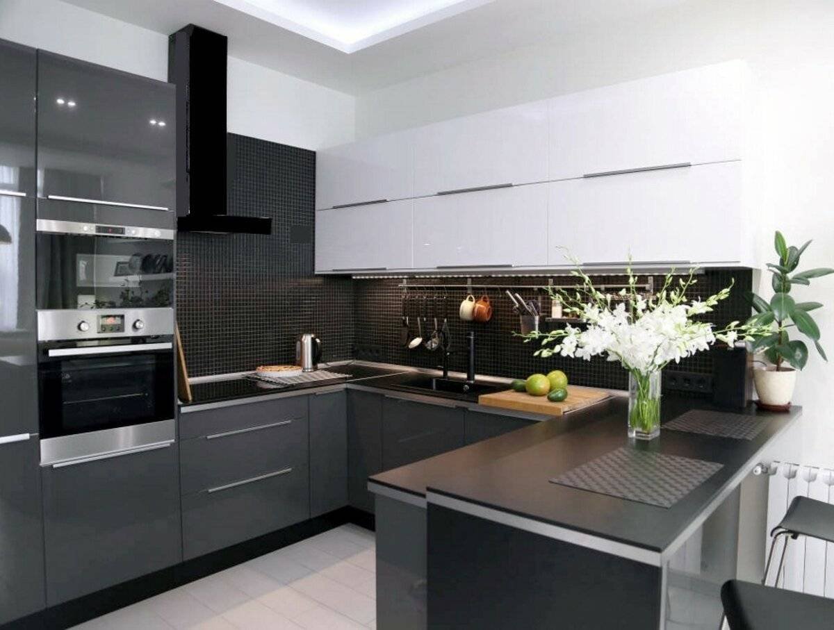 Черно белая угловая кухня
