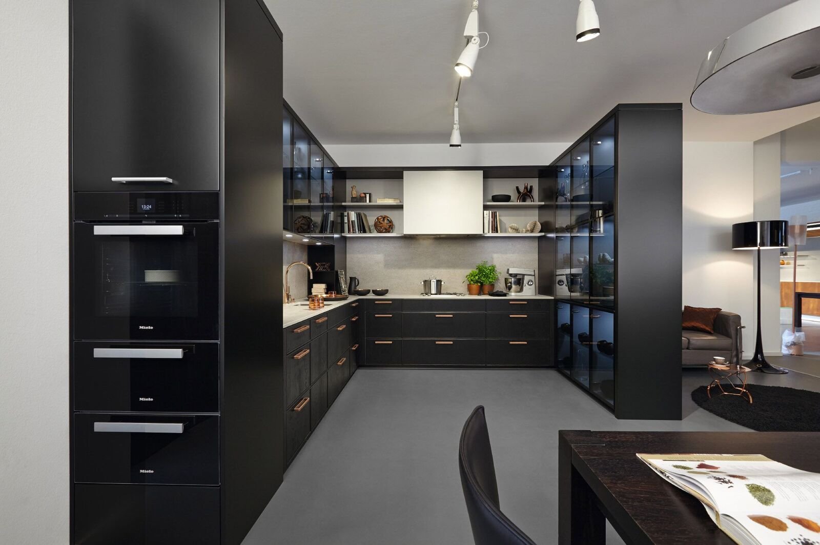 Черный кухонный гарнитур в интерьере студии