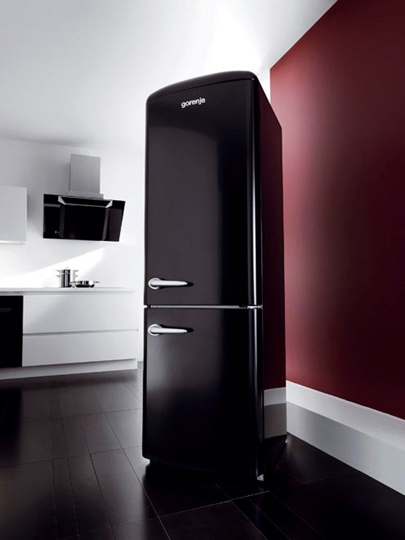 Черный холодильник в комнате