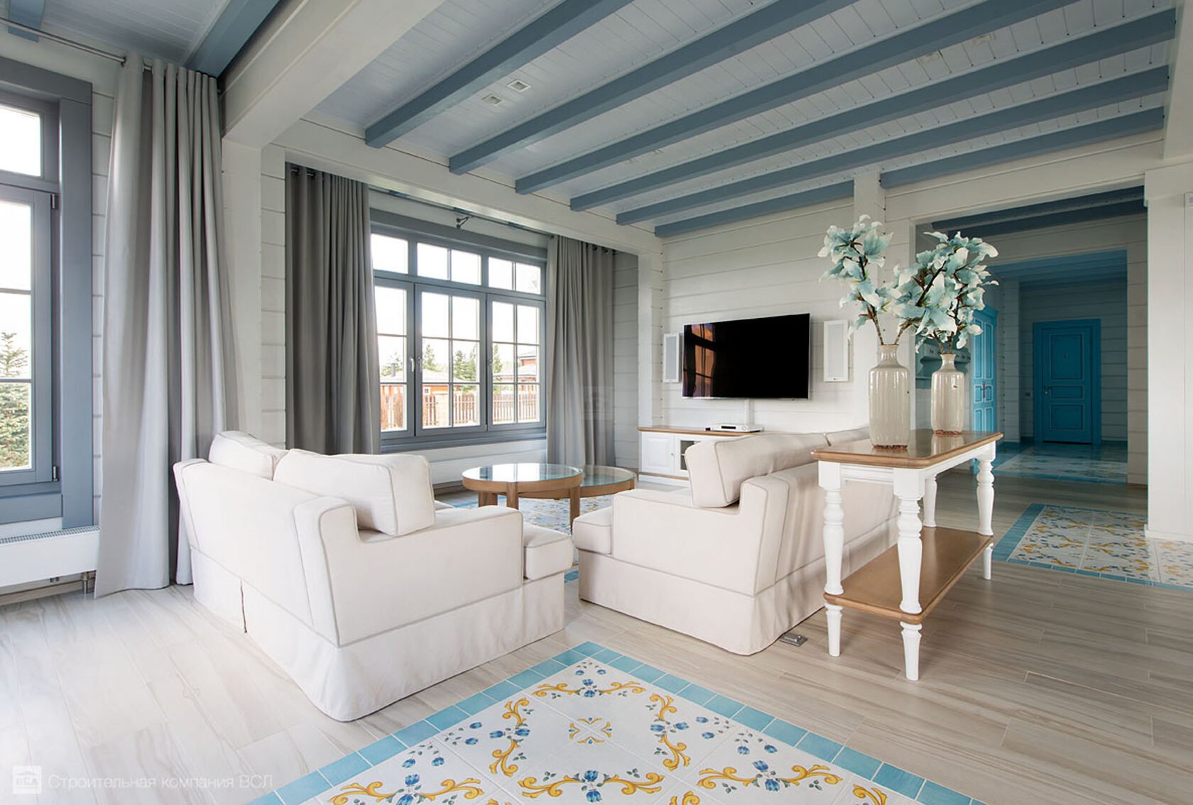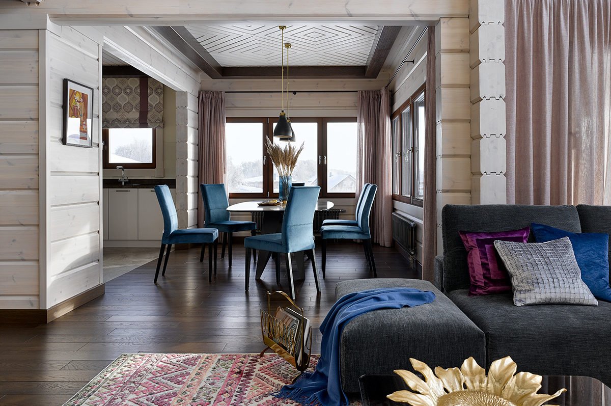 Голубая гостиная в деревянном доме