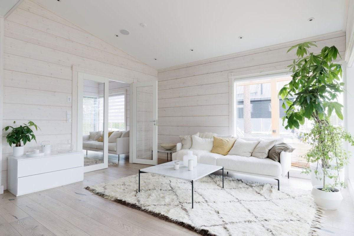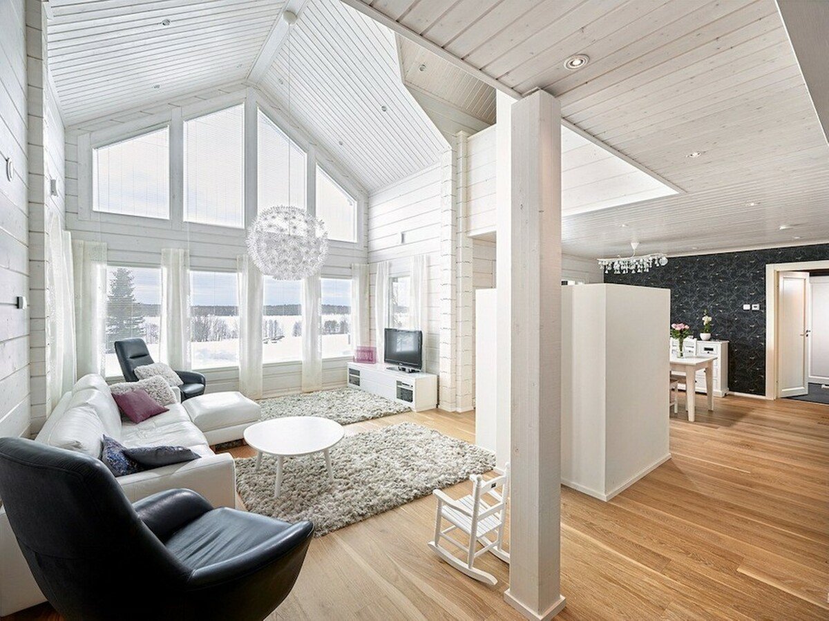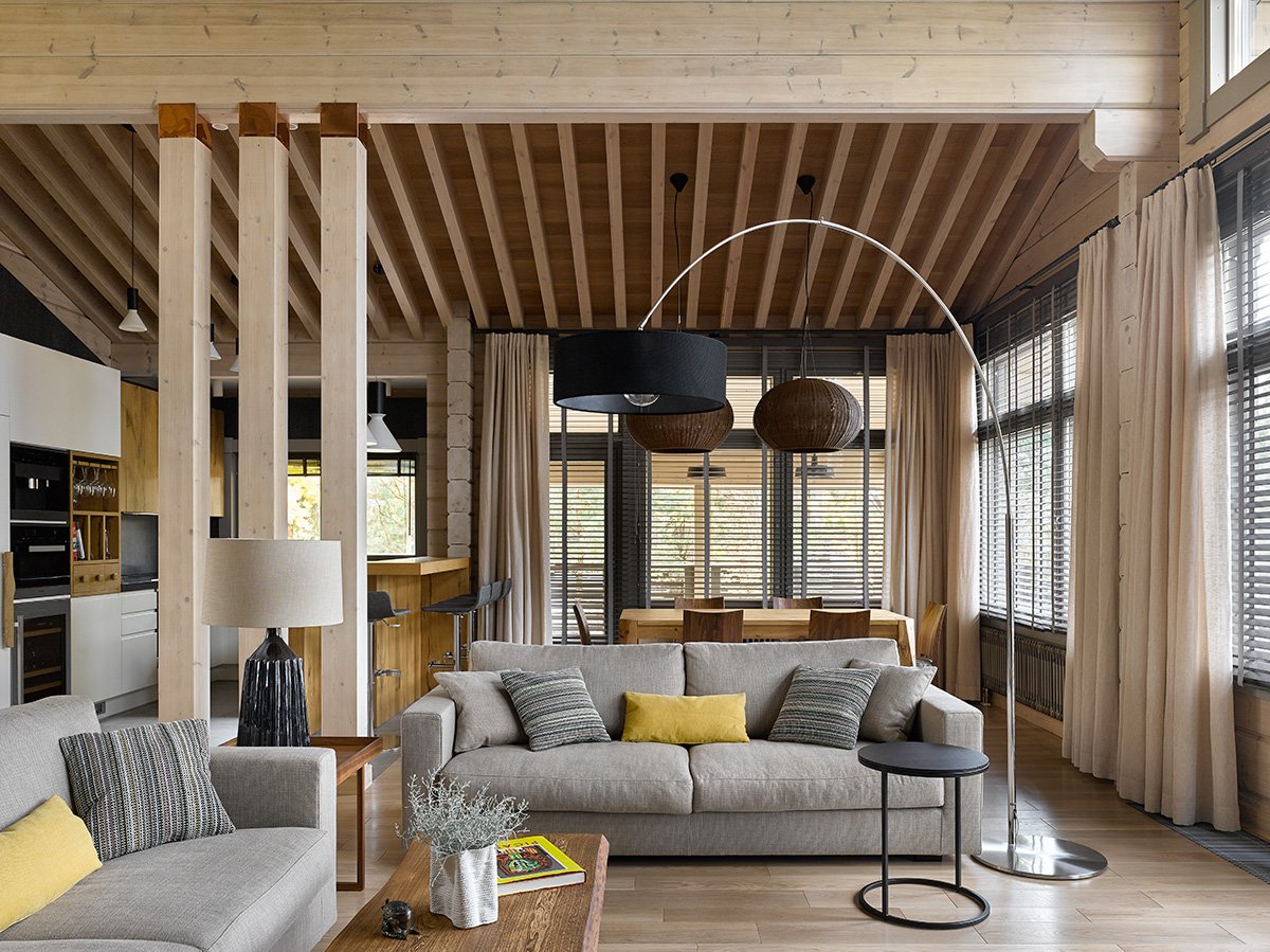 Гостиная в доме из клееного бруса в скандинавском стиле