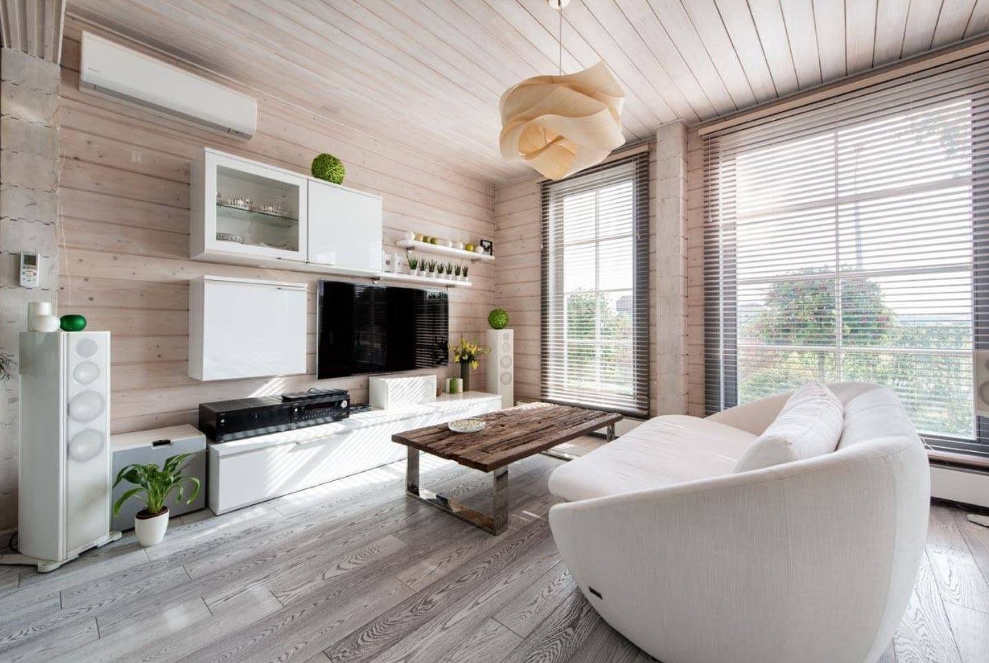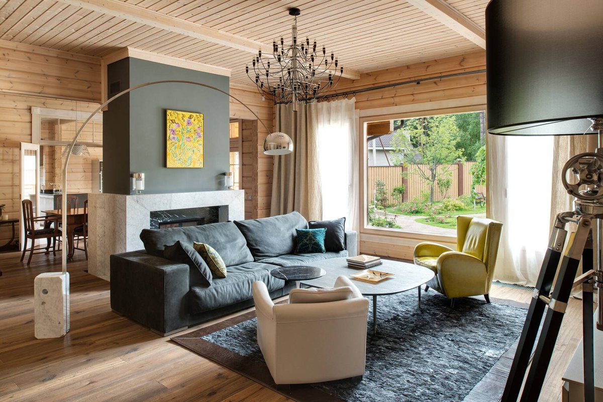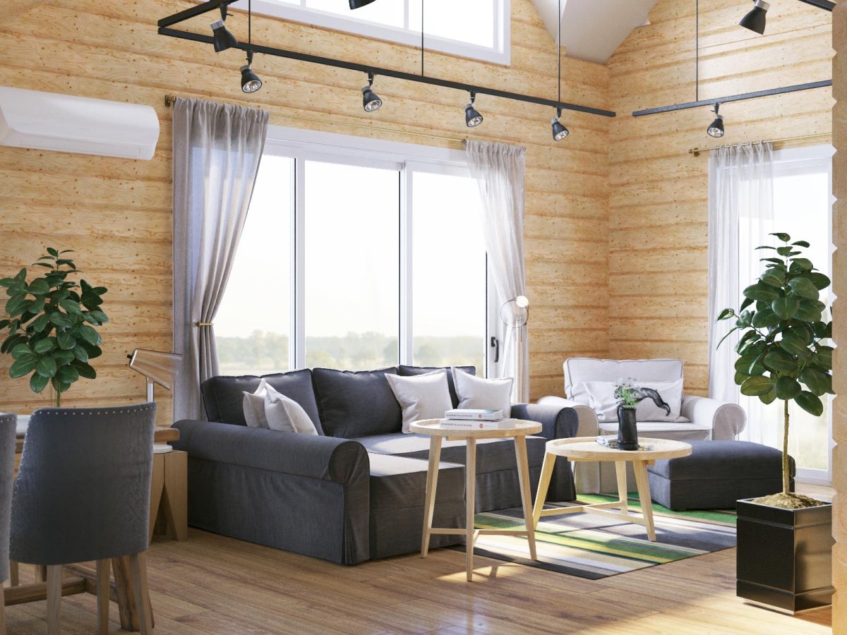 Гостиная в доме из бруса в скандинавском стиле