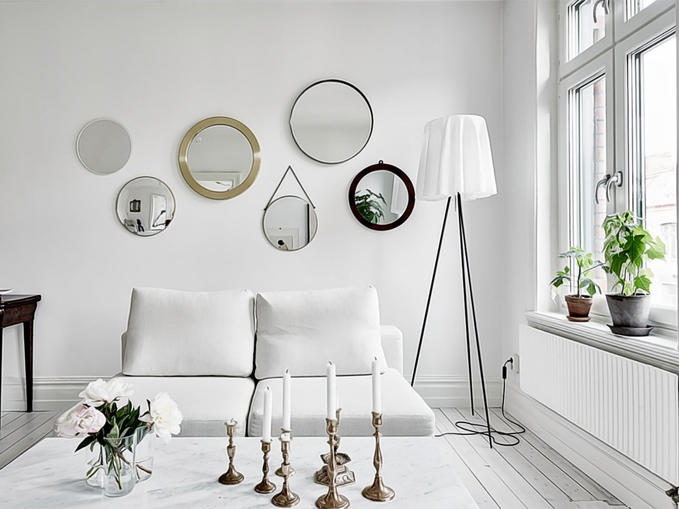 Круглое зеркало над диваном