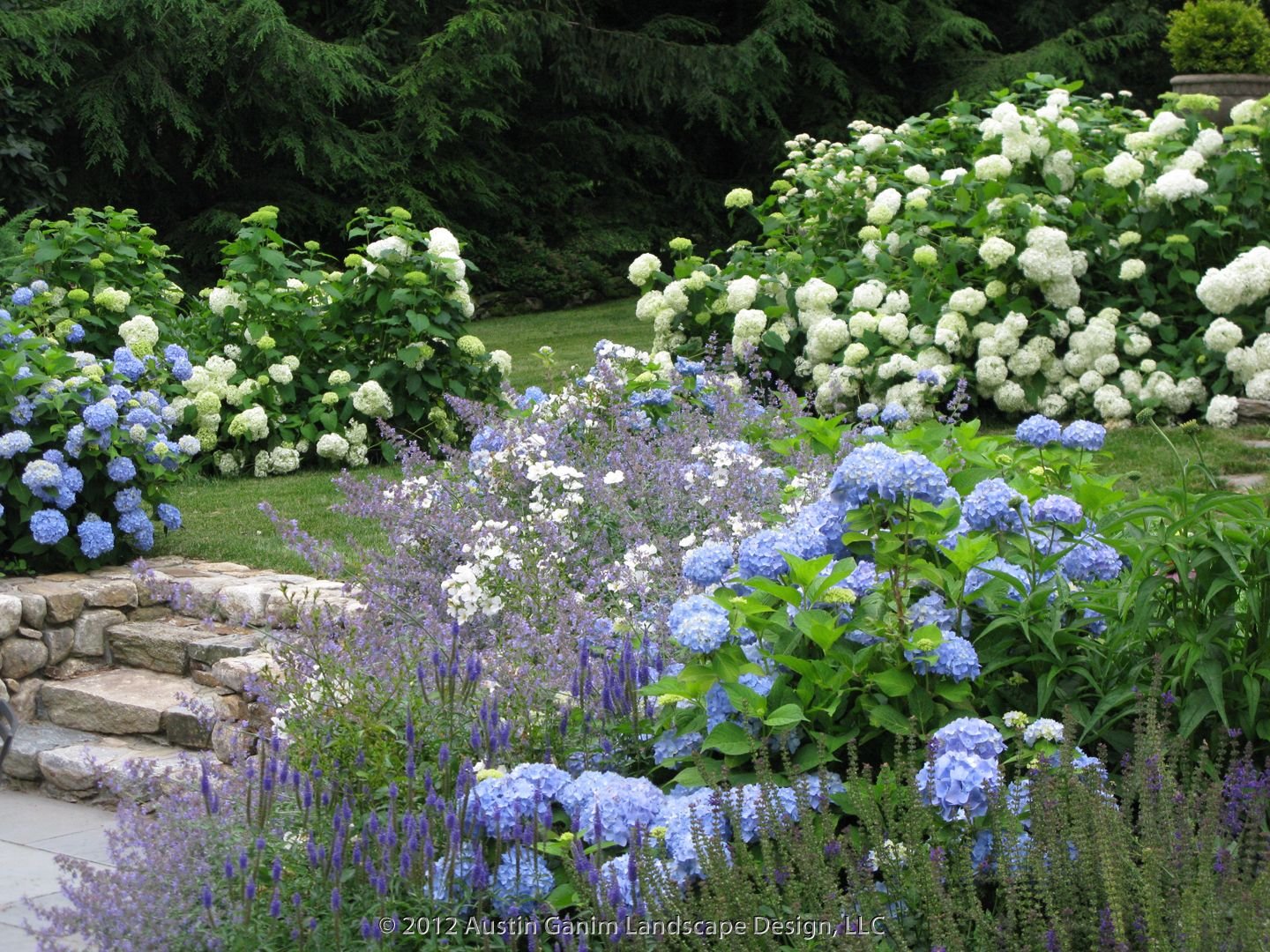 Миксбордер можжевельник и гортензия голубая