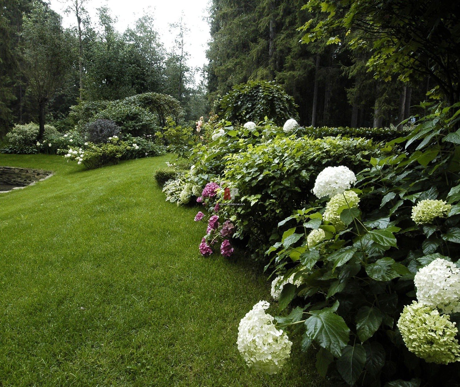 Клумба с рододендроном и гортензией