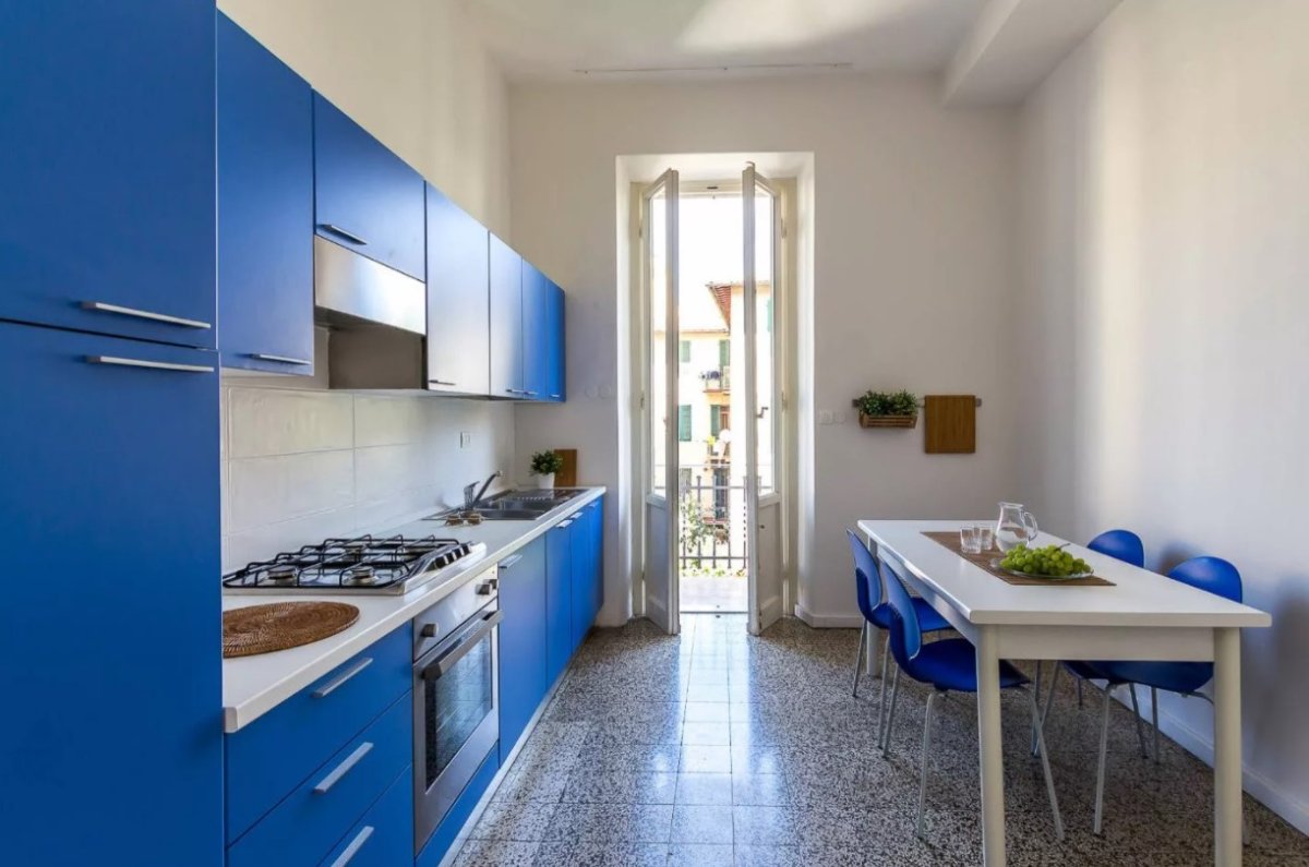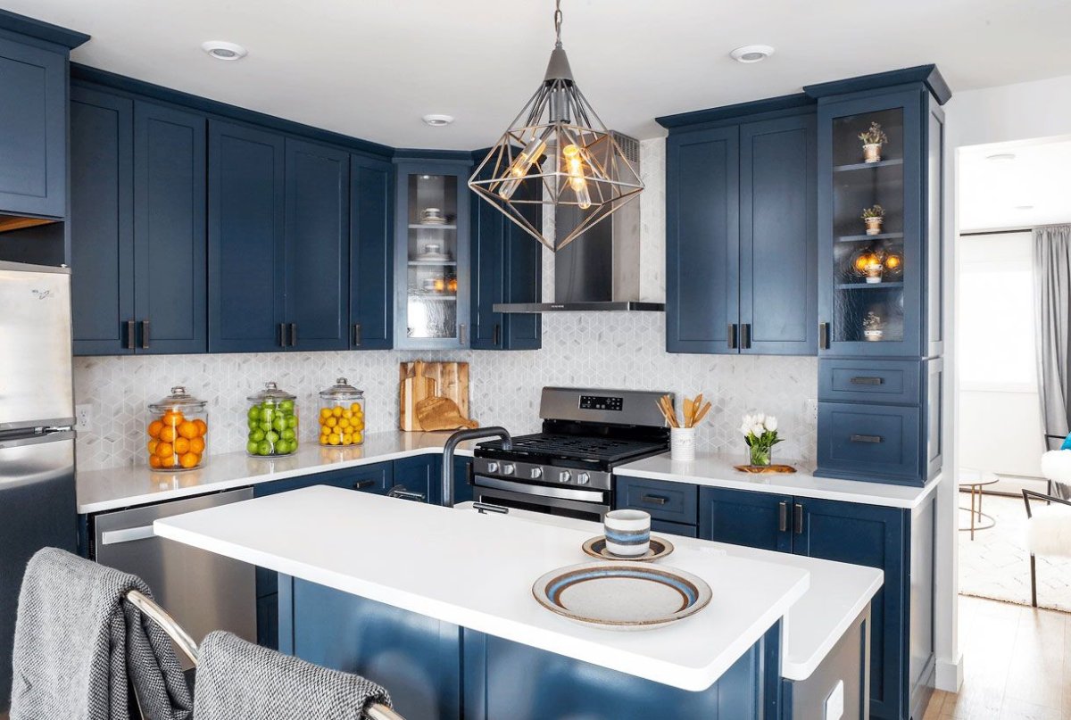 Кухонный гарнитур синего цвета в интерьере