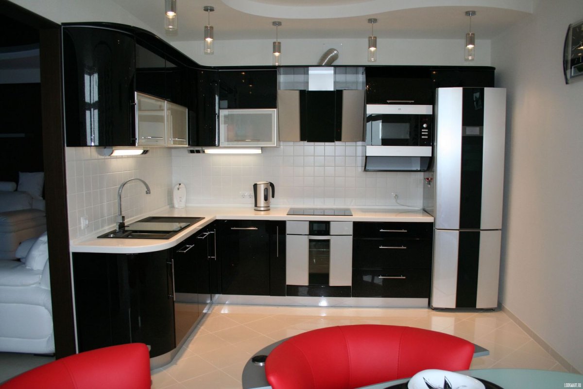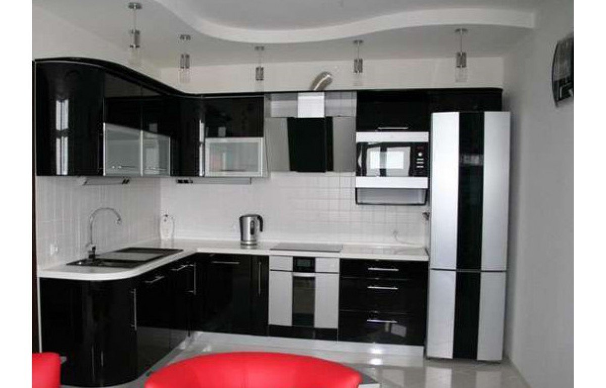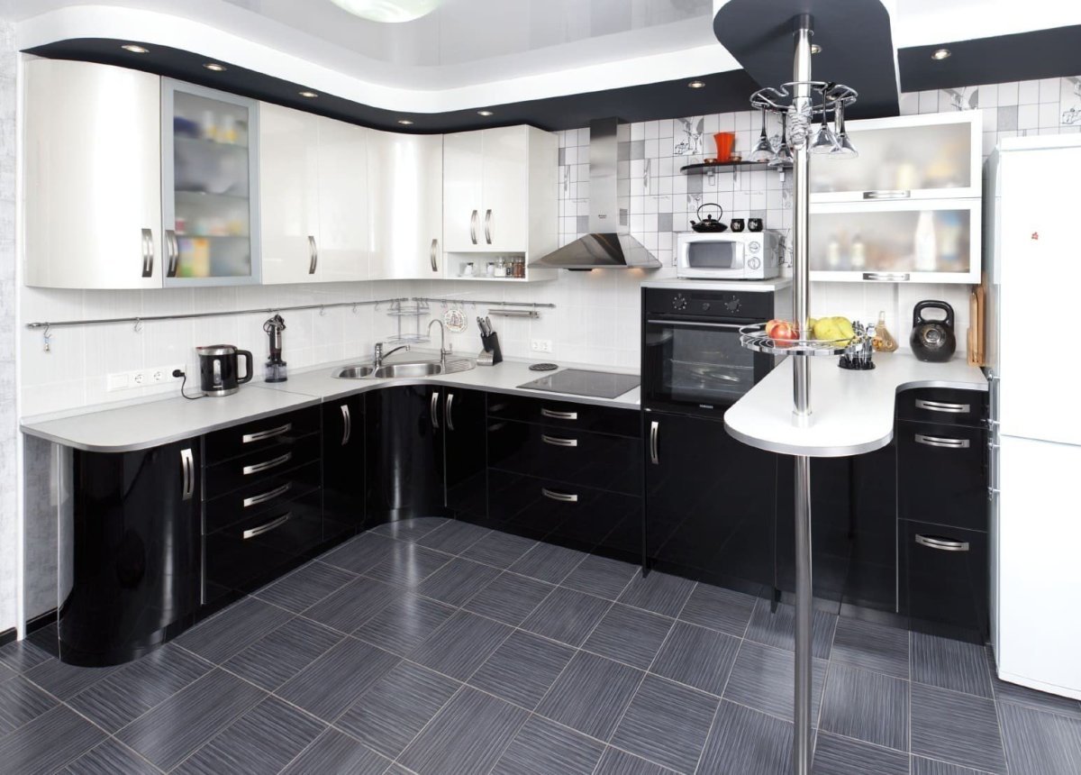 Черно белая угловая кухня