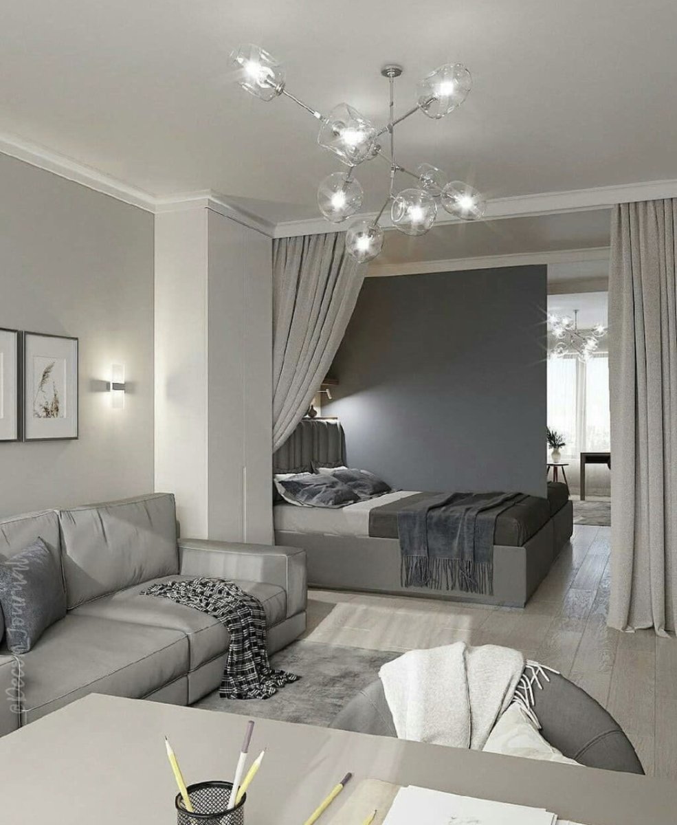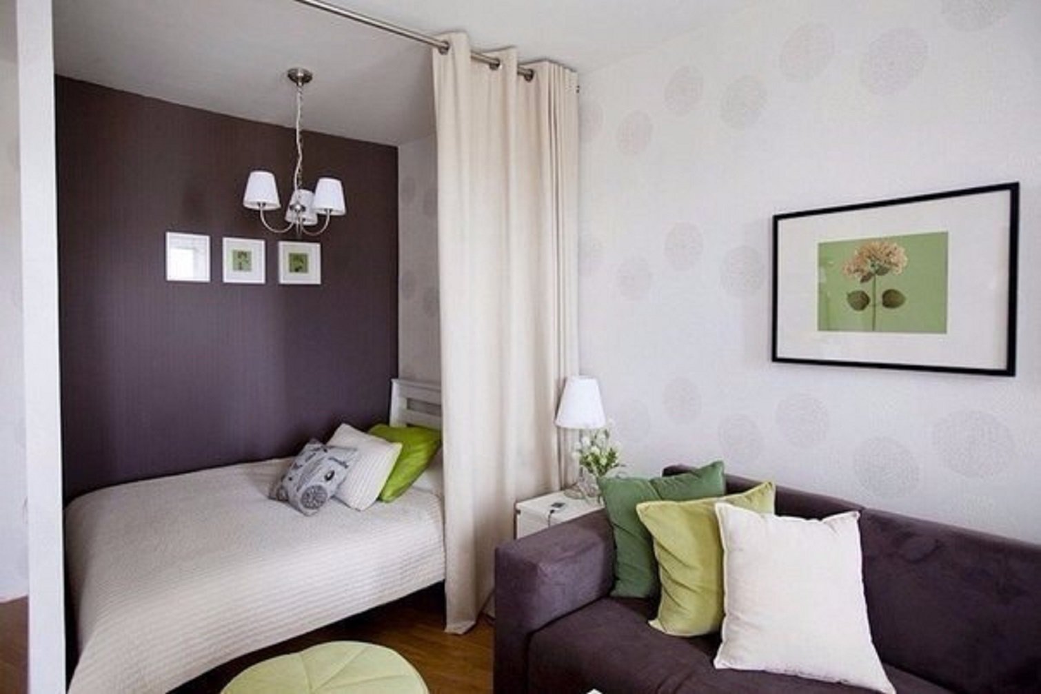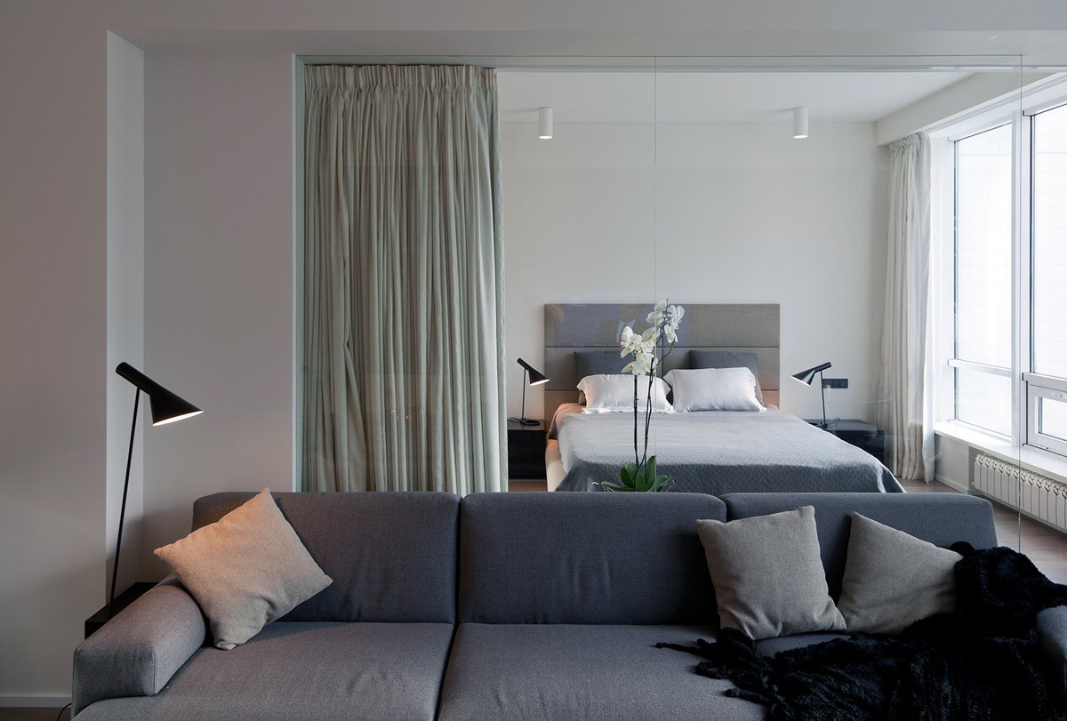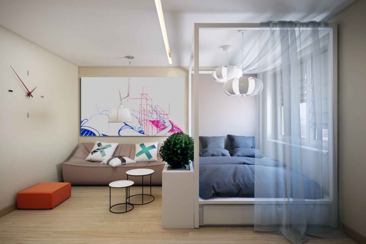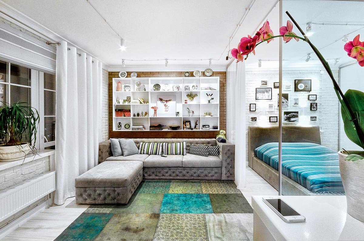 Интерьер однокомнатной квартиры с кроватью и диваном