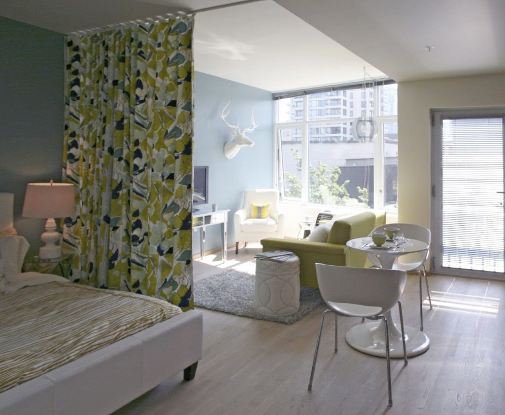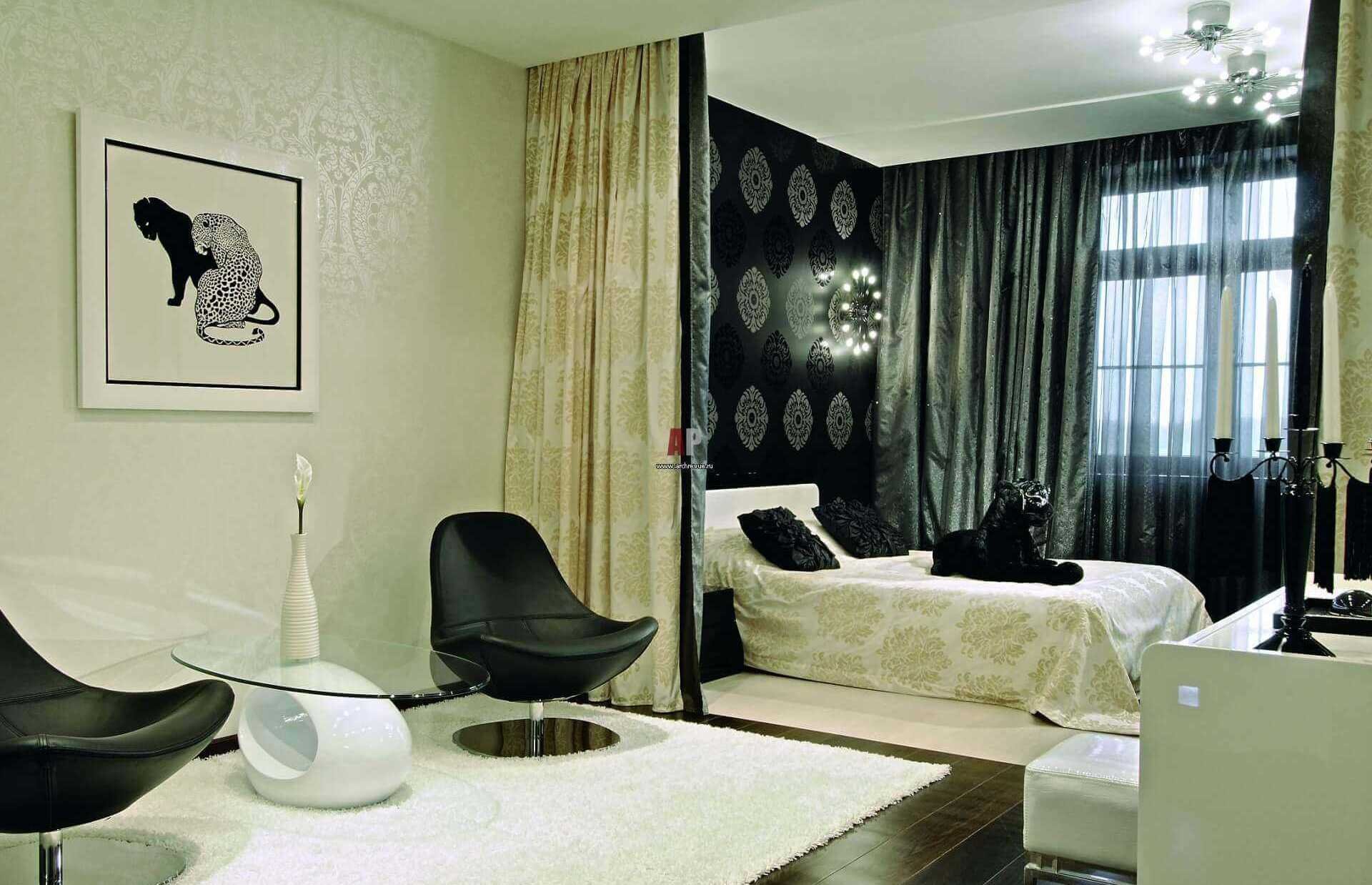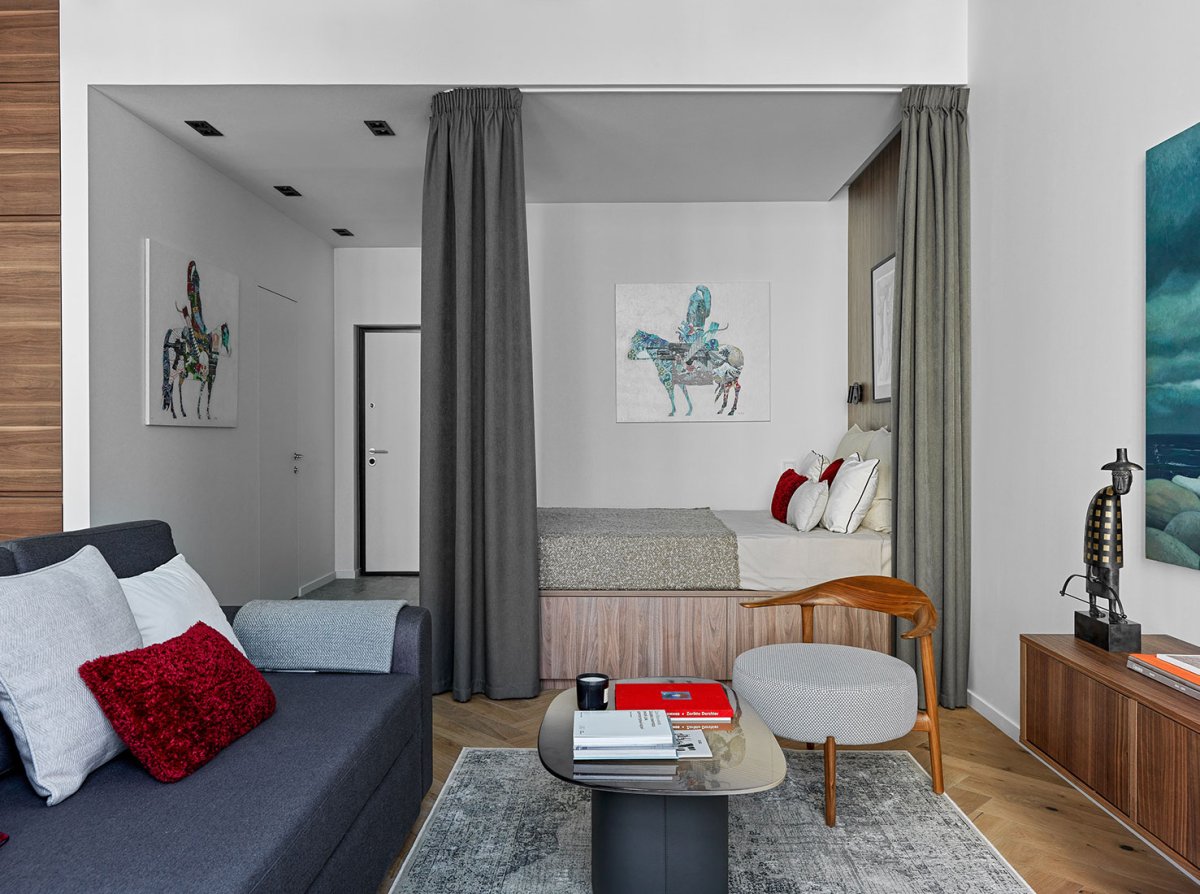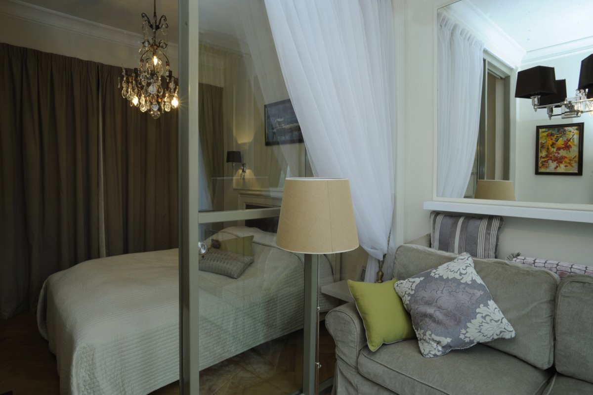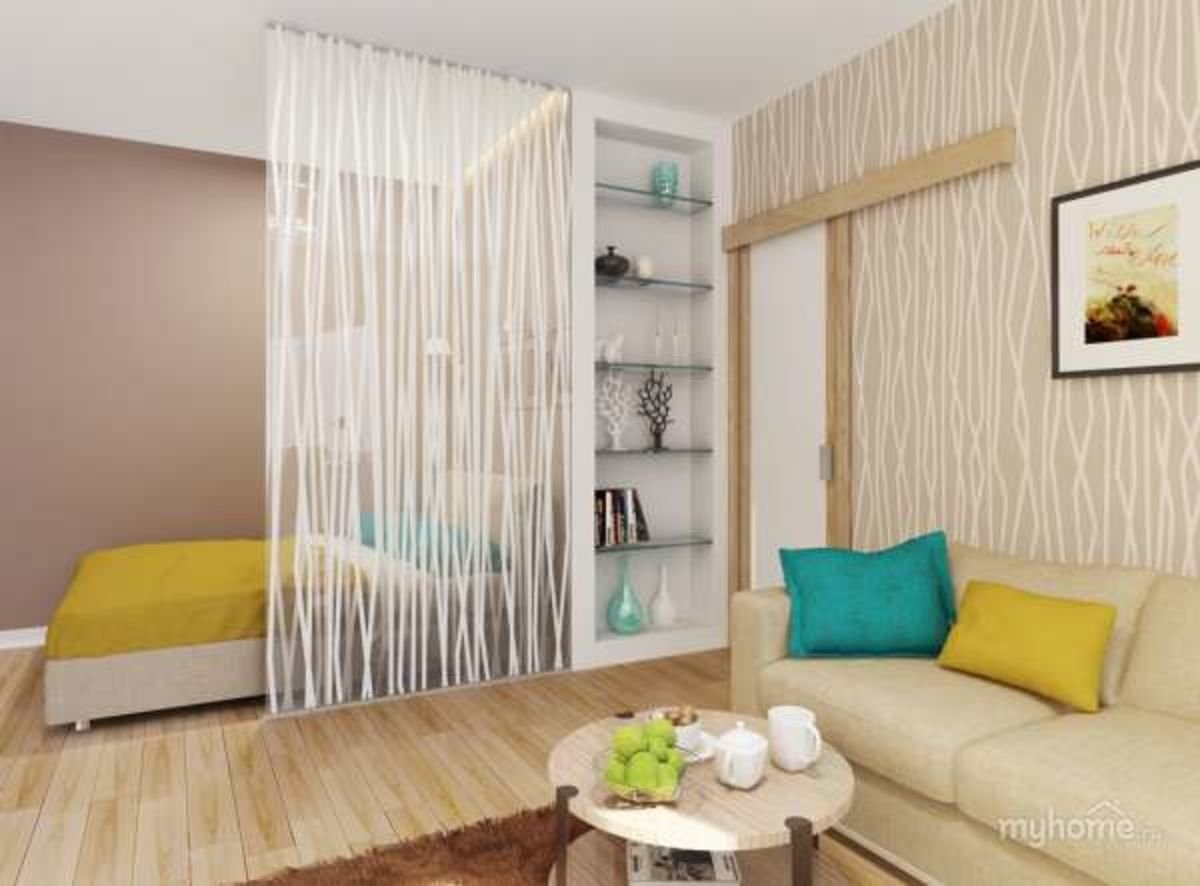 Интерьер однокомнатной квартиры с кроватью и диваном