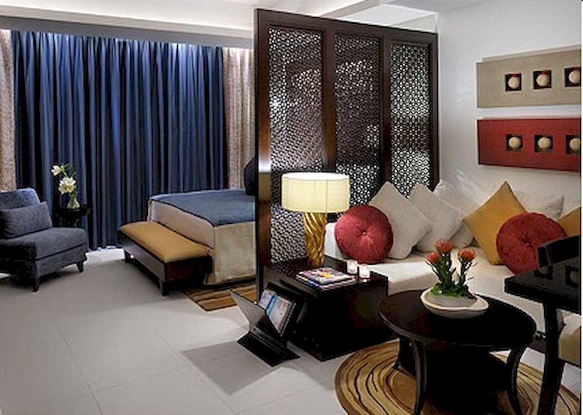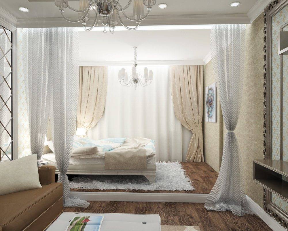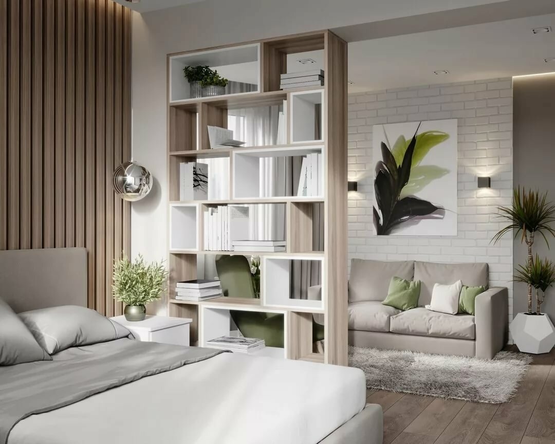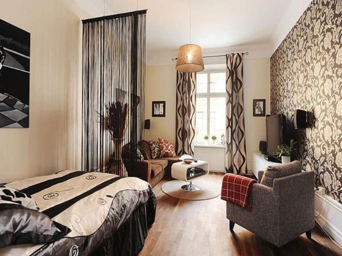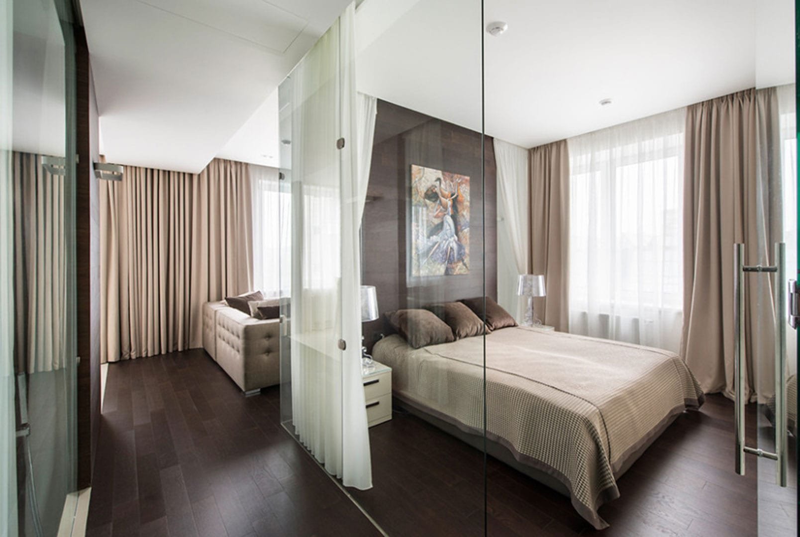Интерьер однокомнатной квартиры с кроватью и диваном