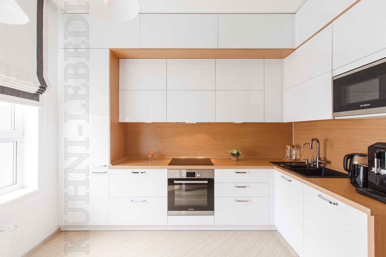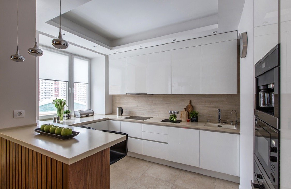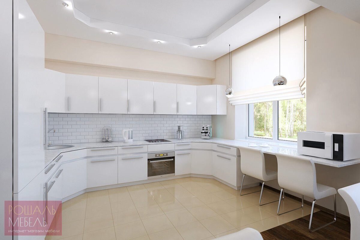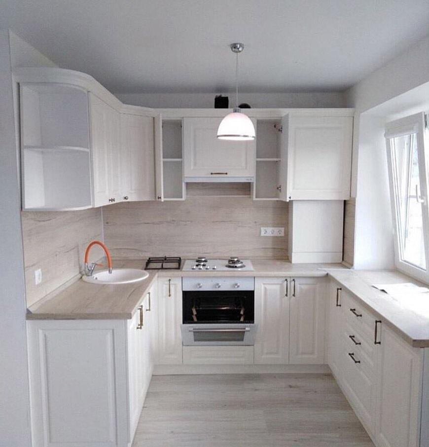 Белая угловая кухня с окном