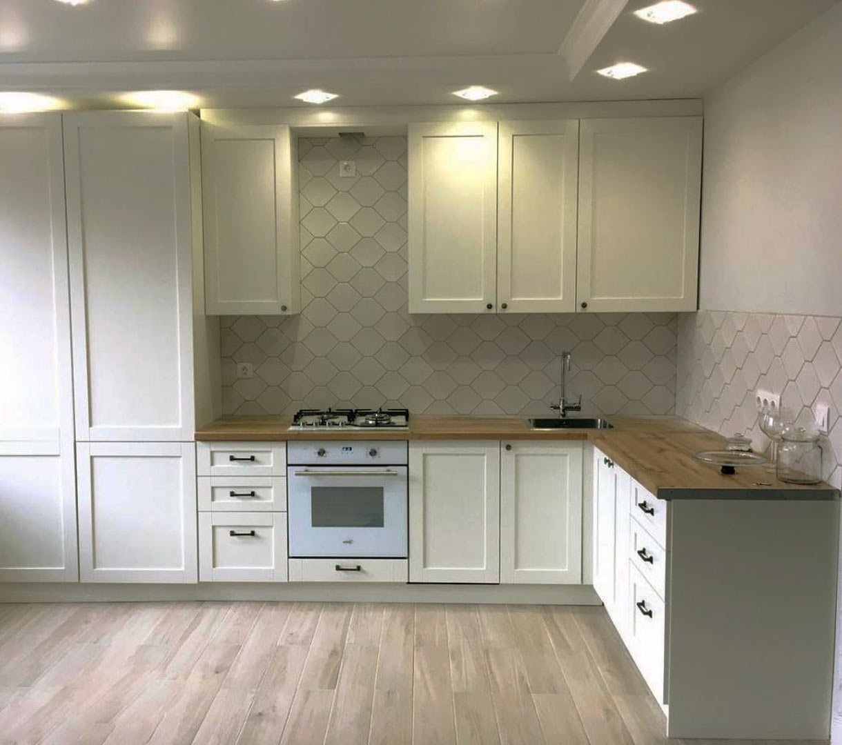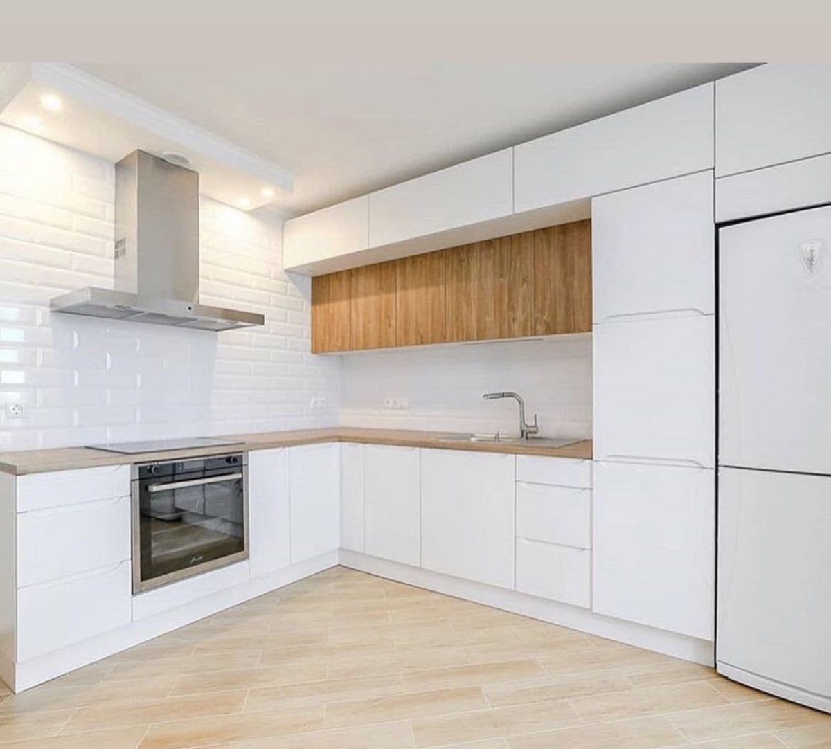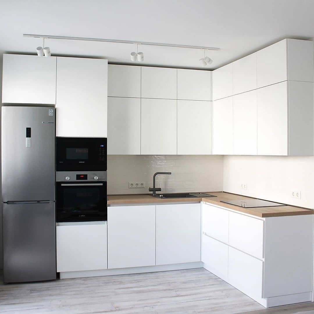 Белая кухня с деревянной столешницей