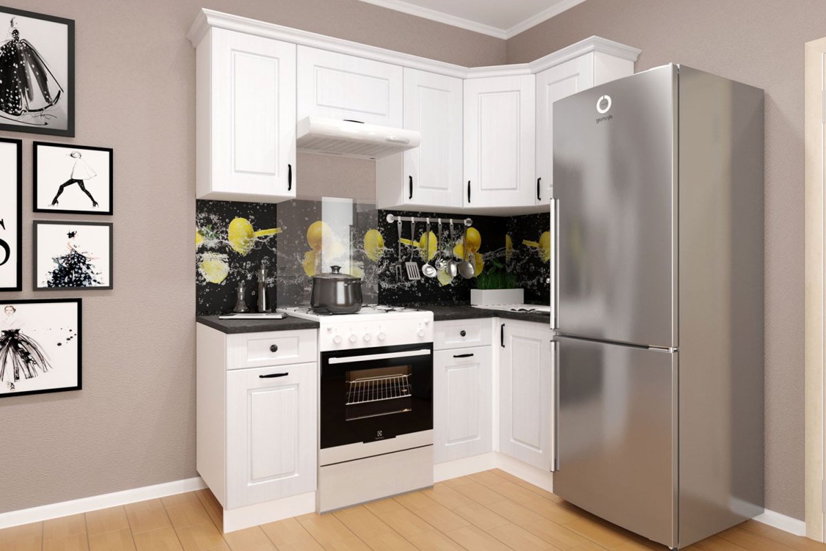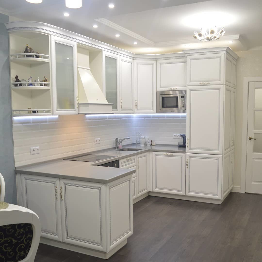 Белая угловая кухня с пеналом