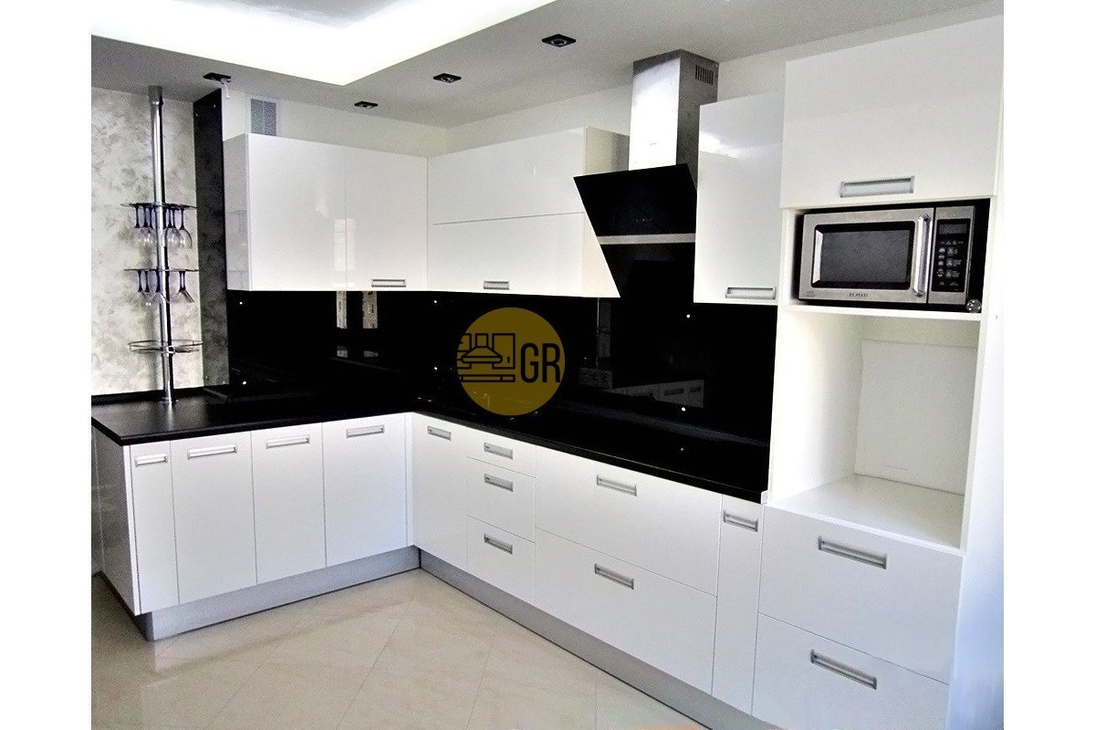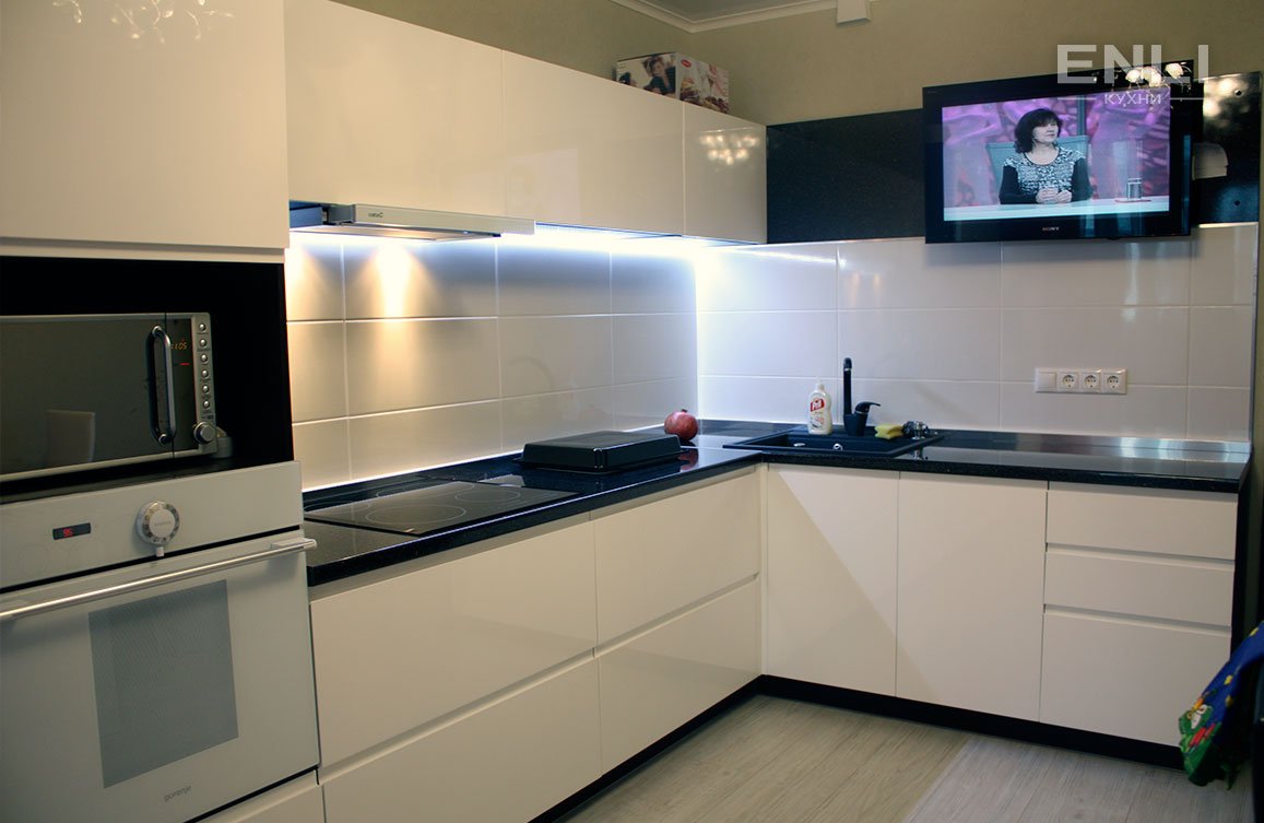 Кухня белый глянец с черной столешницей