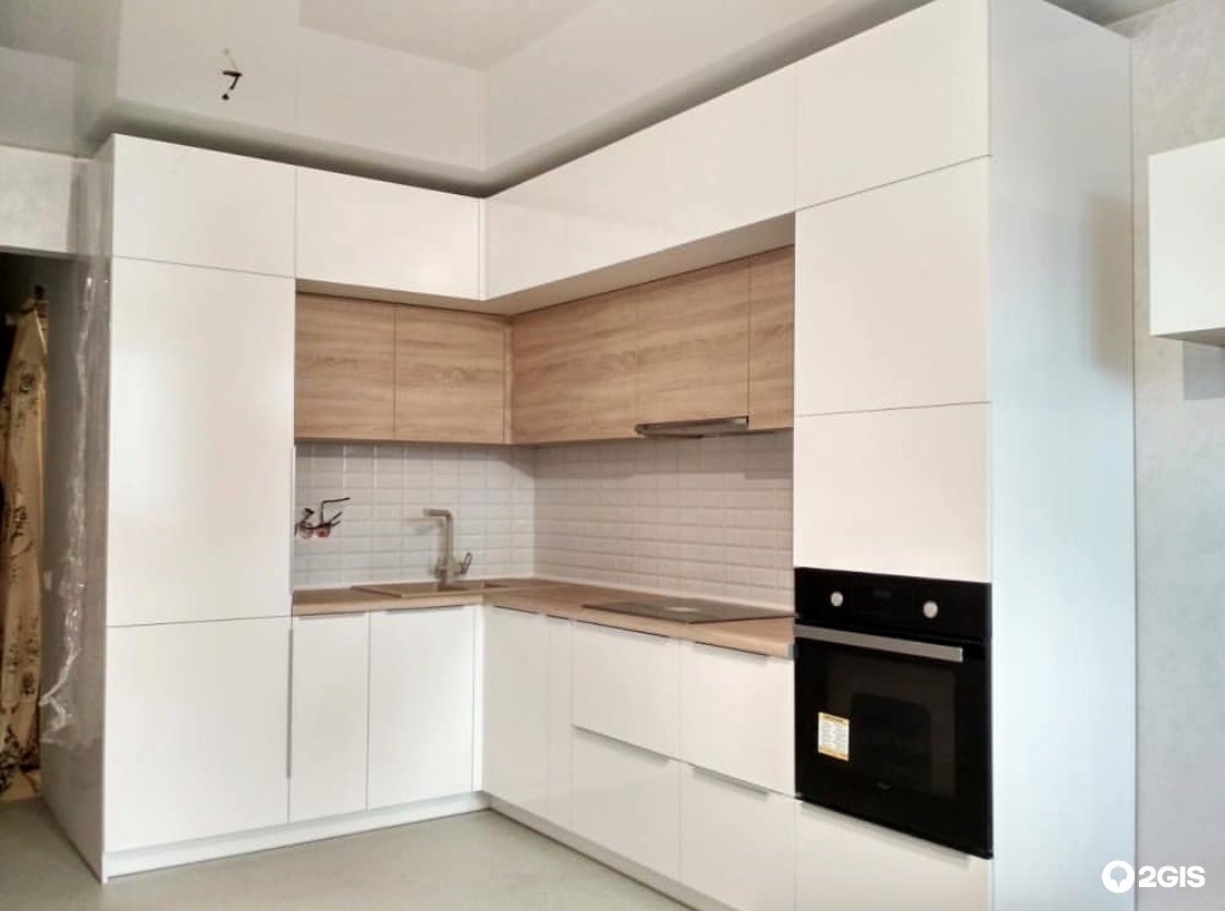 Угловая кухня с высокими шкафами