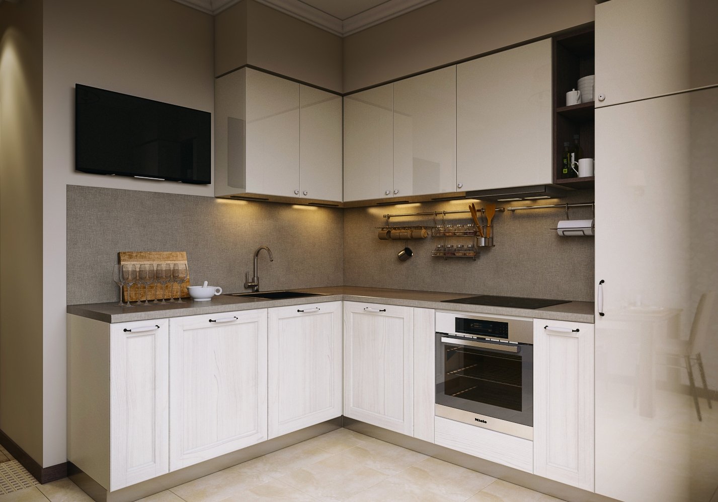 Кухня капучино с белым глянцем угловая