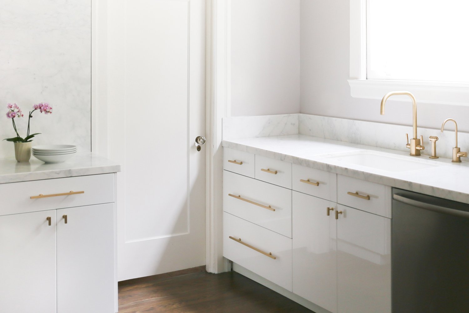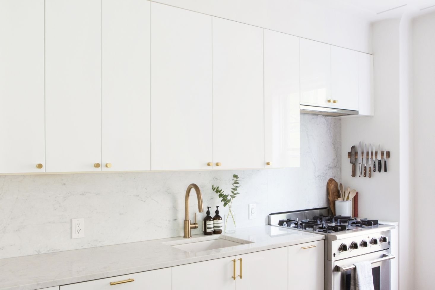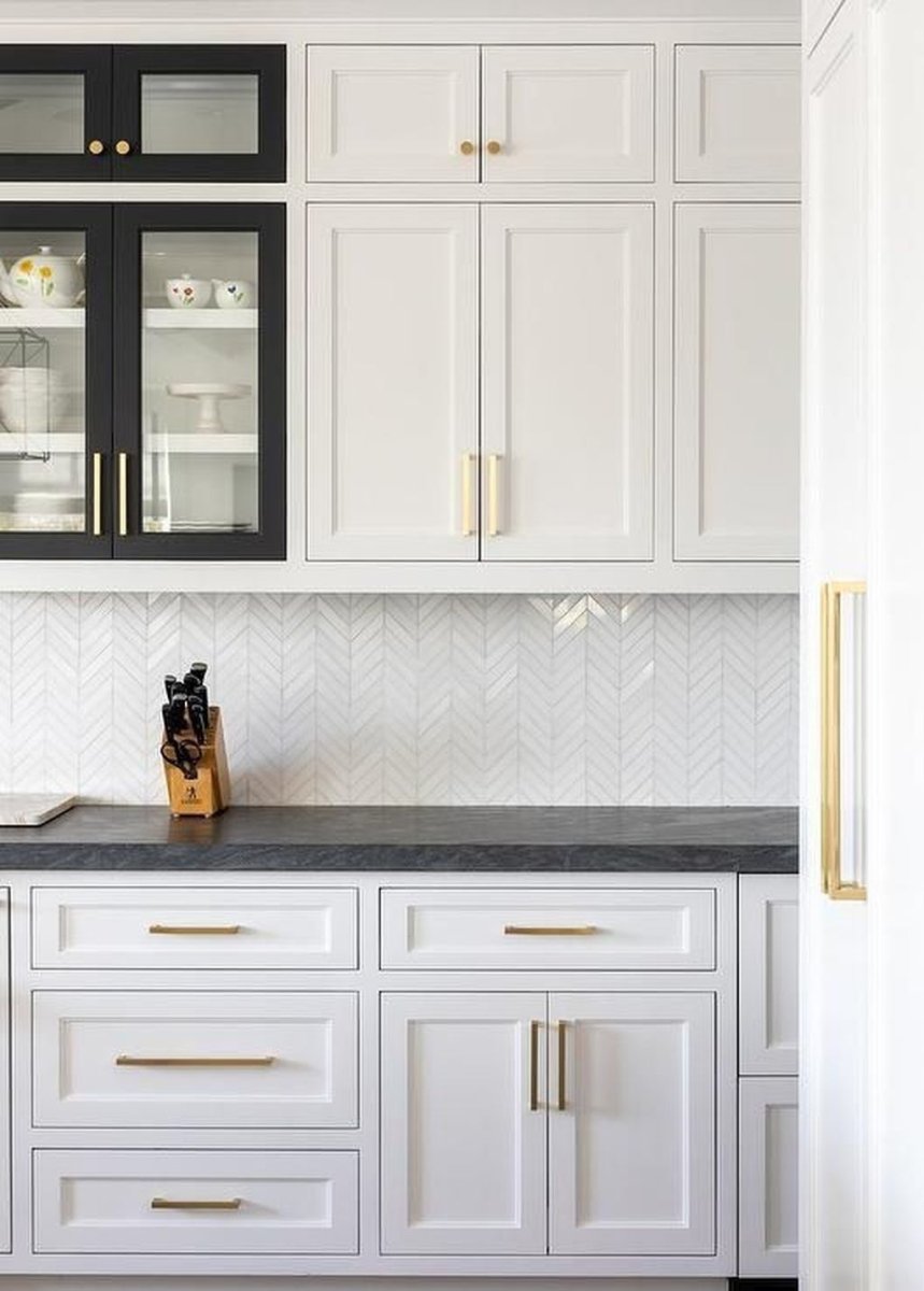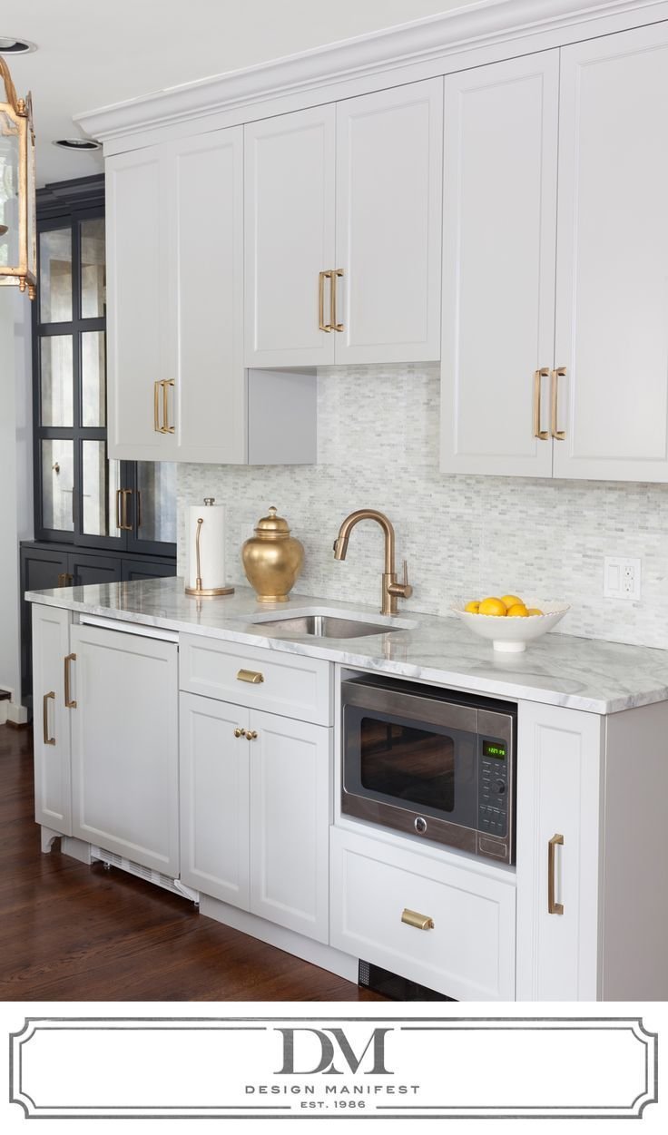 Бронзовые ручки на белой кухне