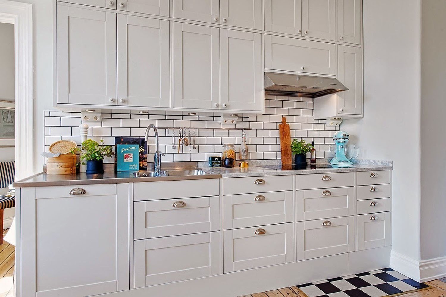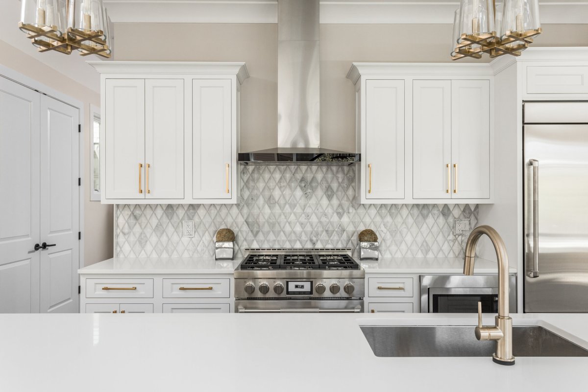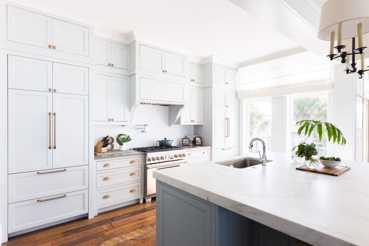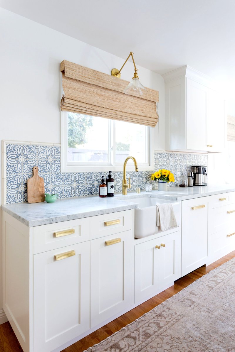 Бронзовые ручки на белой кухне