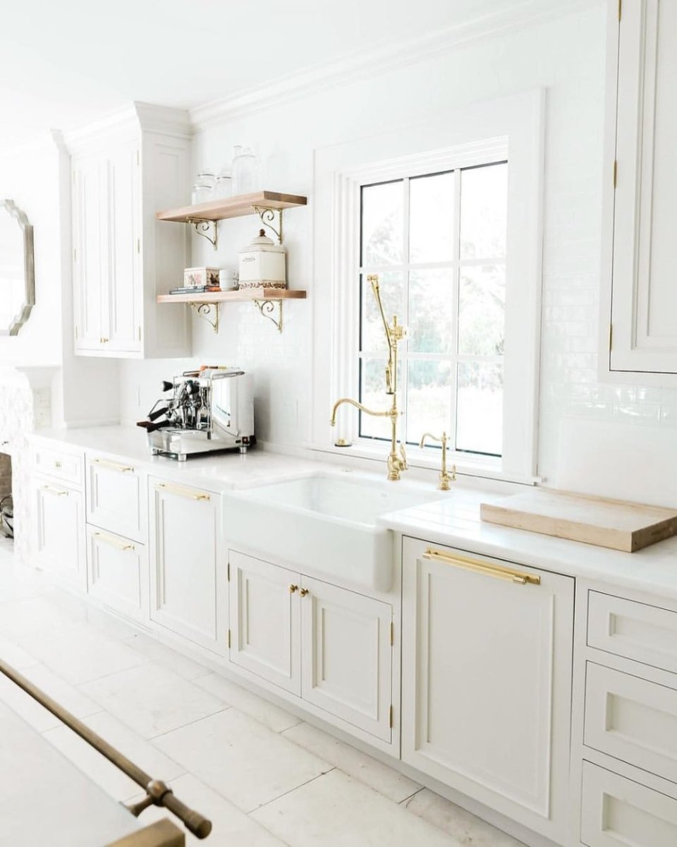 Белая кухня с золотистыми ручками