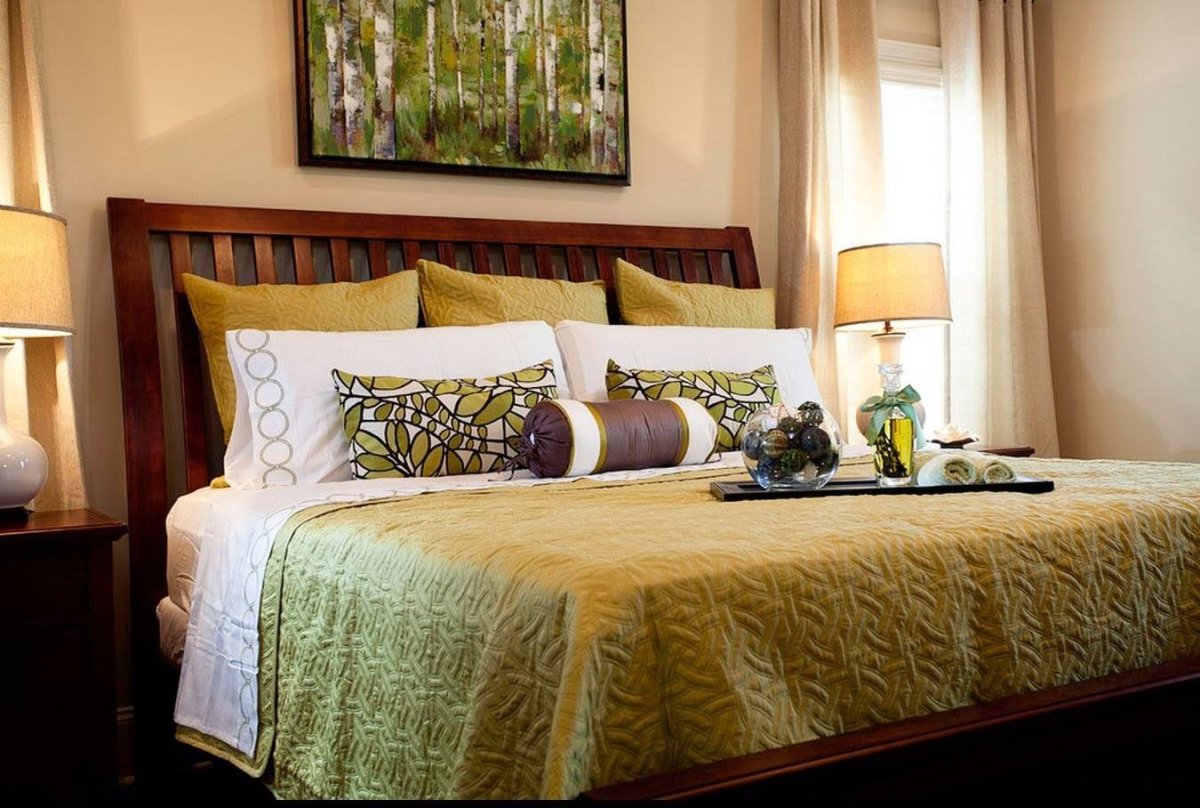Оливковая кровать в интерьере