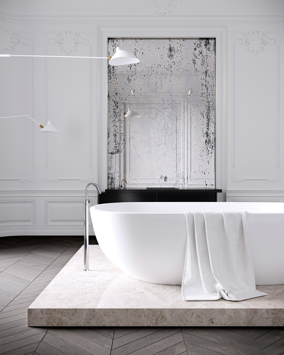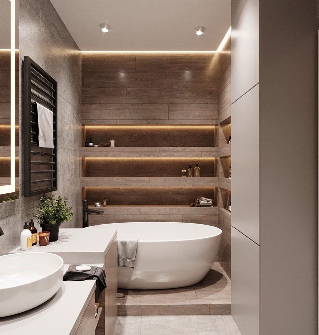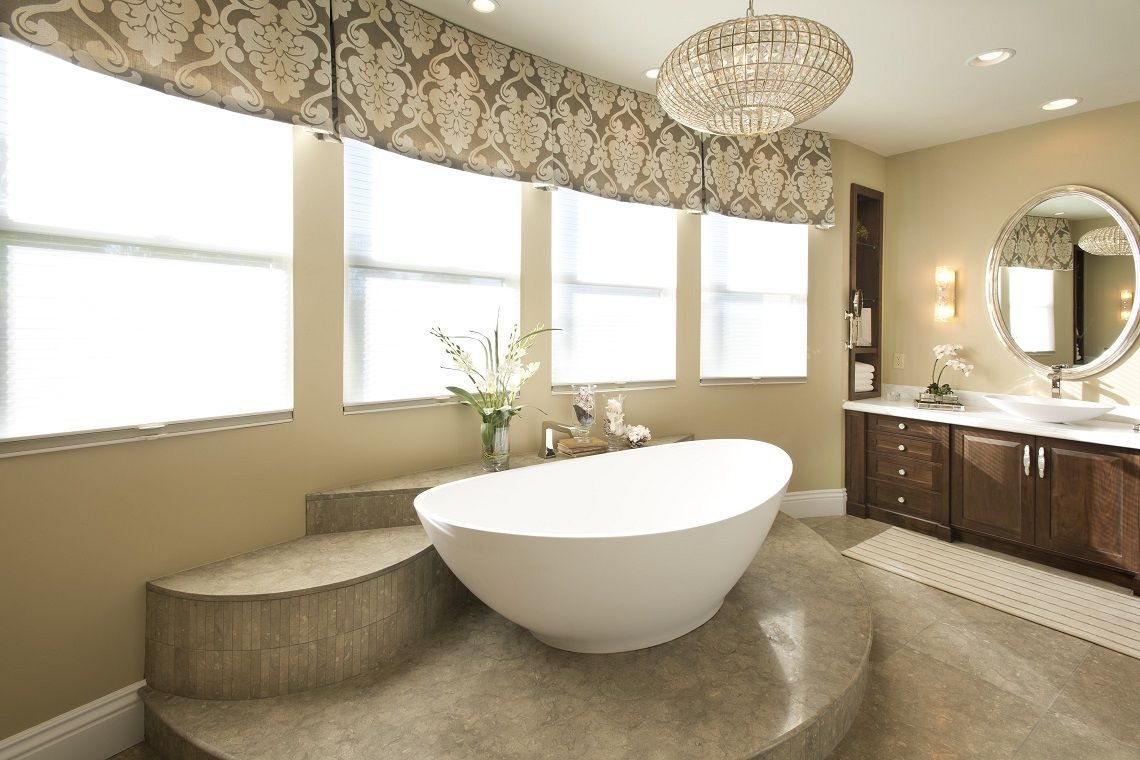 Отдельностоящая ванна на подиуме в интерьере