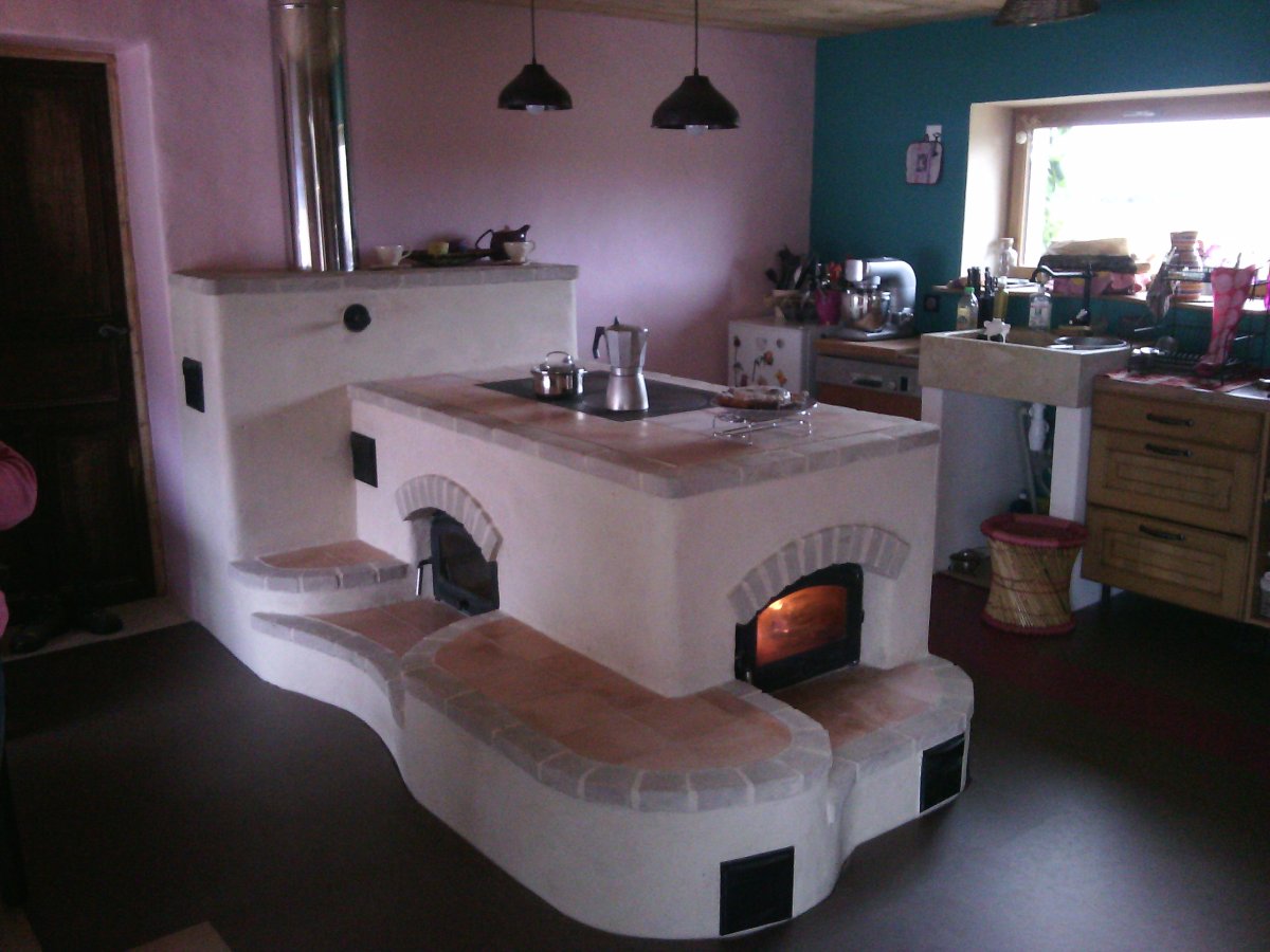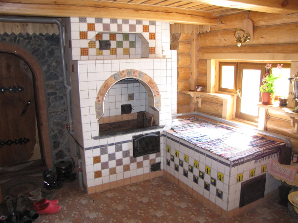 Русская печь облицованная плиткой в интерьере кухни