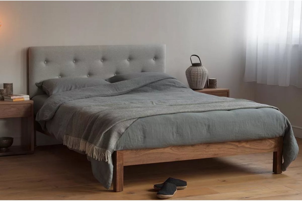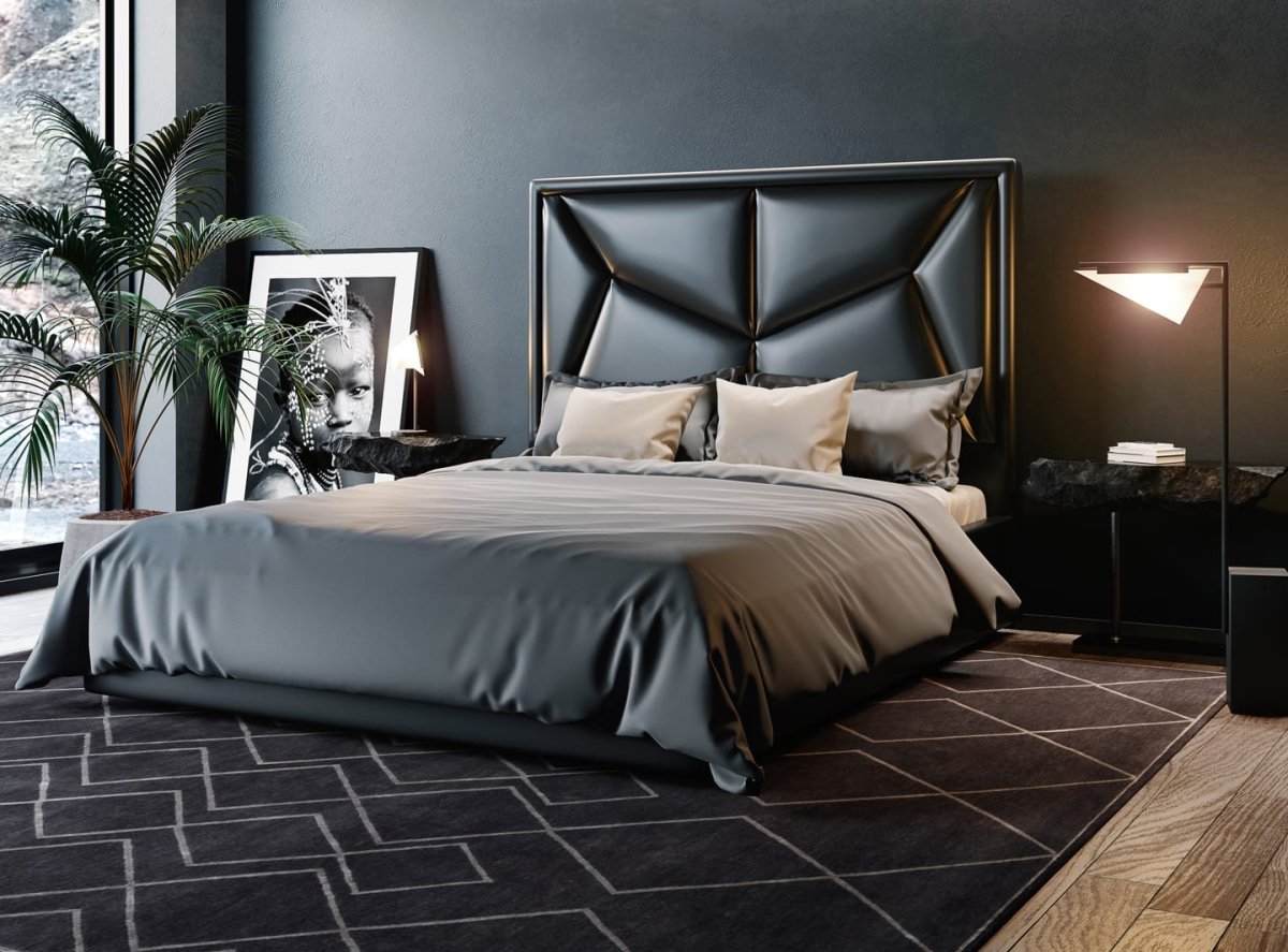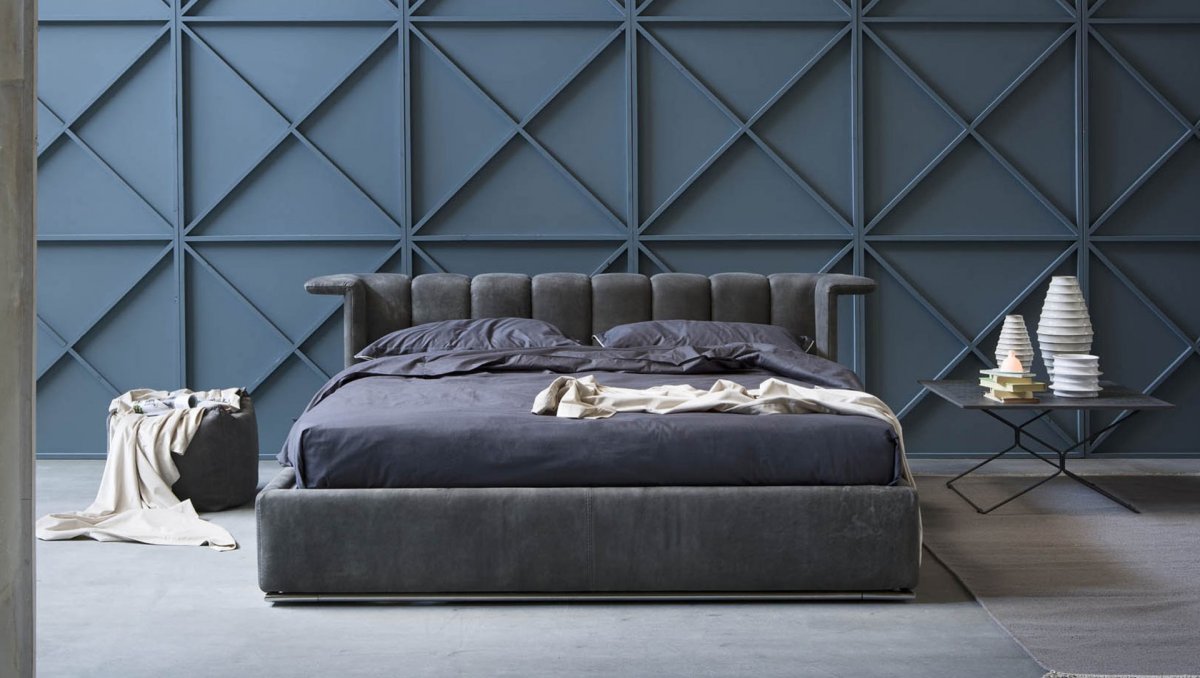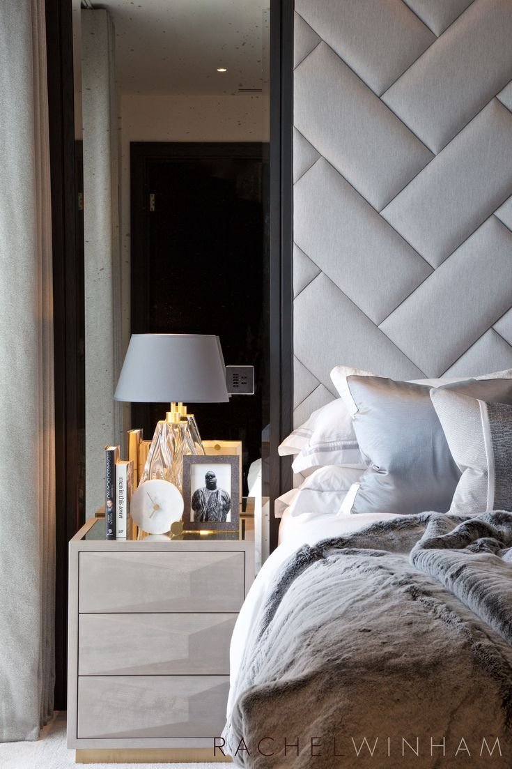 Серая кровать в интерьере с мягким изголовьем