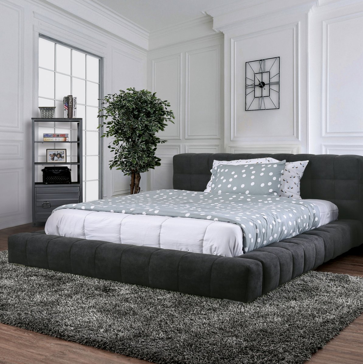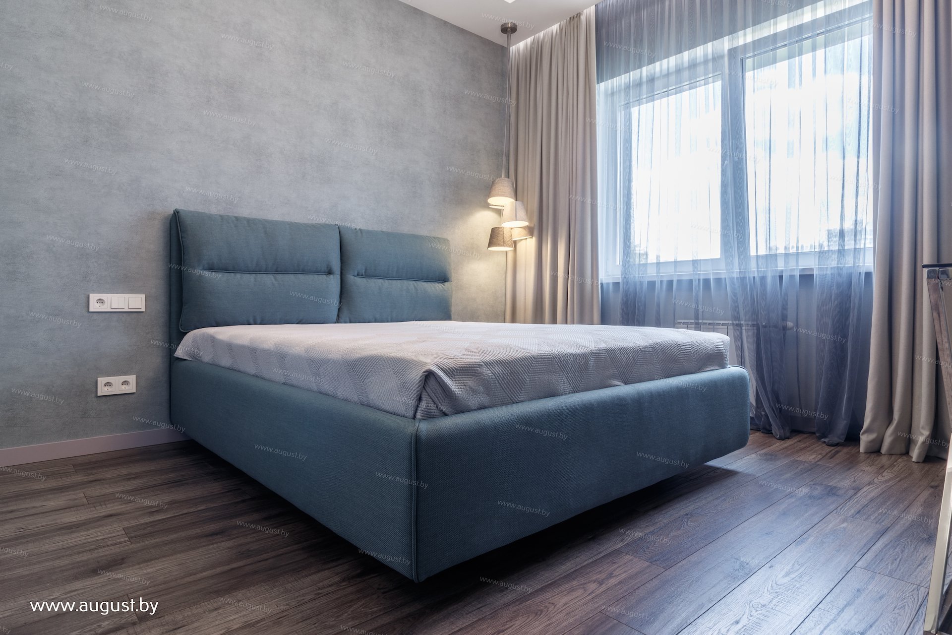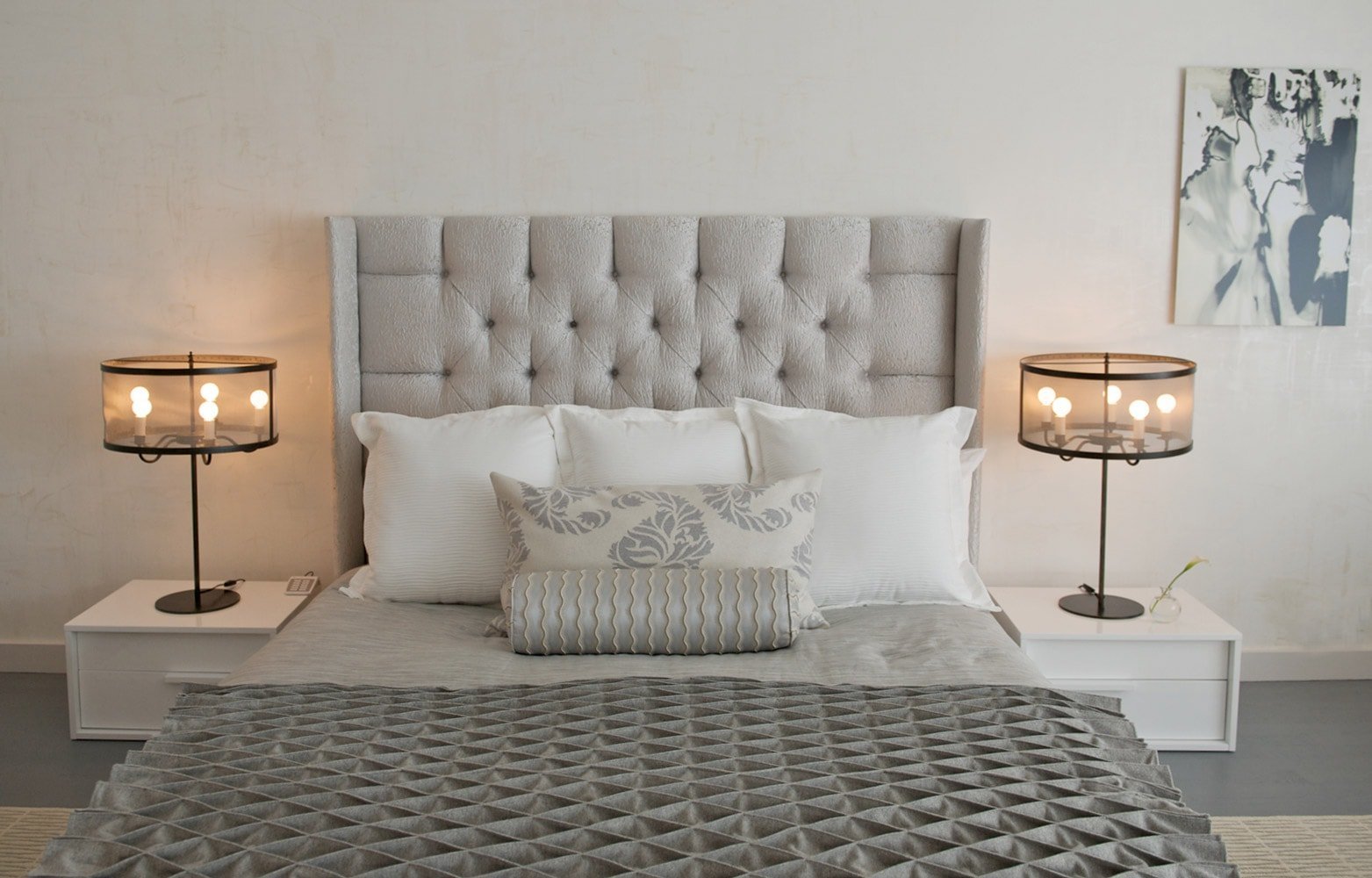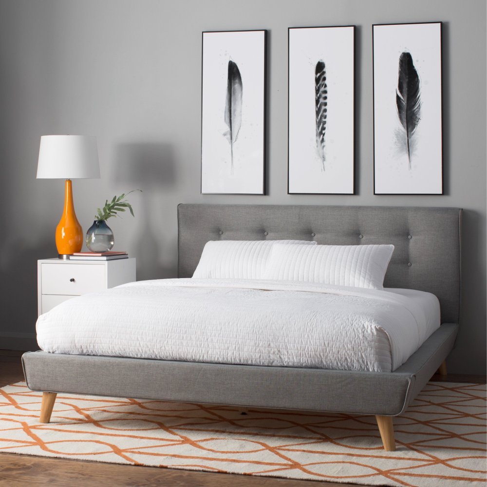 Серая кровать в интерьере с мягким изголовьем