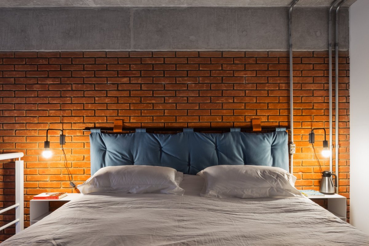 Спальня в стиле лофт с мягкой кроватью