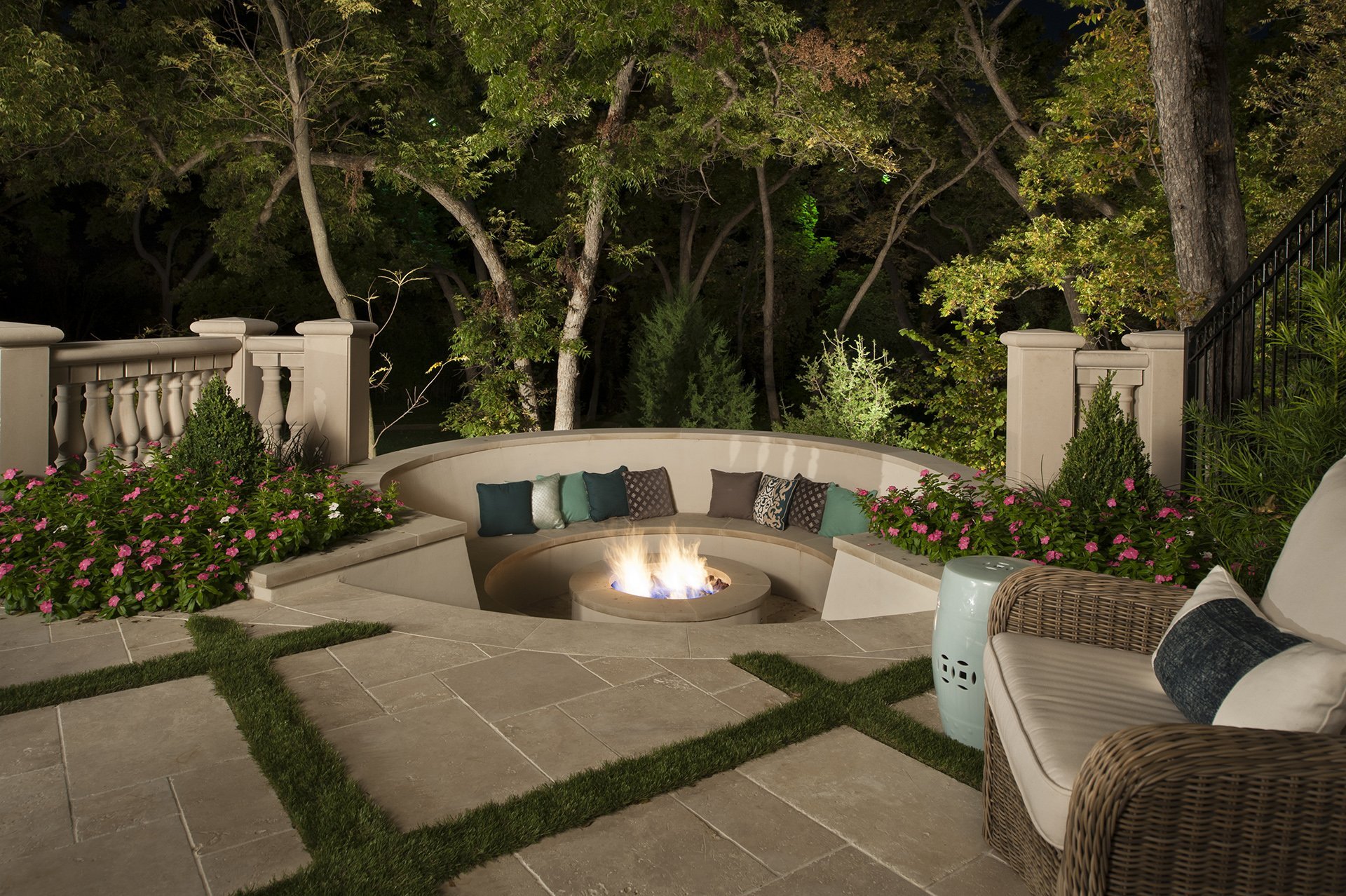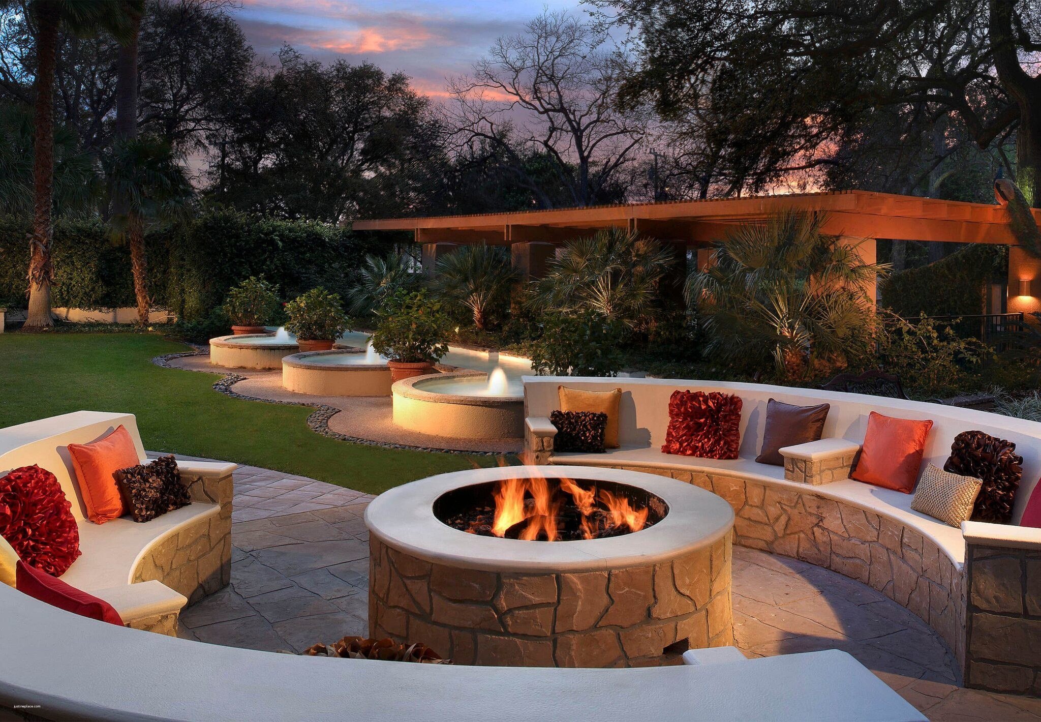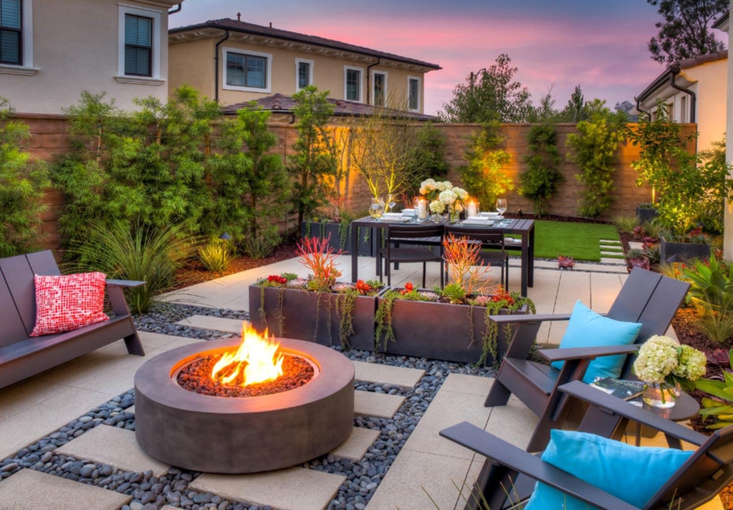 Ландшафт патио с кострищем