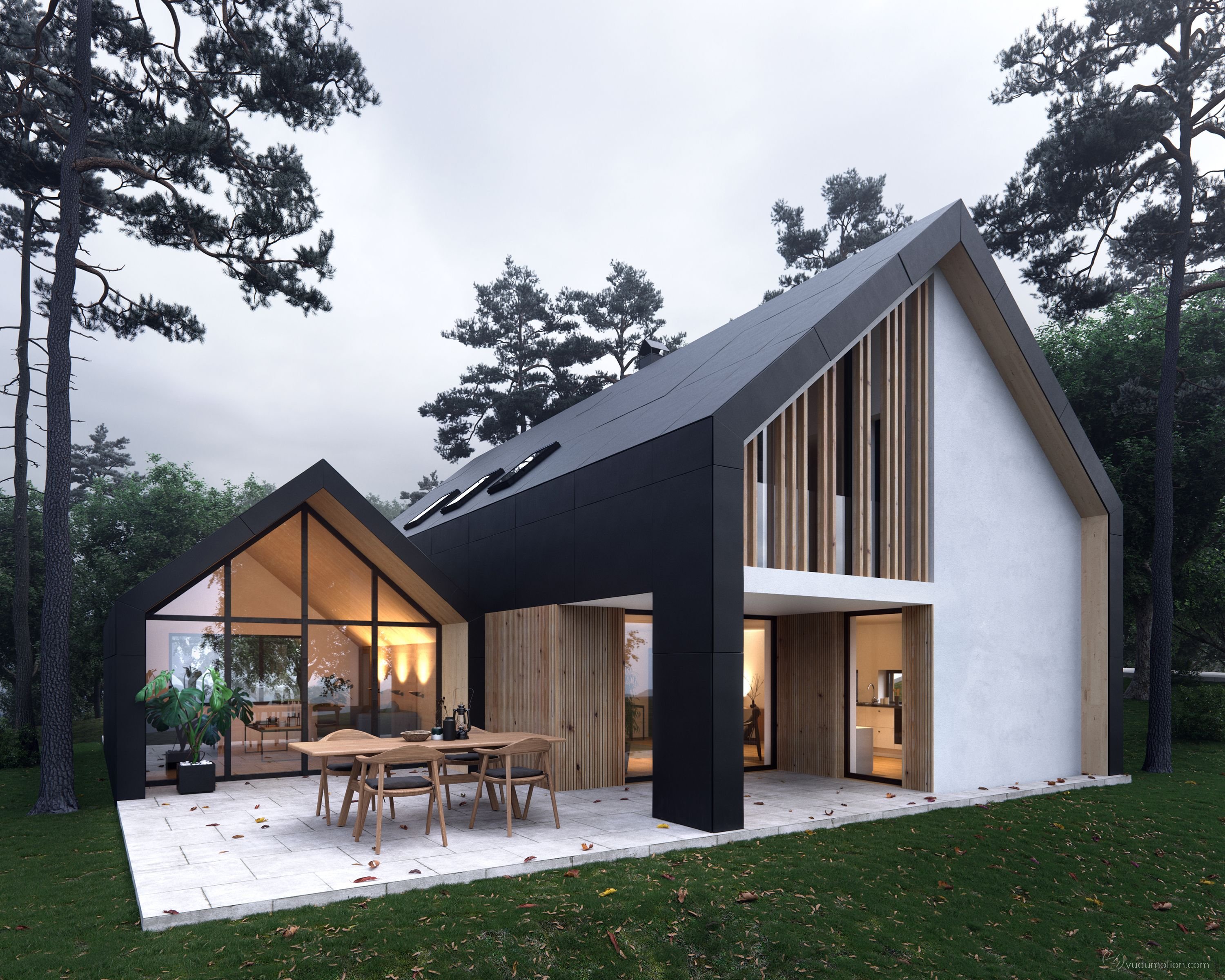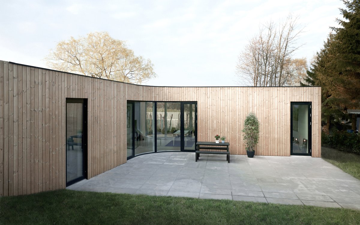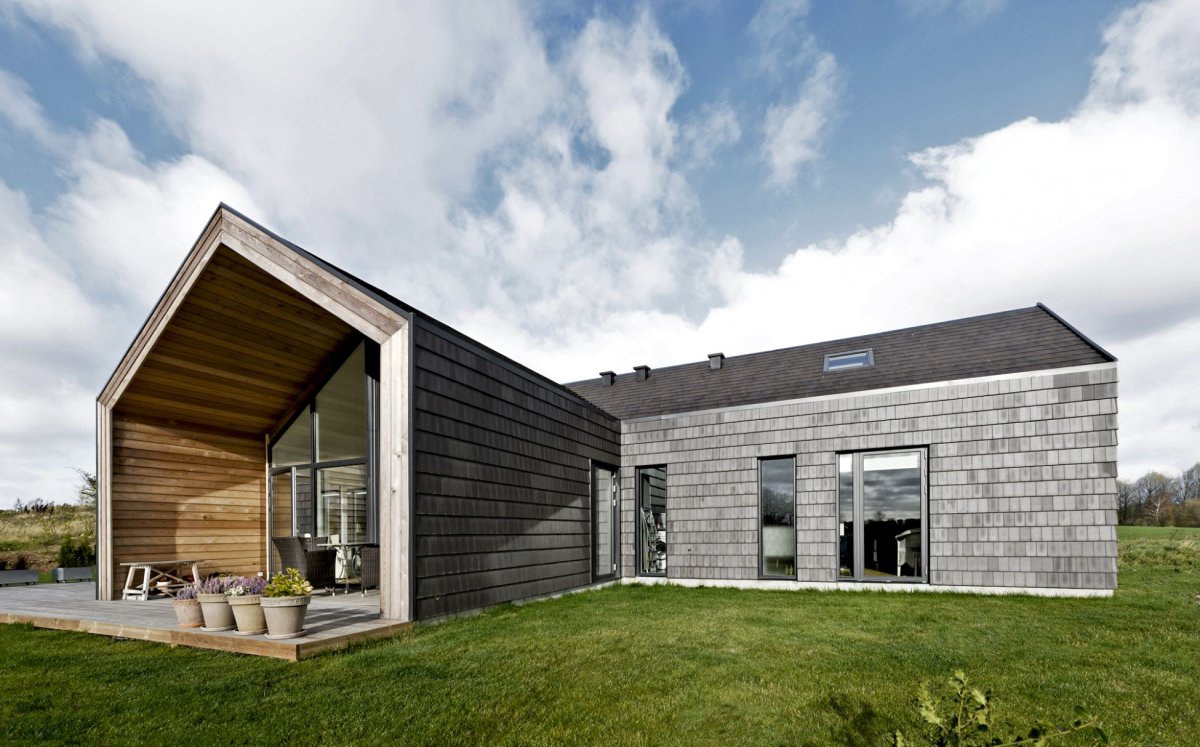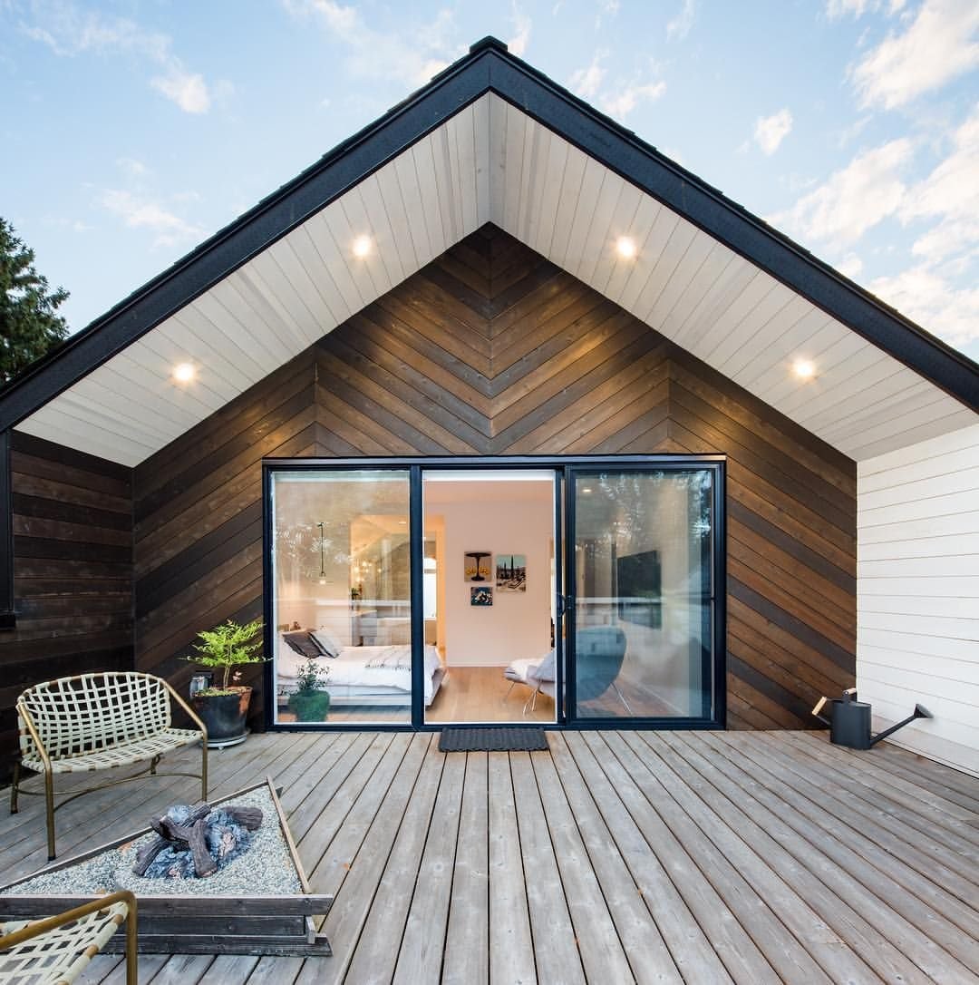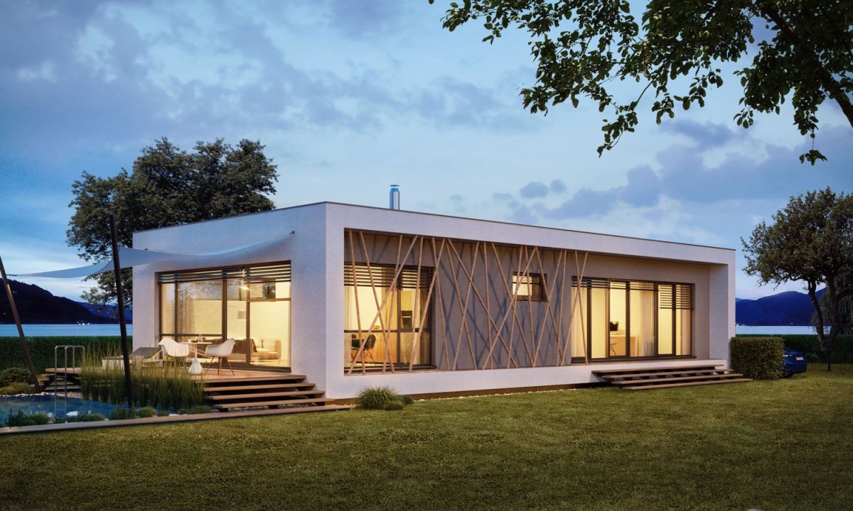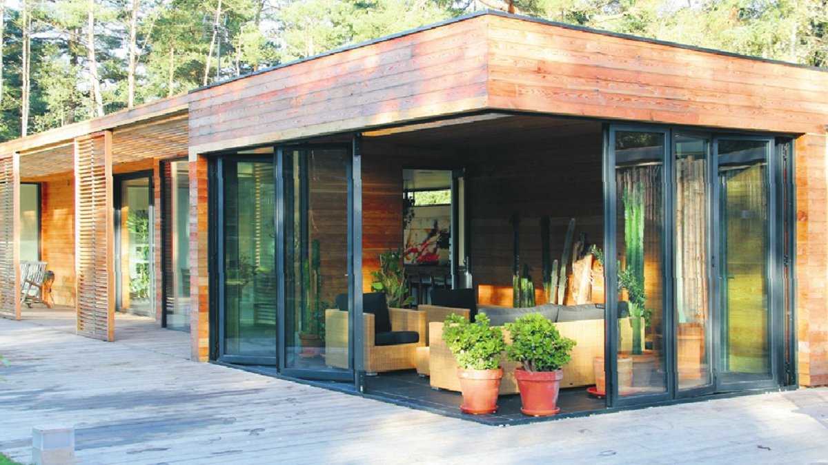 Одноэтажный деревянный дом с плоской крышей и панорамными окнами
