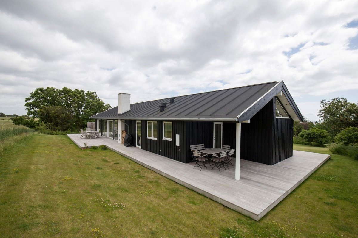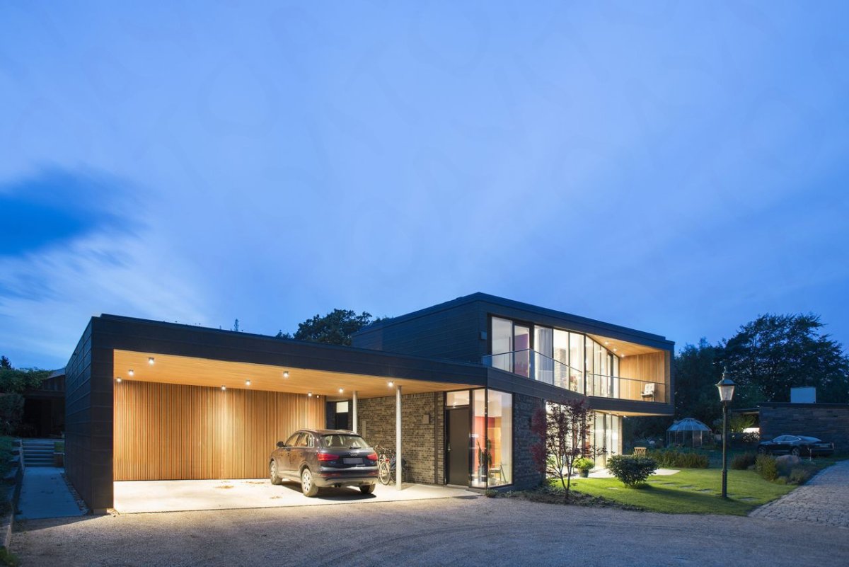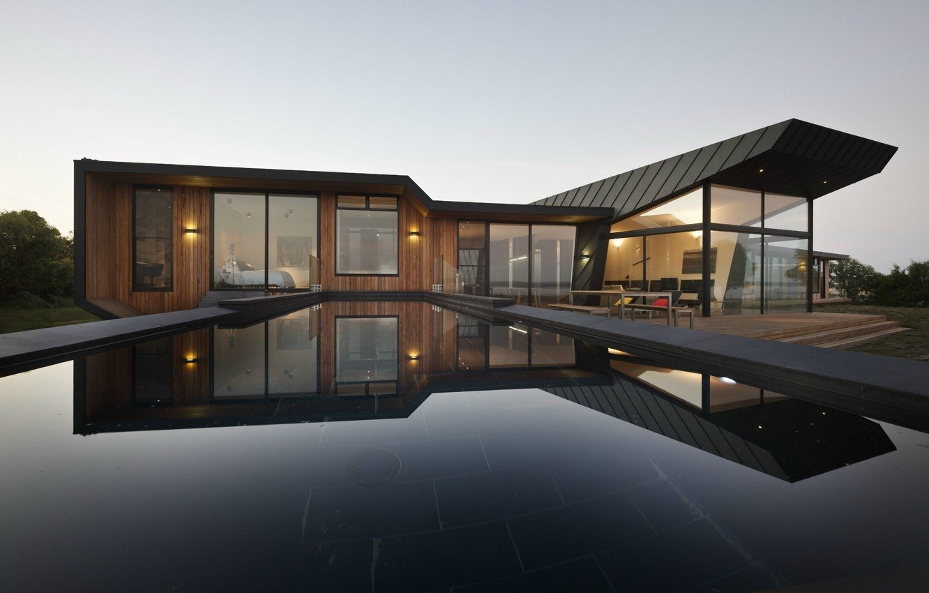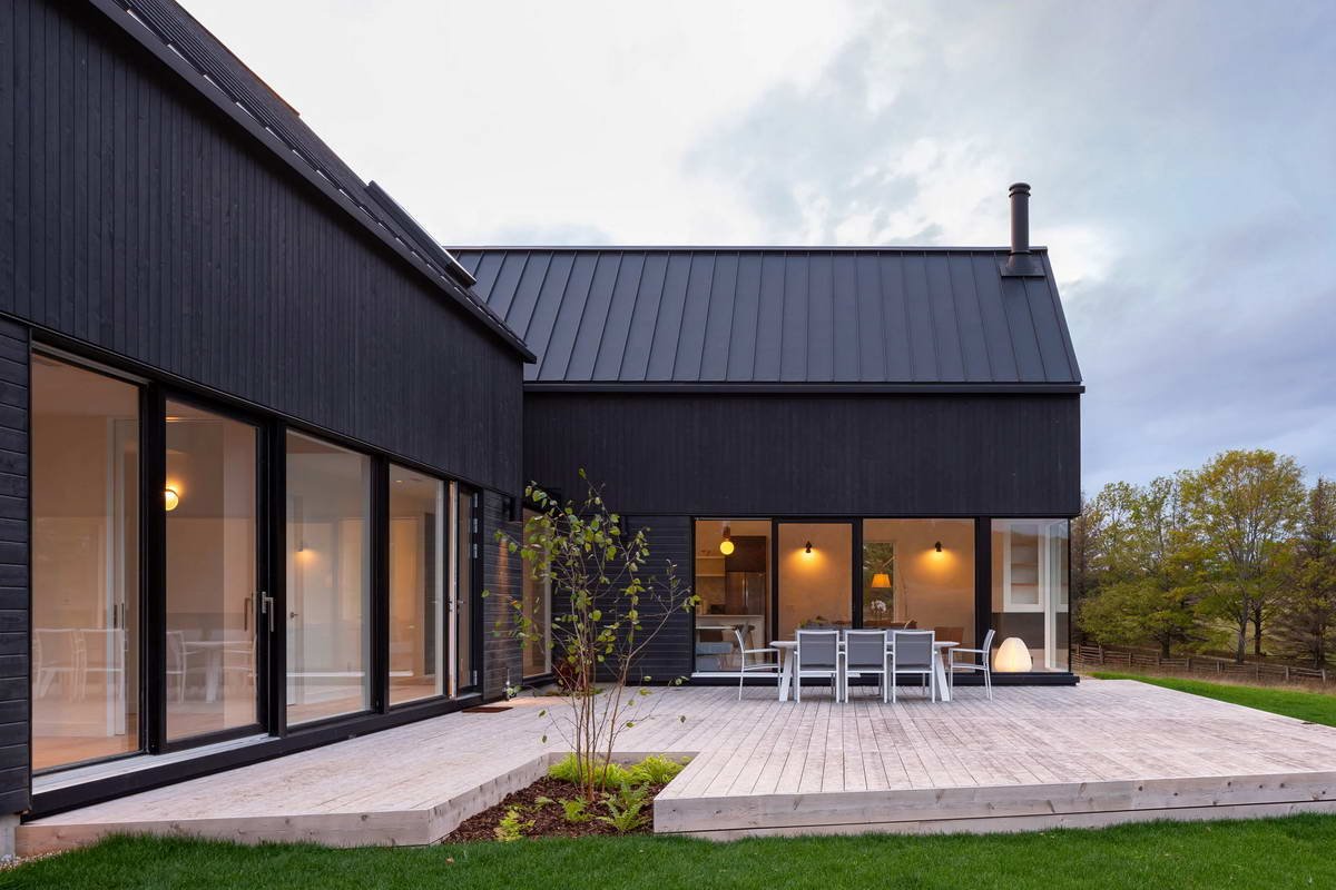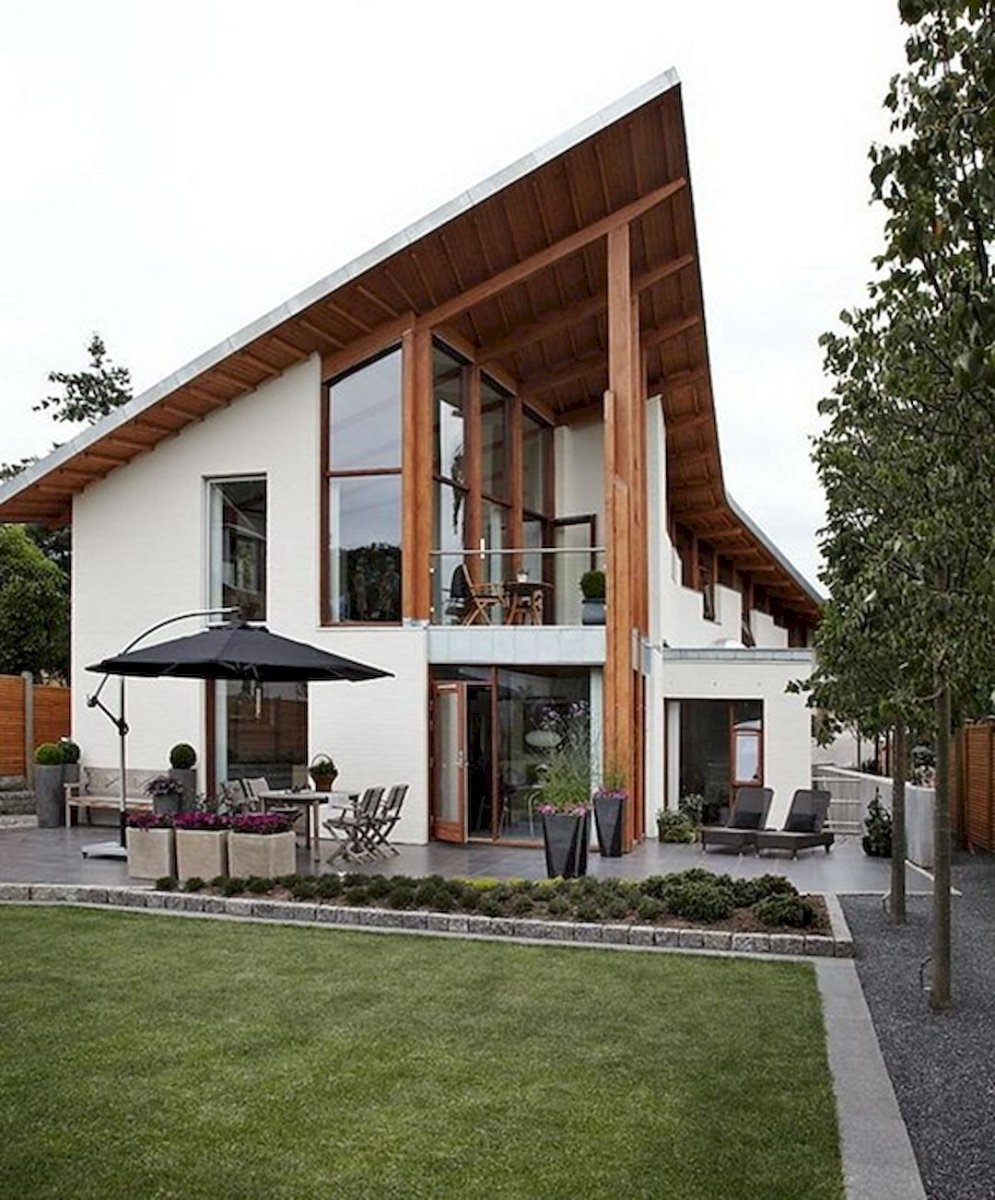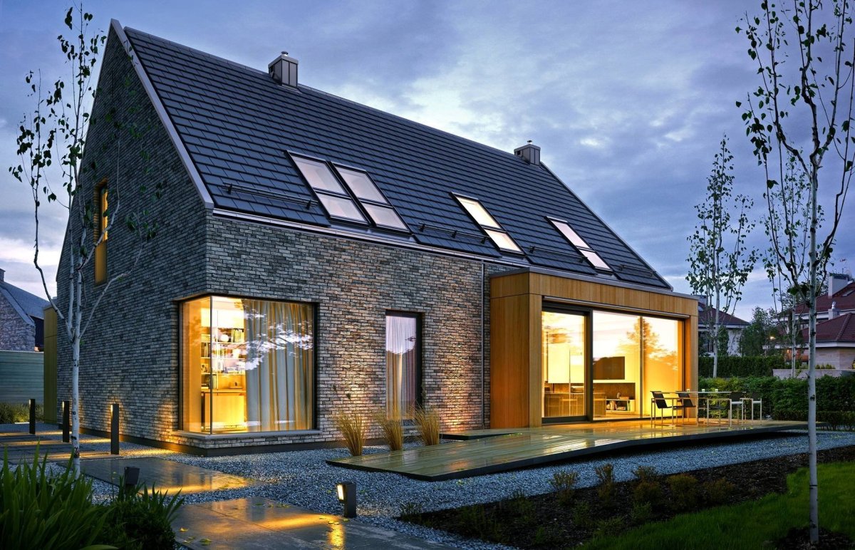Одноэтажный деревянный дом с плоской крышей и панорамными окнами