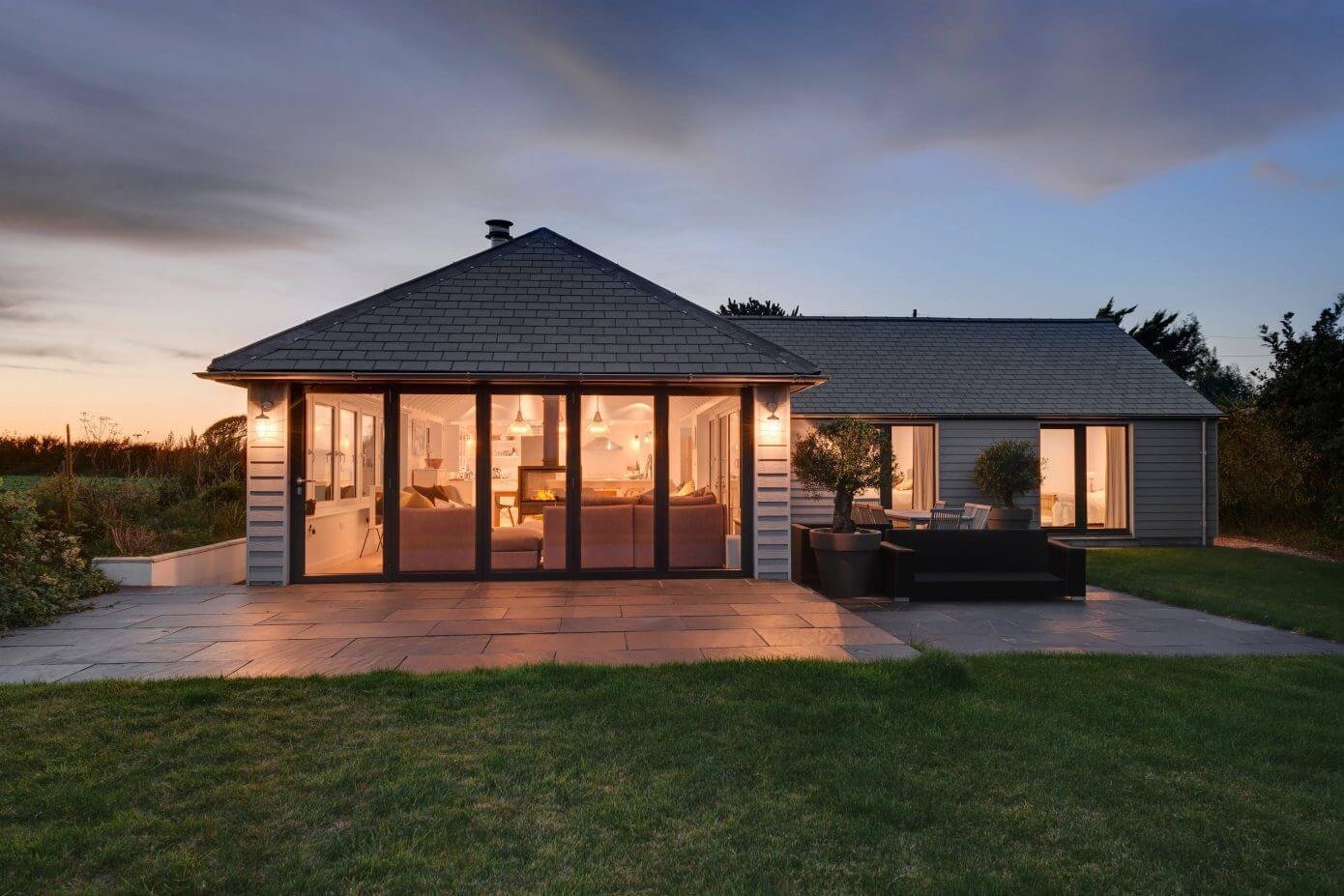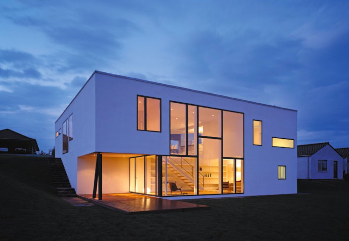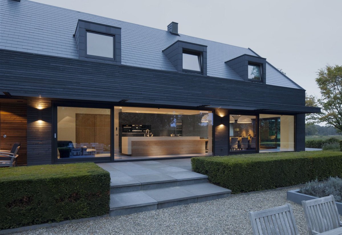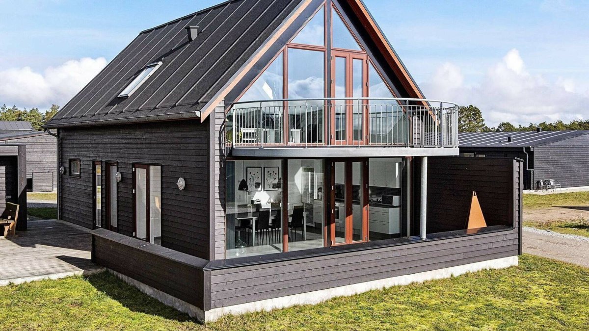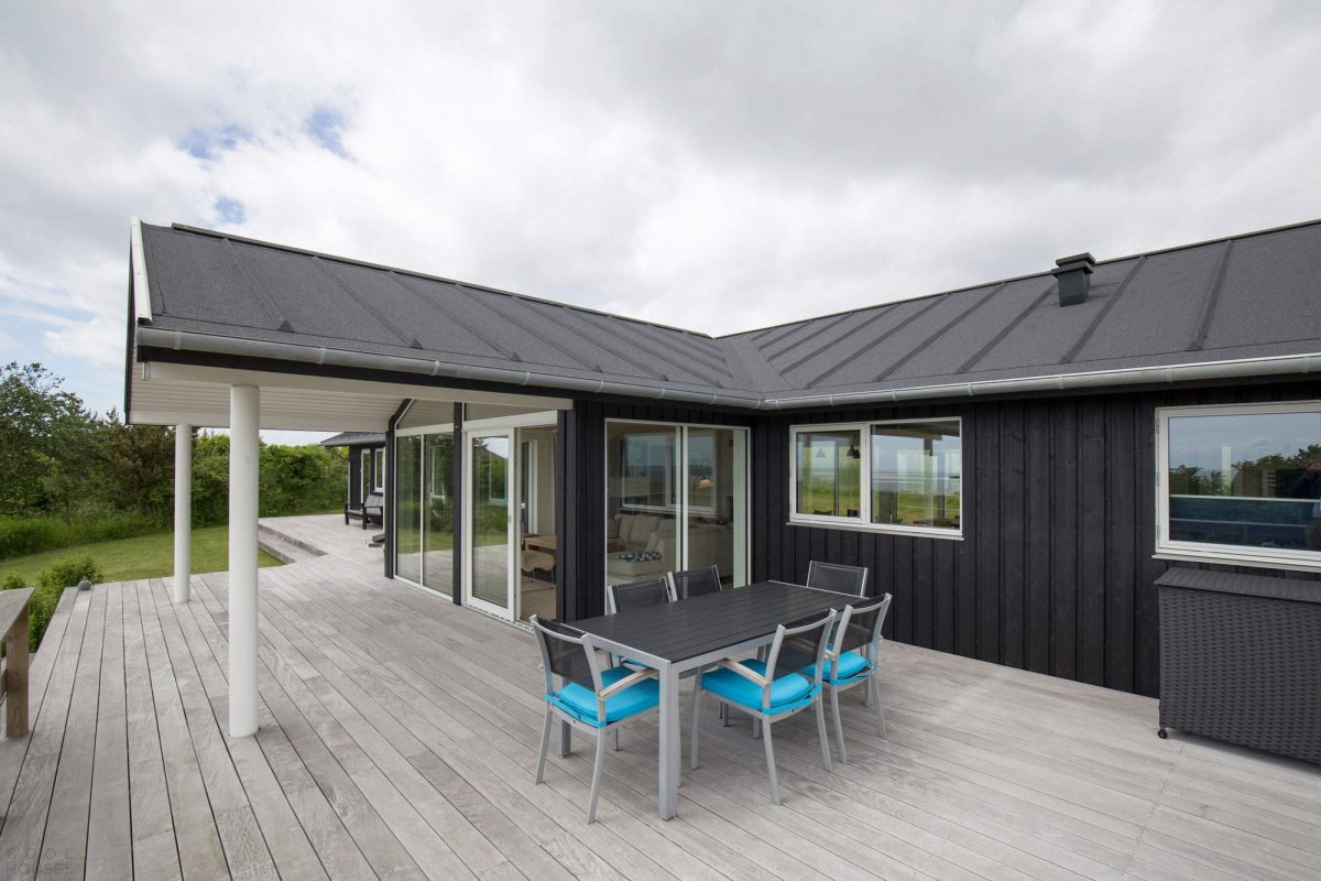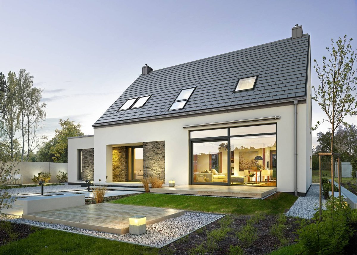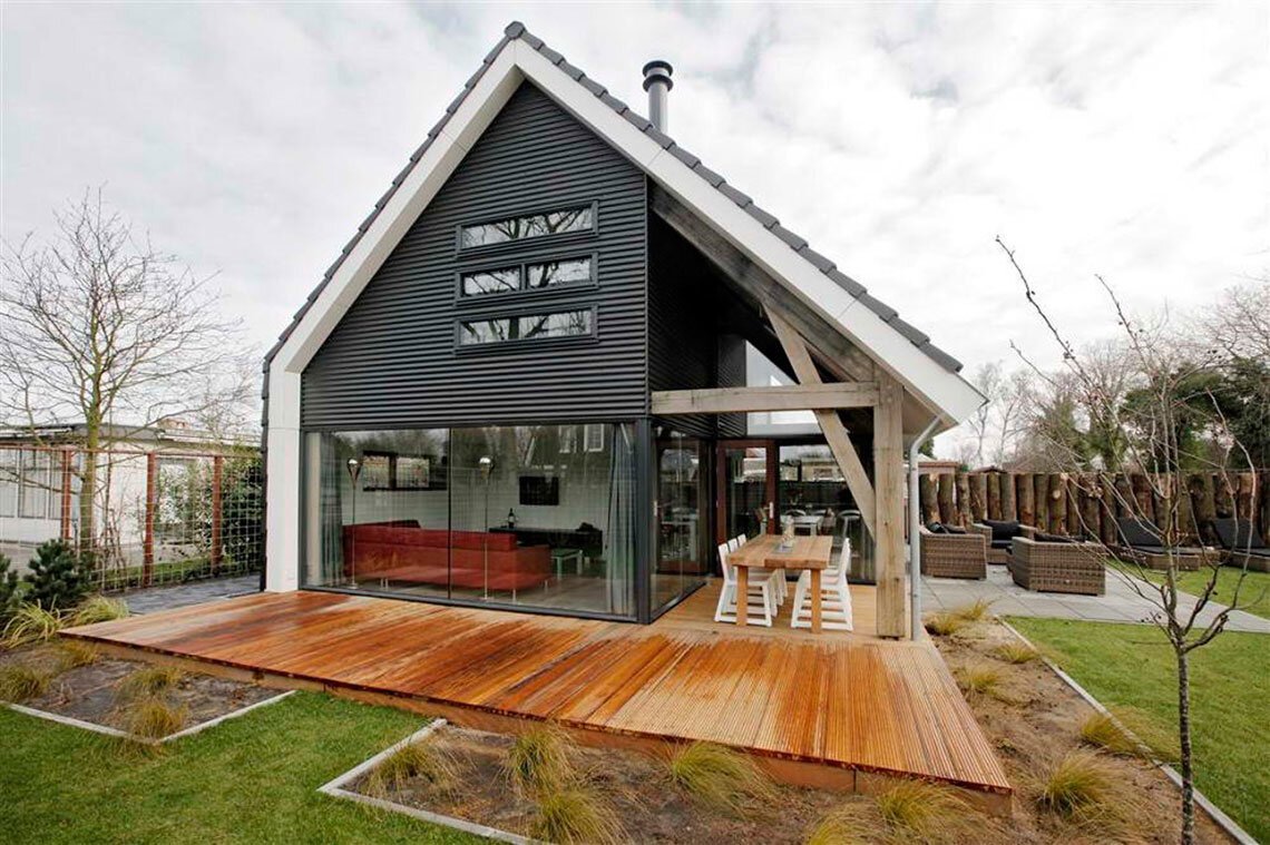 Одноэтажный деревянный дом с плоской крышей и панорамными окнами