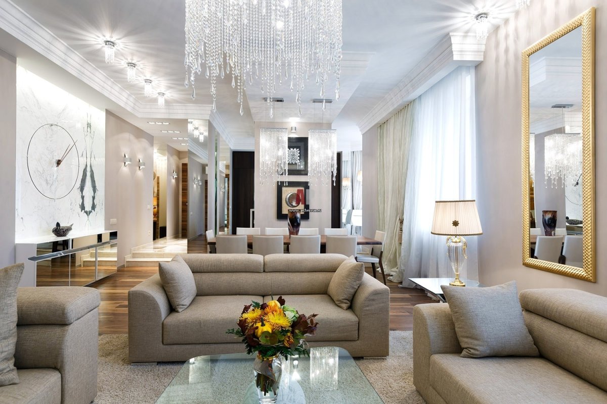 Хрустальная люстра в интерьере гостиной