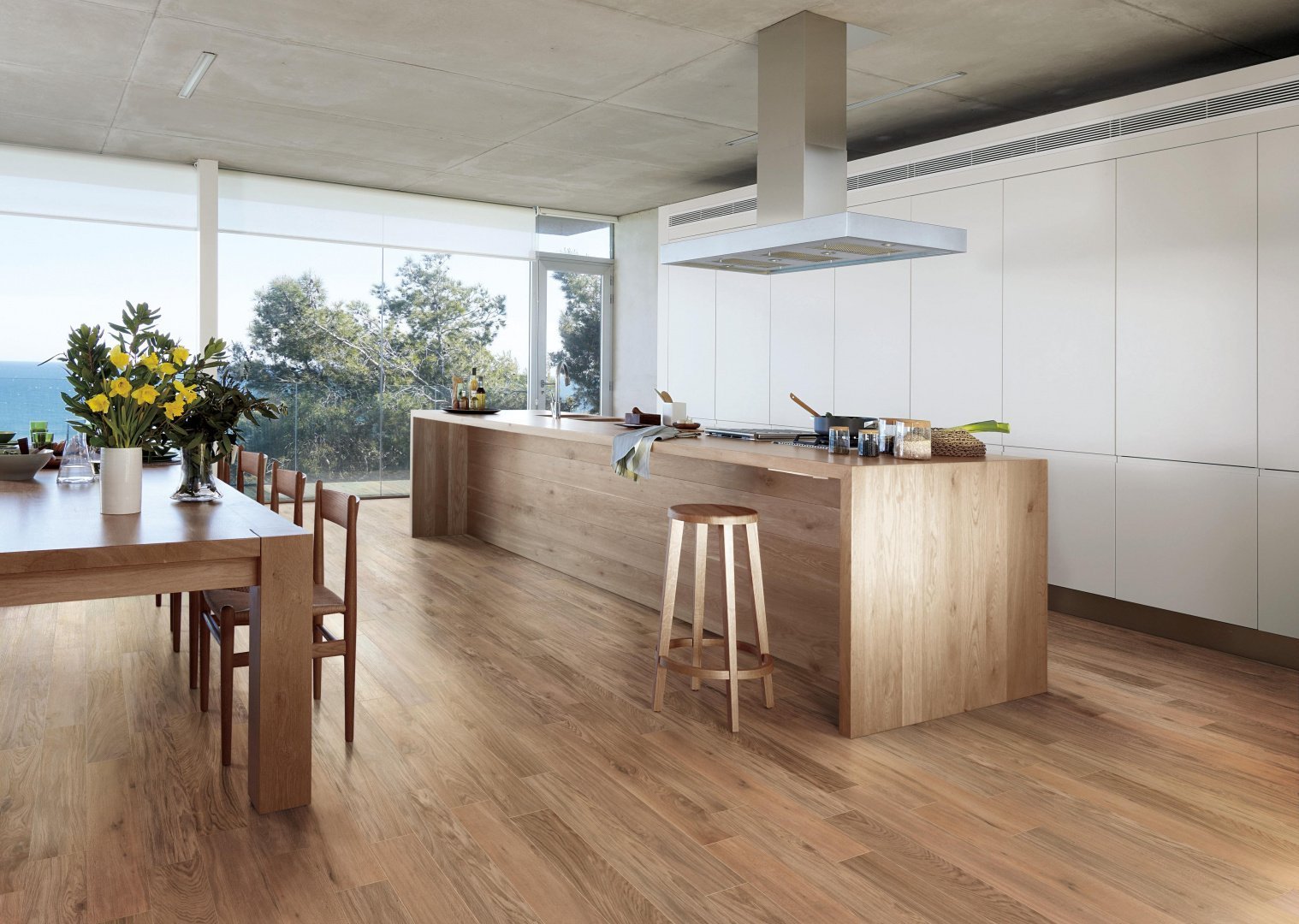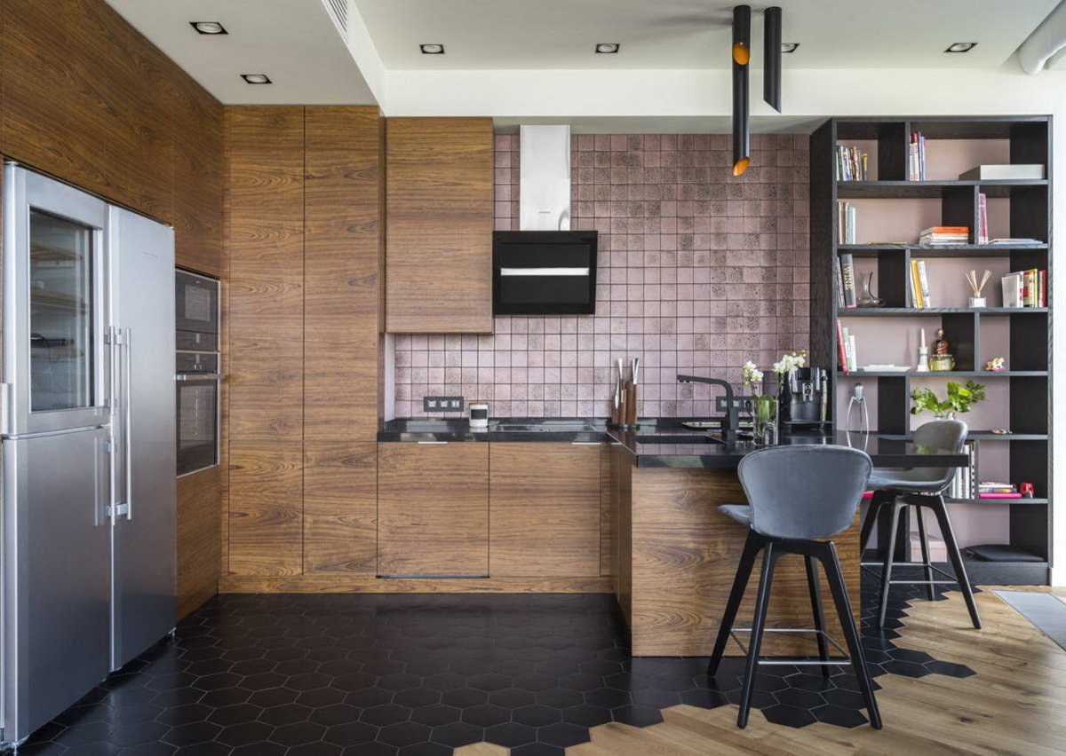 Плитка под дерево в кухне гостиной