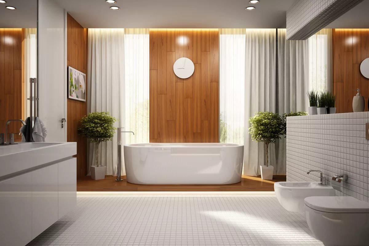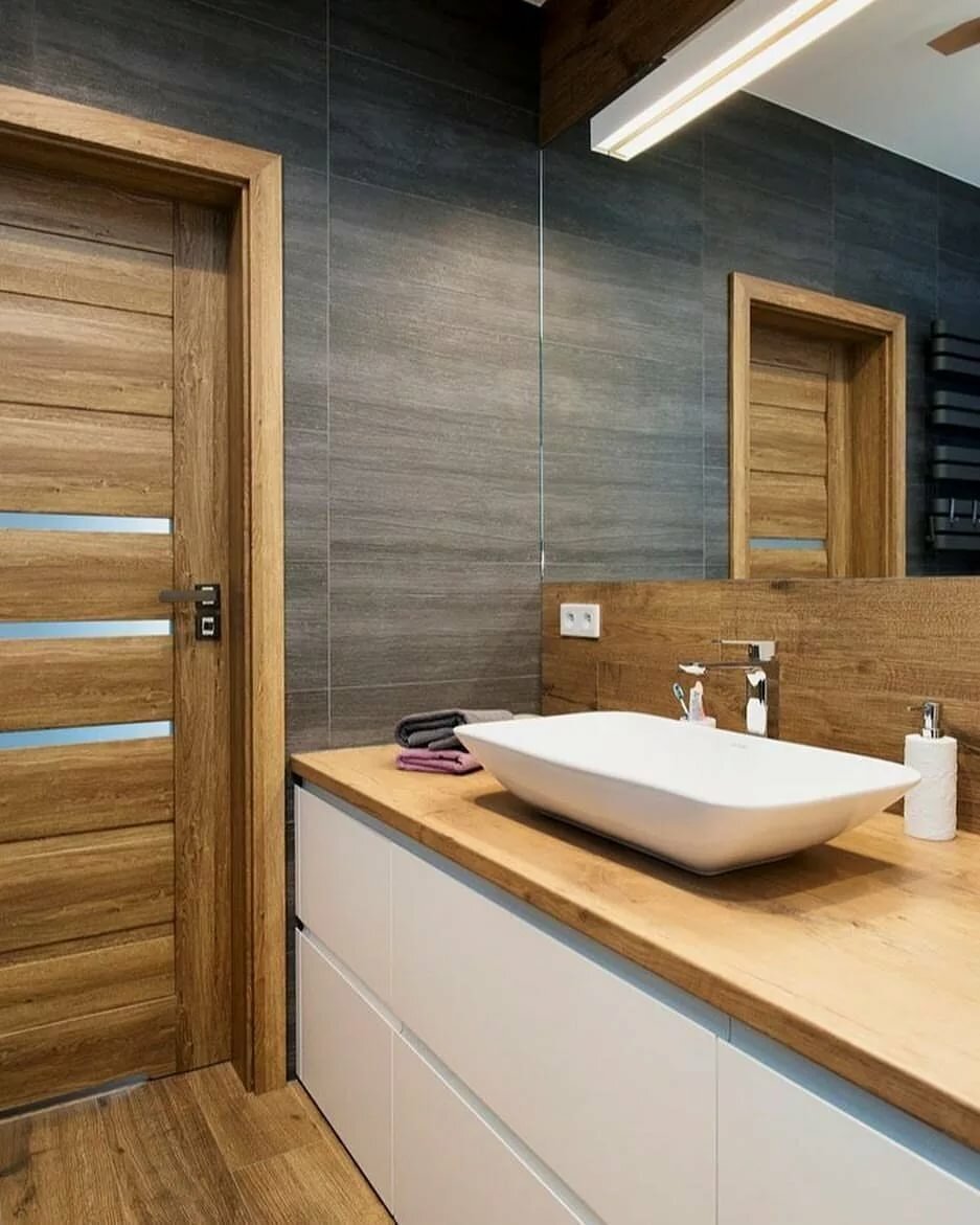 Дерево в интерьере ванной комнаты